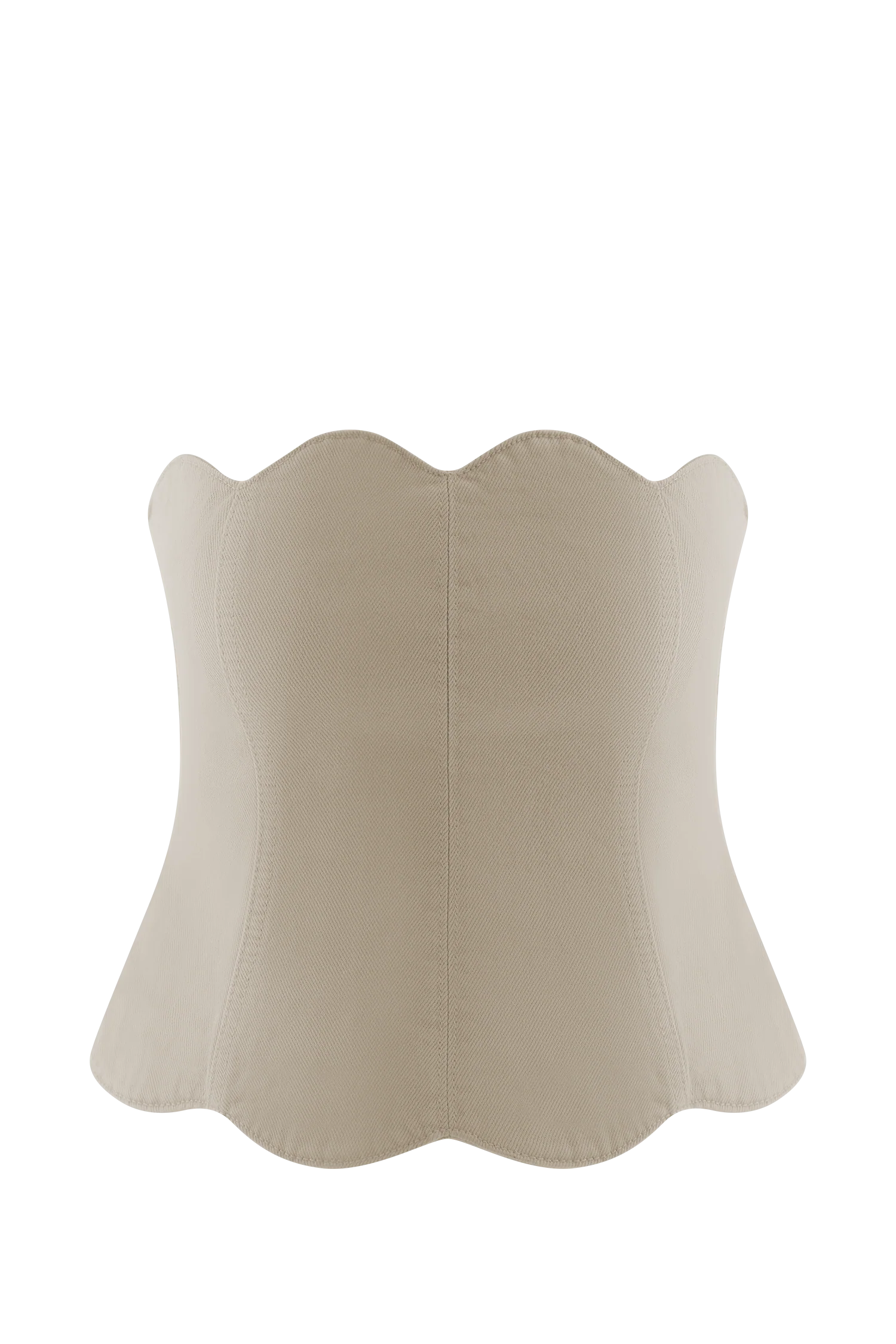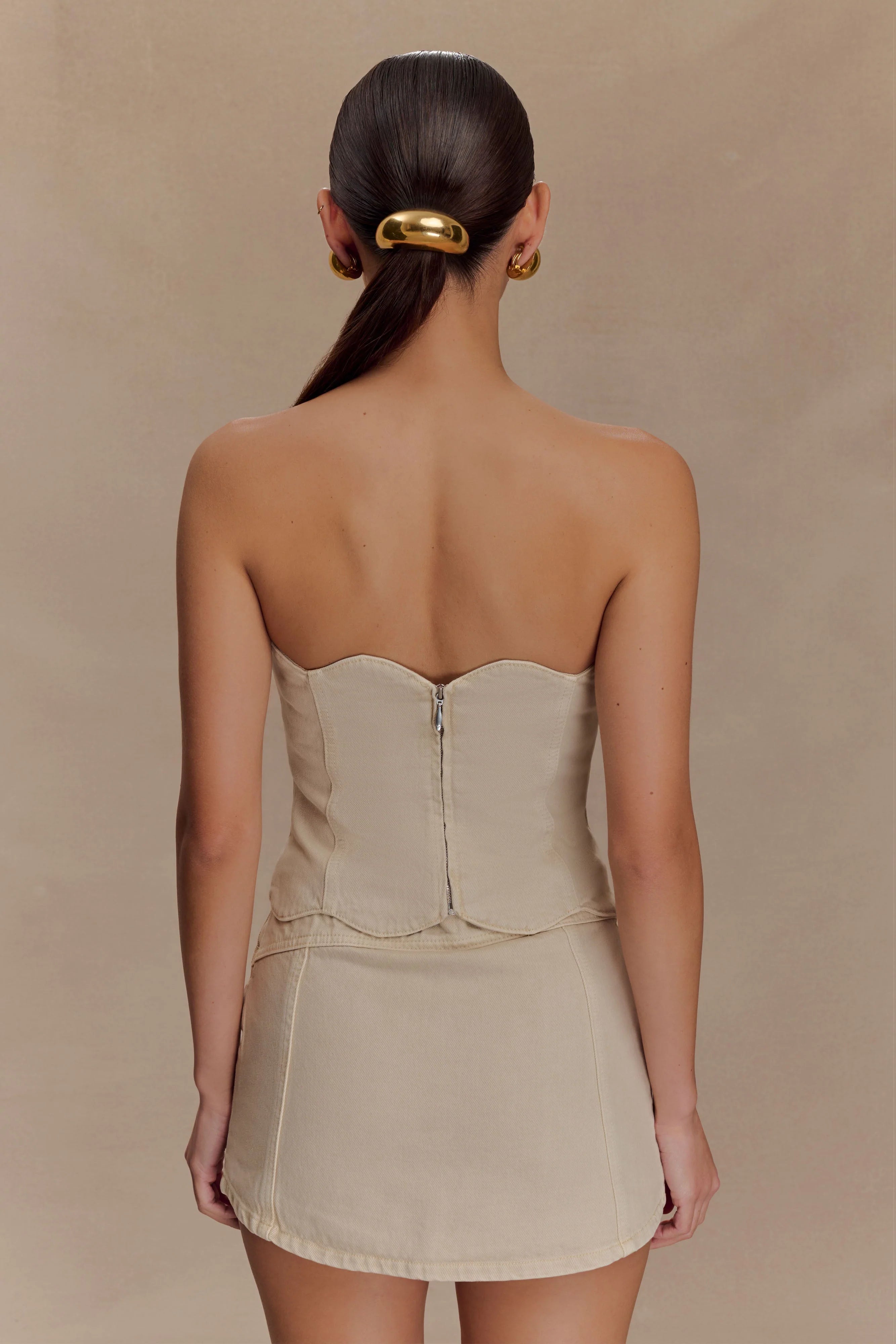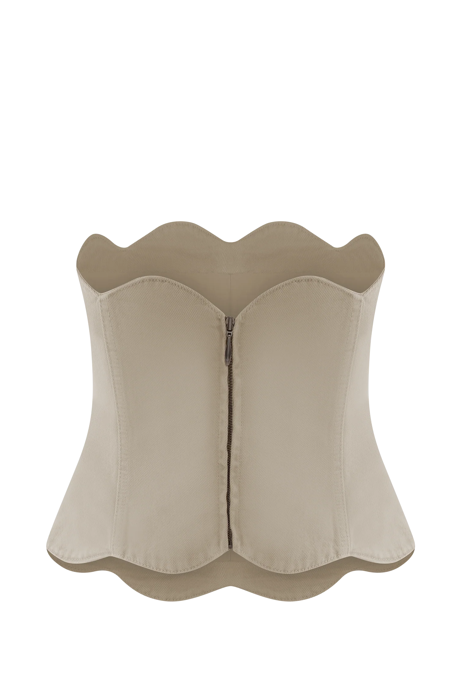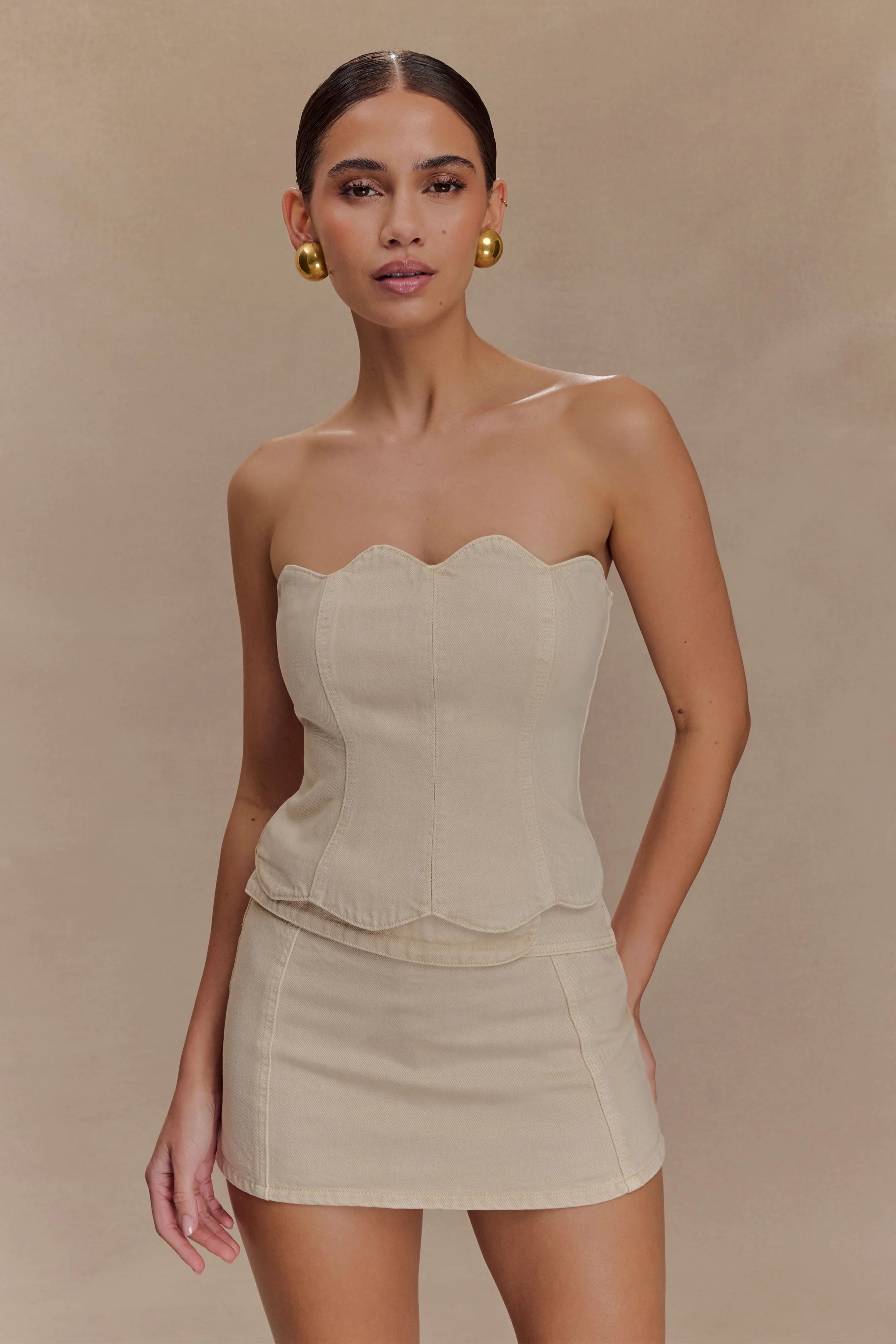 The OAKLEY Strapless Scallop Denim Top blends structured edge with soft detailing. Designed in a corset-style silhouette, this strapless top features panelled construction that contours the body for a flattering, supportive fit. The scalloped neckline adds a touch of femininity, balancing the boldness of the denim with refined detail. An exposed centre back zipper adds a modern finish, while the fitted shape makes it perfect for styling from day to night.