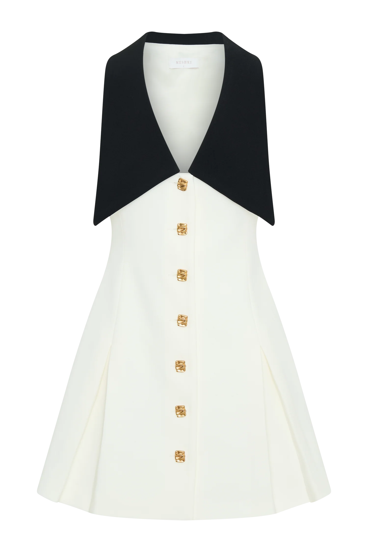 Step out in style with the OLI Sleeveless Contrast Mini Dress, a chic blend of timeless elegance and modern flair. Featuring a sharp collared neckline and button-front detail, this dress exudes polished charm. The flared pleated skirt adds movement and a playful touch, while the mini length keeps the look youthful and fresh. Decorative buttons and a striking black-and-white colorway with a contrasting collar elevate the design, making it perfect for any occasion. Whether for a daytime event or an evening out, this dress ensures you’ll always stand out in style.