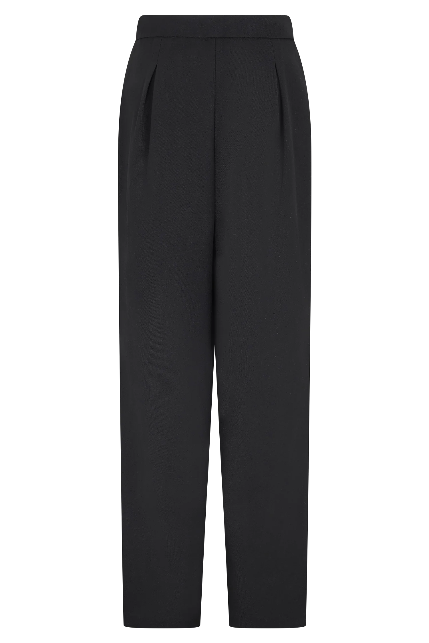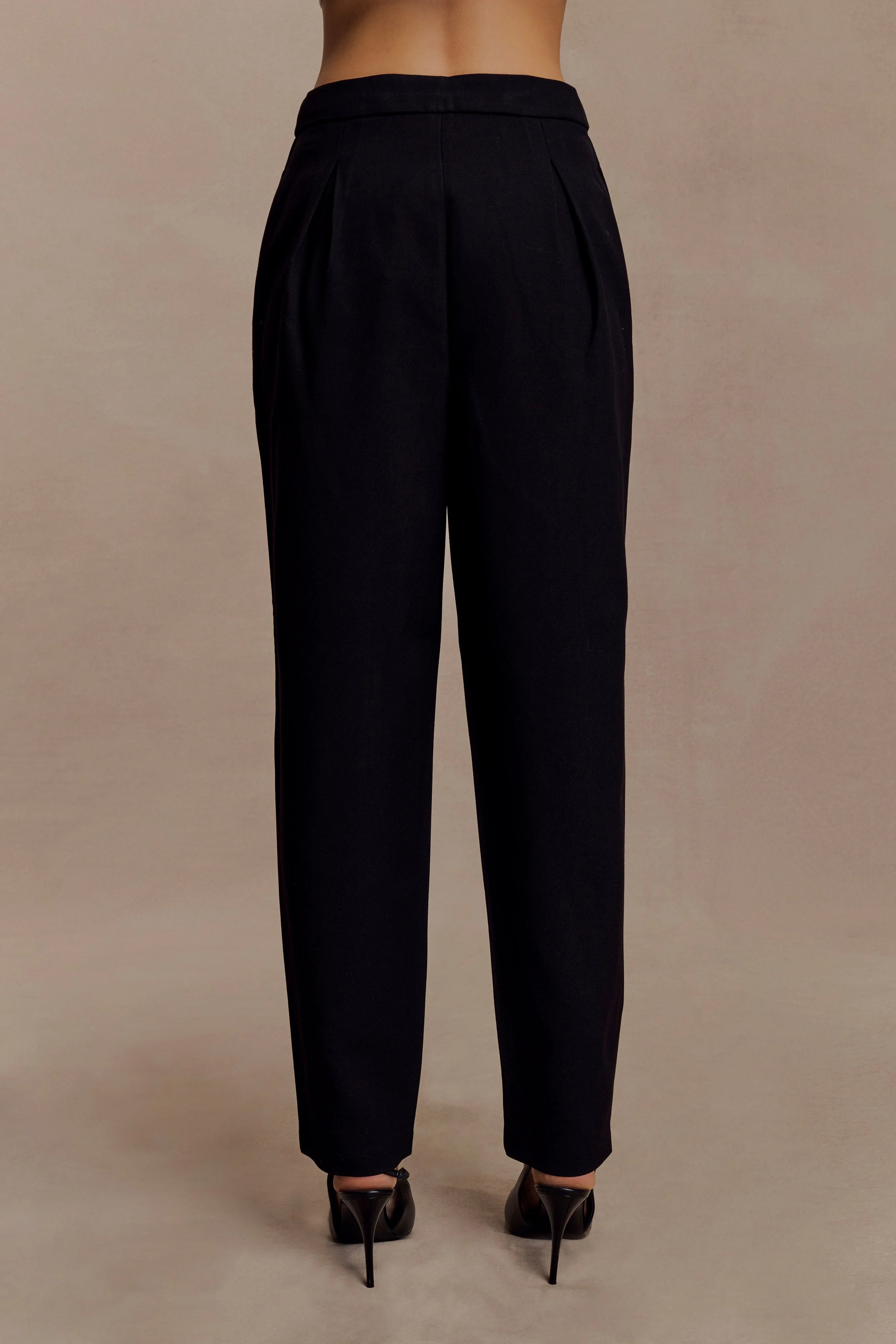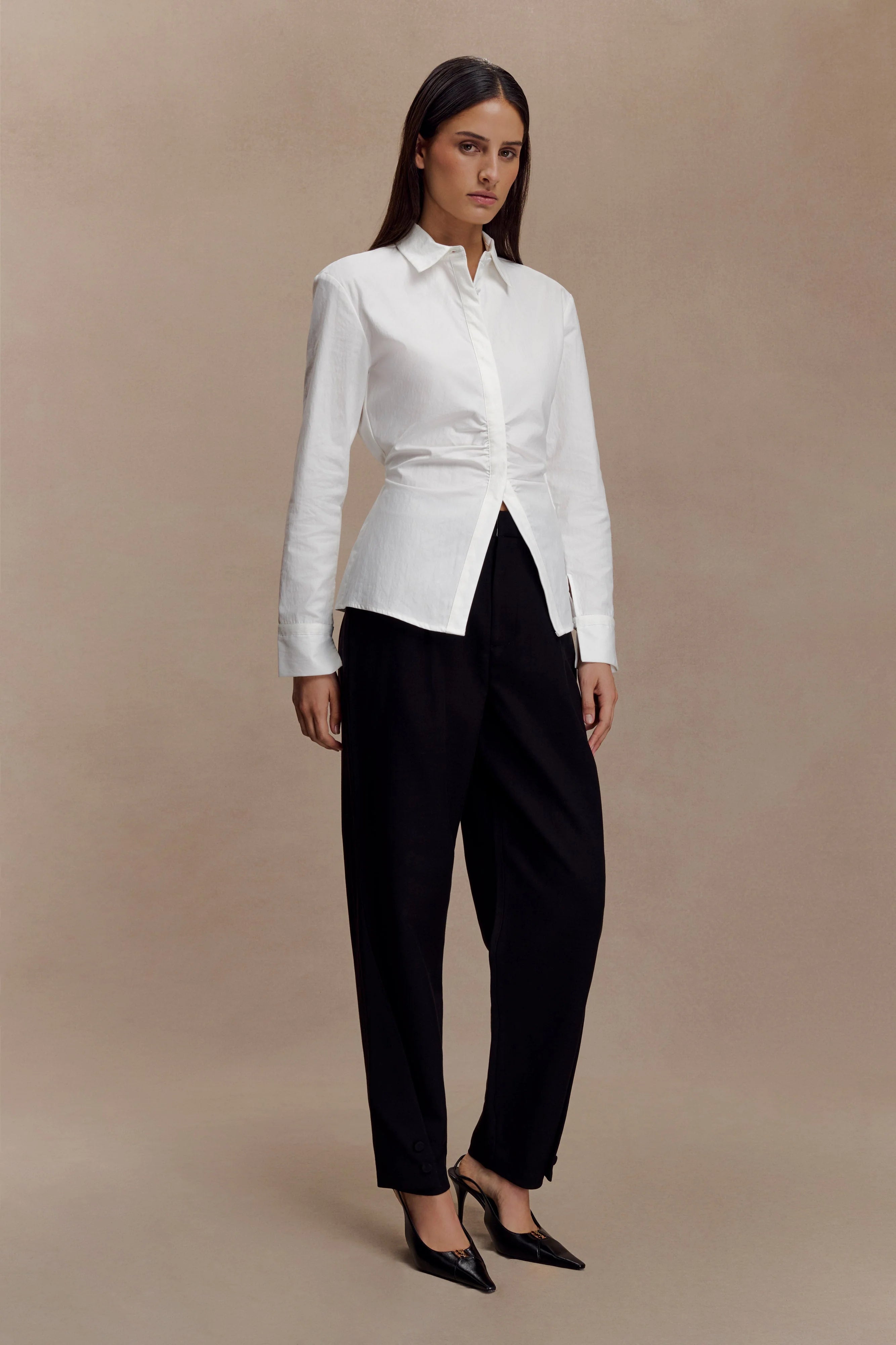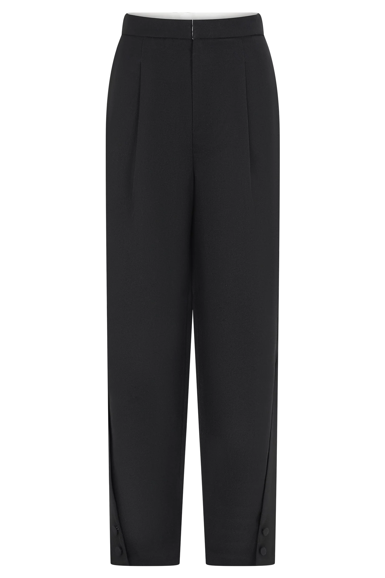 The OLIE Barrel Leg Suiting Pants bring directional shape to classic suiting. Designed with a mid-rise waist and curtain waistband construction, they feature front and back tucks that create structure through the hips before tapering into a curved barrel leg. Cross-over pleated and buttoned hems add a statement finish, while a full-length cut elongates the silhouette. Fully lined and completed with a front fly opening and internal hook-and-bar closure, these pants balance sculptural volume with refined tailoring.