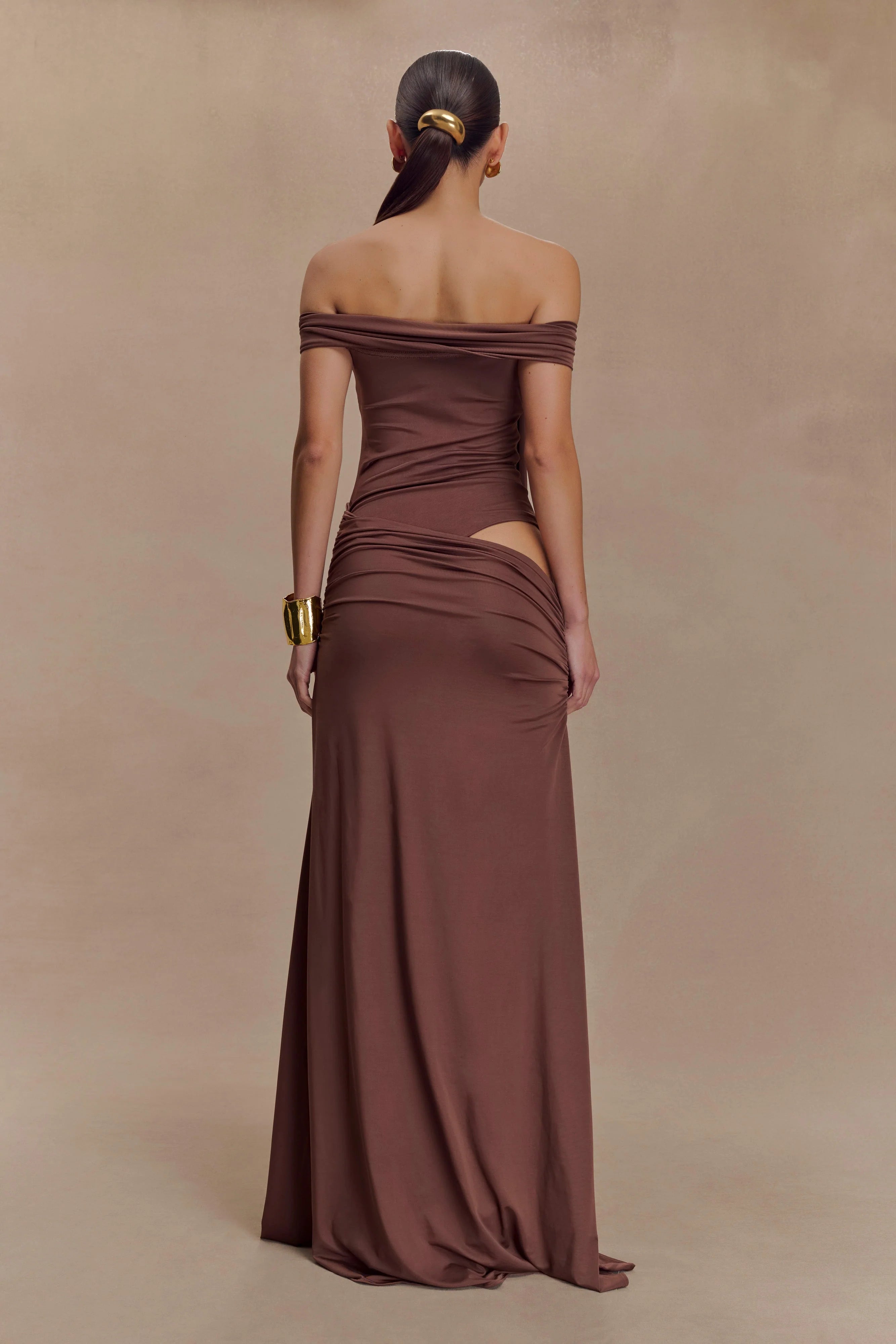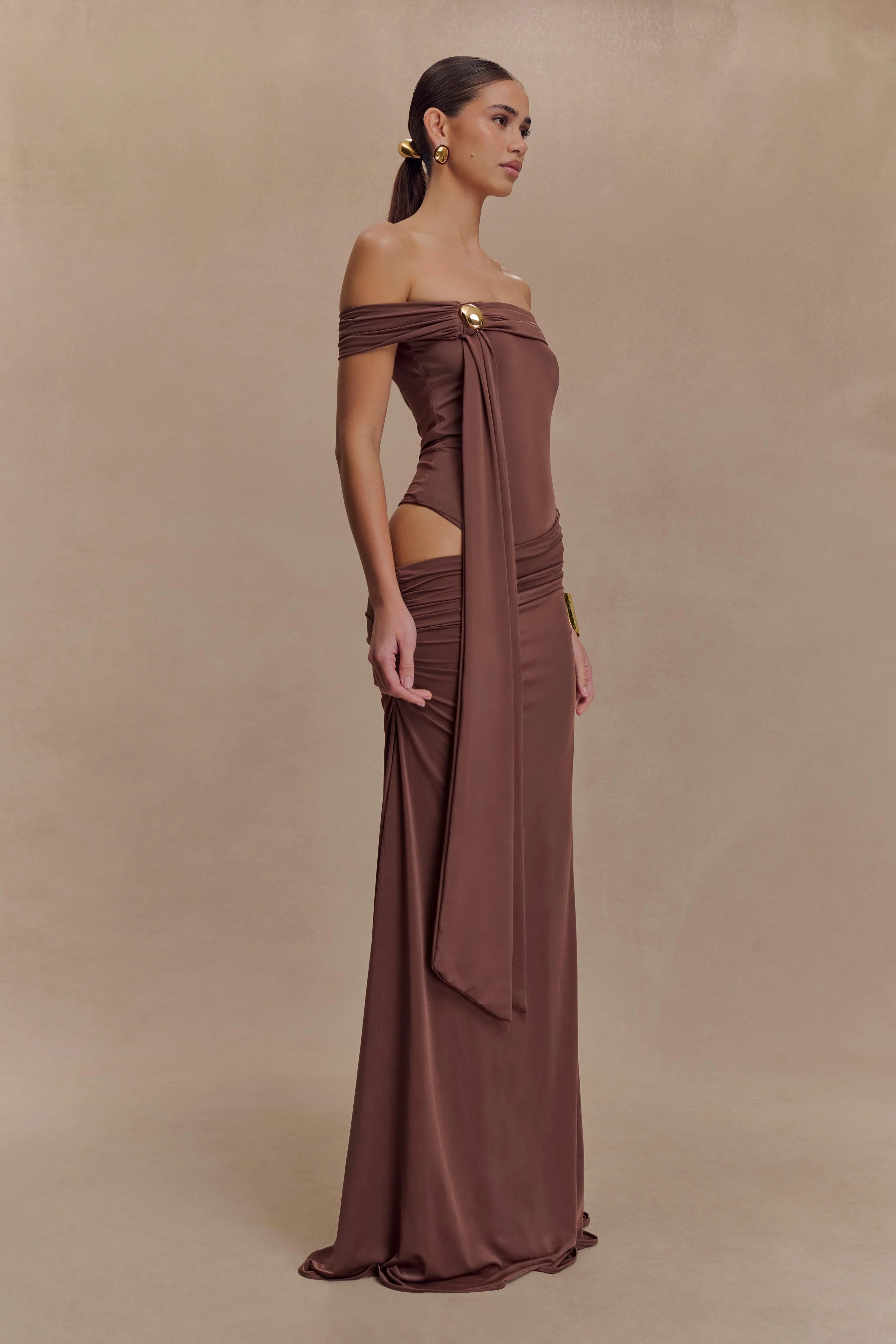 The OLIVER Slinky Maxi Dress is an elevated take on occasion dressing with just the right amount of edge. Designed with an off-the-shoulder neckline and gathered shoulder overlay, this silhouette flatters with a fitted bodice and soft A-line drape. Front hardware and sash detailing create a modern focal point, while the hip cutout and cascading skirt bring bold femininity to life. Finished in a slinky fabrication with a maxi length, this dress is your go-to for making an unforgettable entrance.