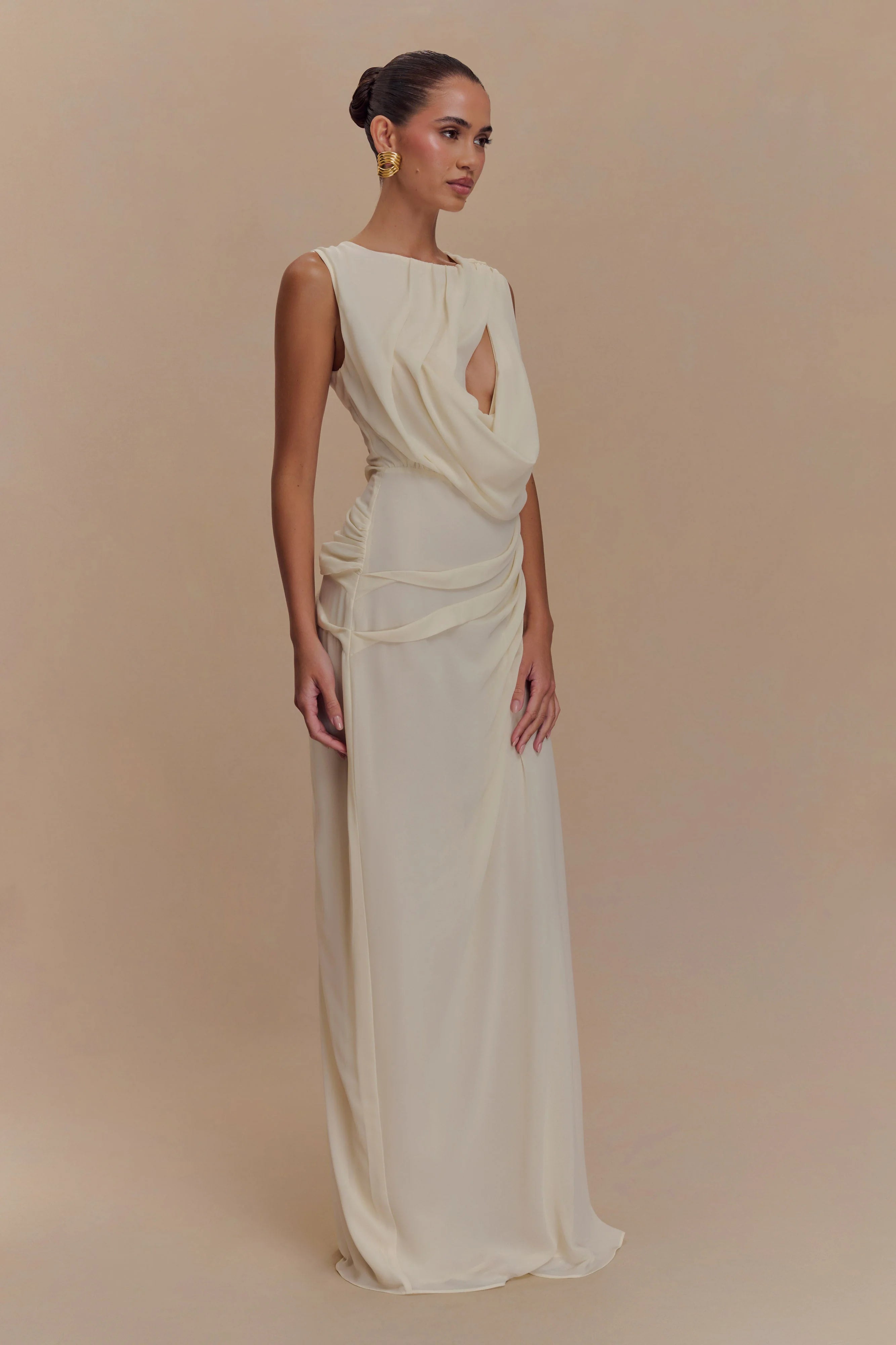 Make a statement in the ORIA Chiffon Maxi Dress, where ethereal design meets modern allure. This elegant piece features an asymmetrical neckline with a bold cutout and a draped neckline and waist detail that flatters your silhouette. The open back, secured by a delicate back neck tie, adds a touch of drama, while the flowing chiffon maxi skirt creates a graceful finish. Perfect for formal occasions or evening soirées, this dress ensures you captivate from every angle.