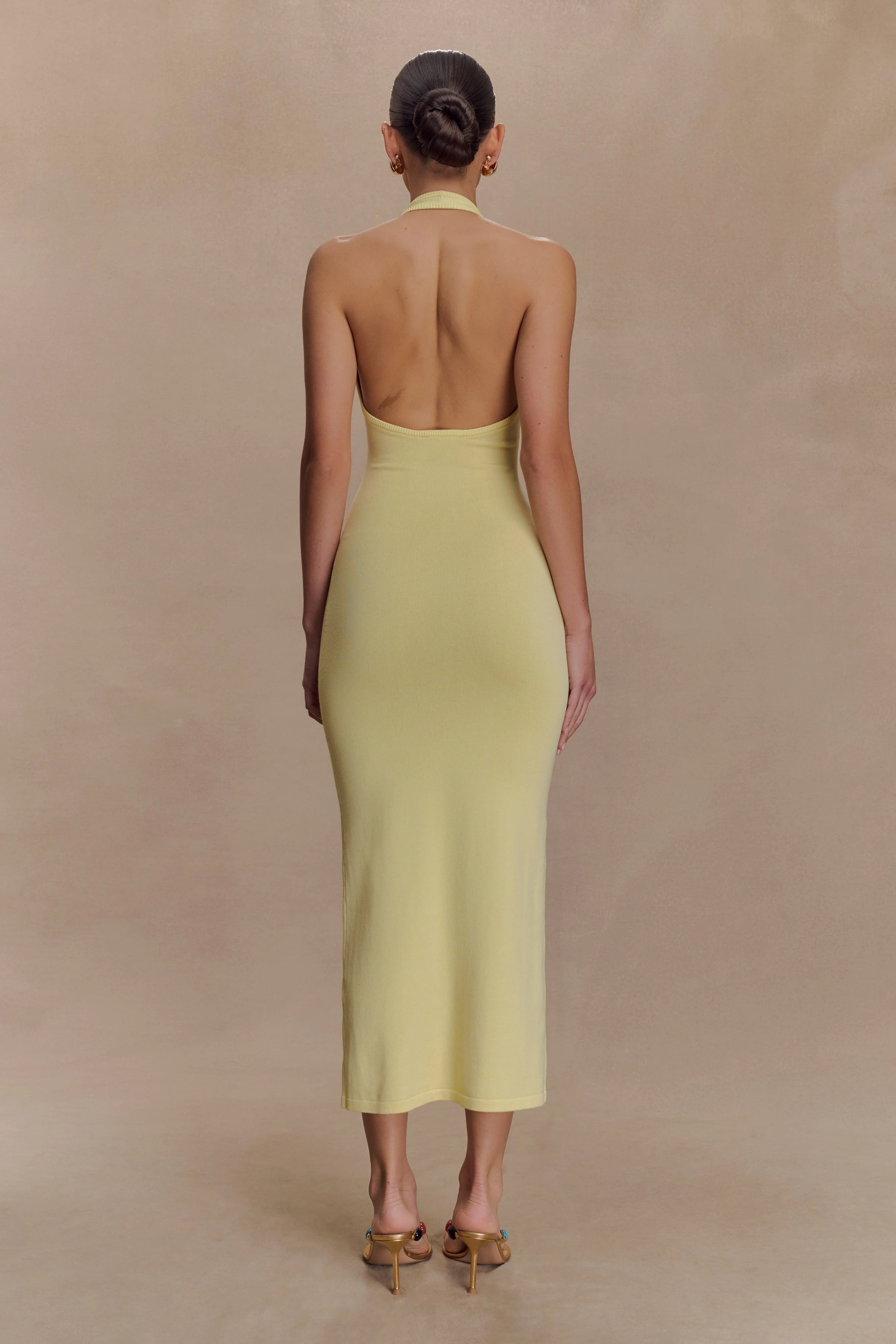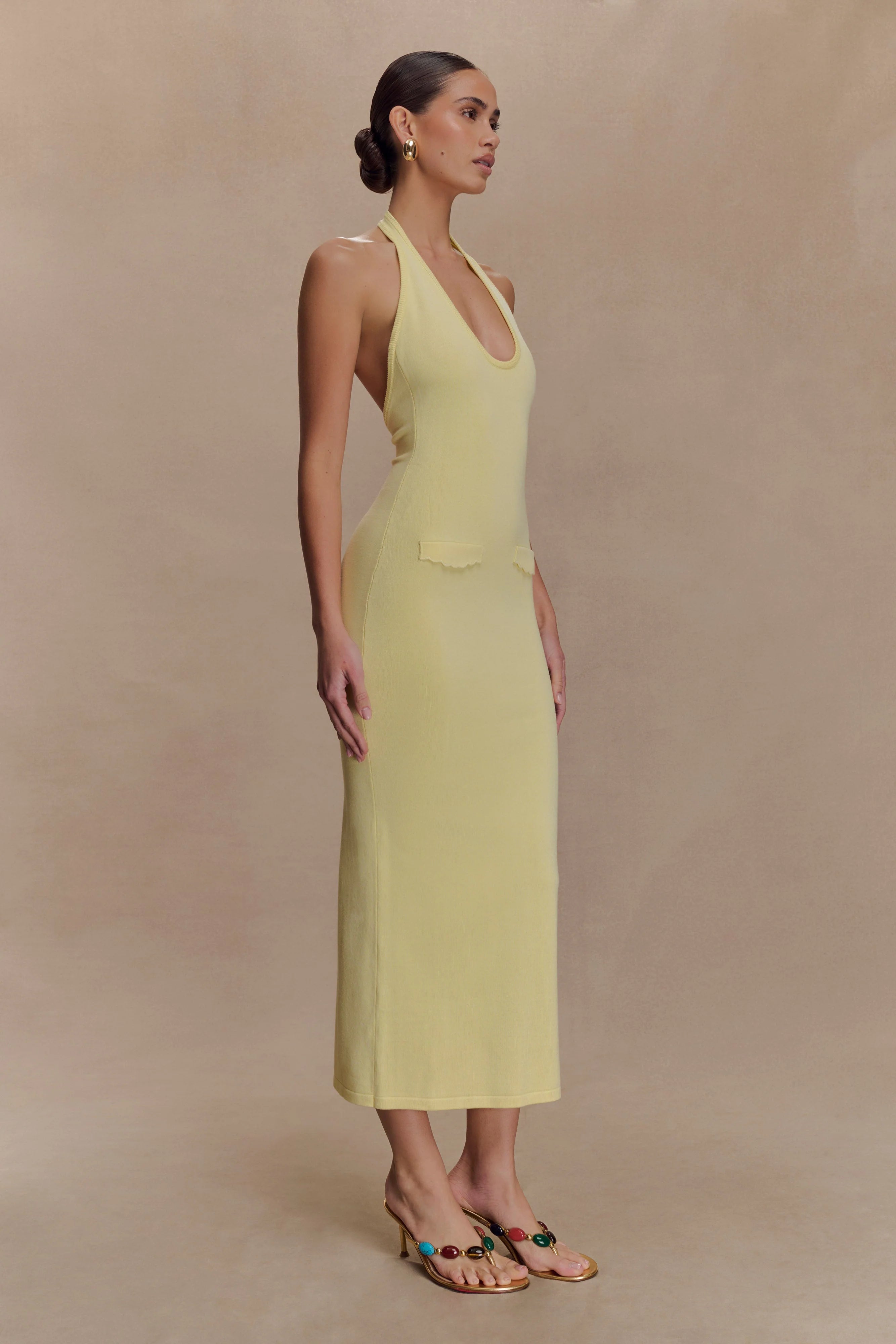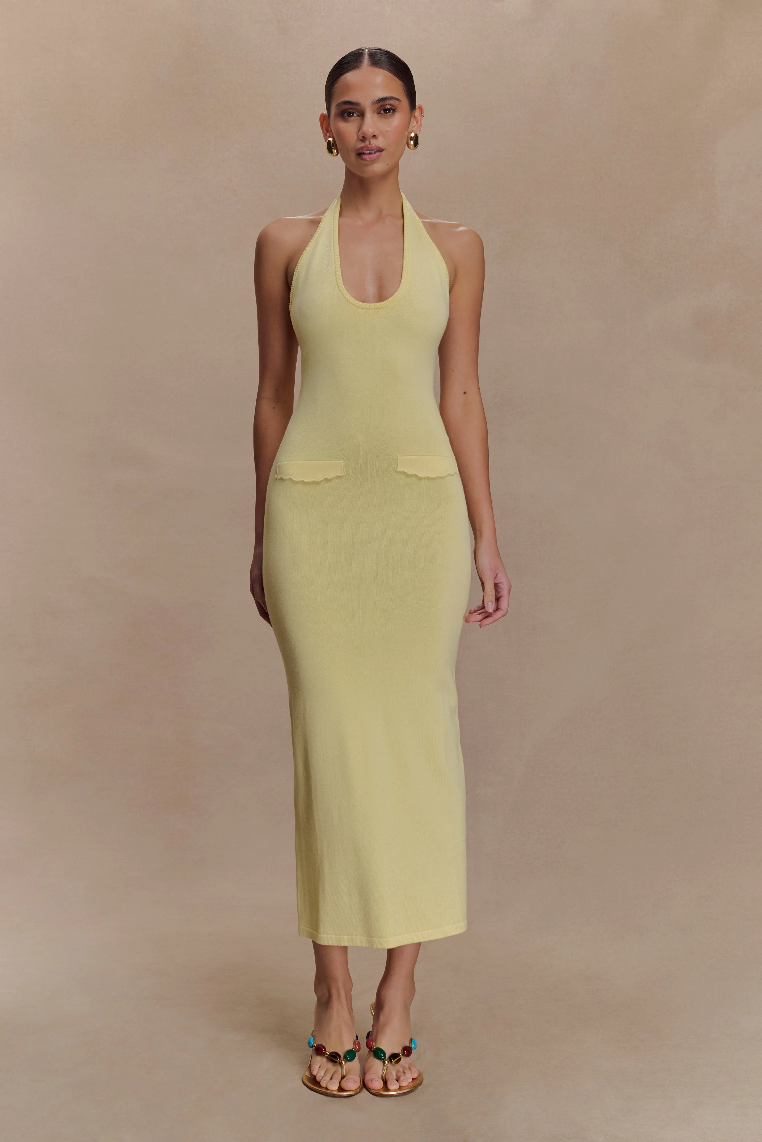The OVINA Halter Neck Knit Midi Dress brings playful polish to elevated dressing. Designed with a scoop neck and halter neckline, this fitted silhouette features an open back for a touch of allure. Mock front pockets and delicate embroidery add visual interest, while the scalloped hemline offers a refined finish. Crafted in an unlined knit, this dress moves with you.