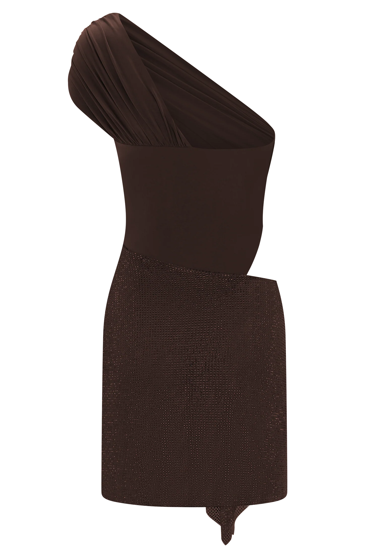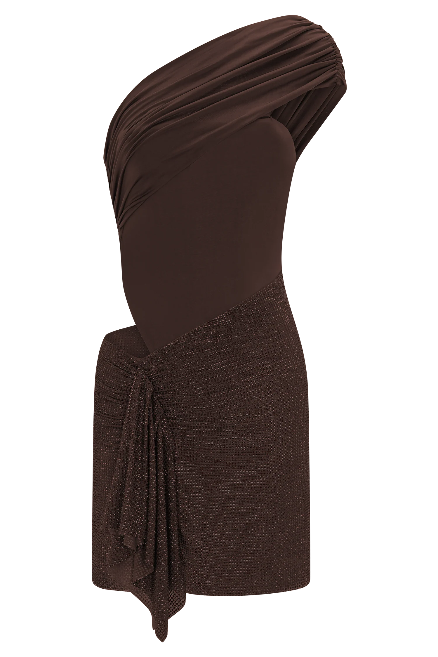 The PAISLEY Slinky And Diamante Mini Dress is a statement silhouette that blends sleek minimalism with refined sparkle. Featuring an asymmetric neckline and a daring cut-out detail, it’s designed to contour the body in a flattering, bodycon fit. The diamante embellishment along the skirt adds subtle shine, while the internal bodysuit with snap-button closure ensures comfort and a seamless finish. Partially lined for balance and ease, this dress redefines after-dark elegance with a bold, modern edge.