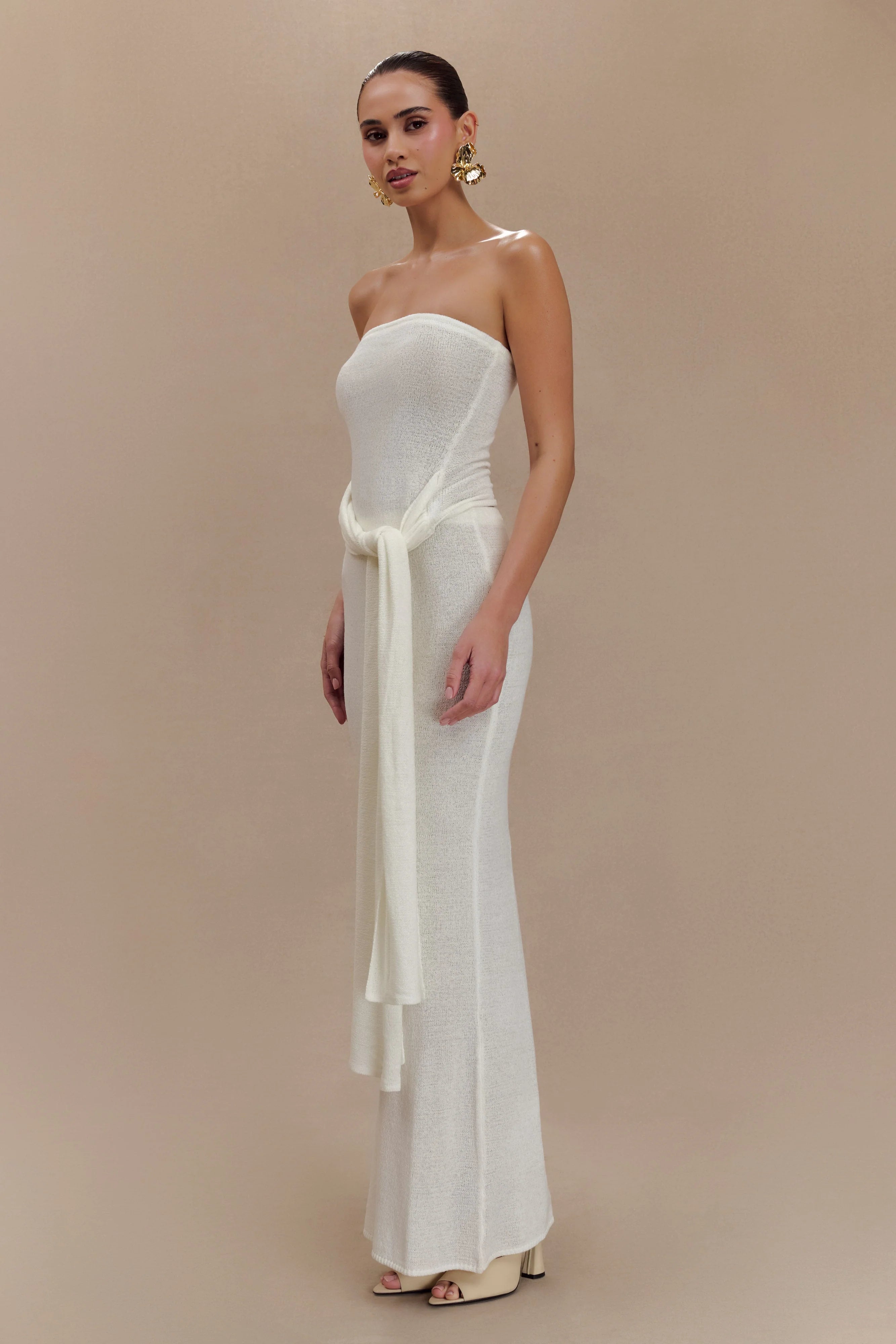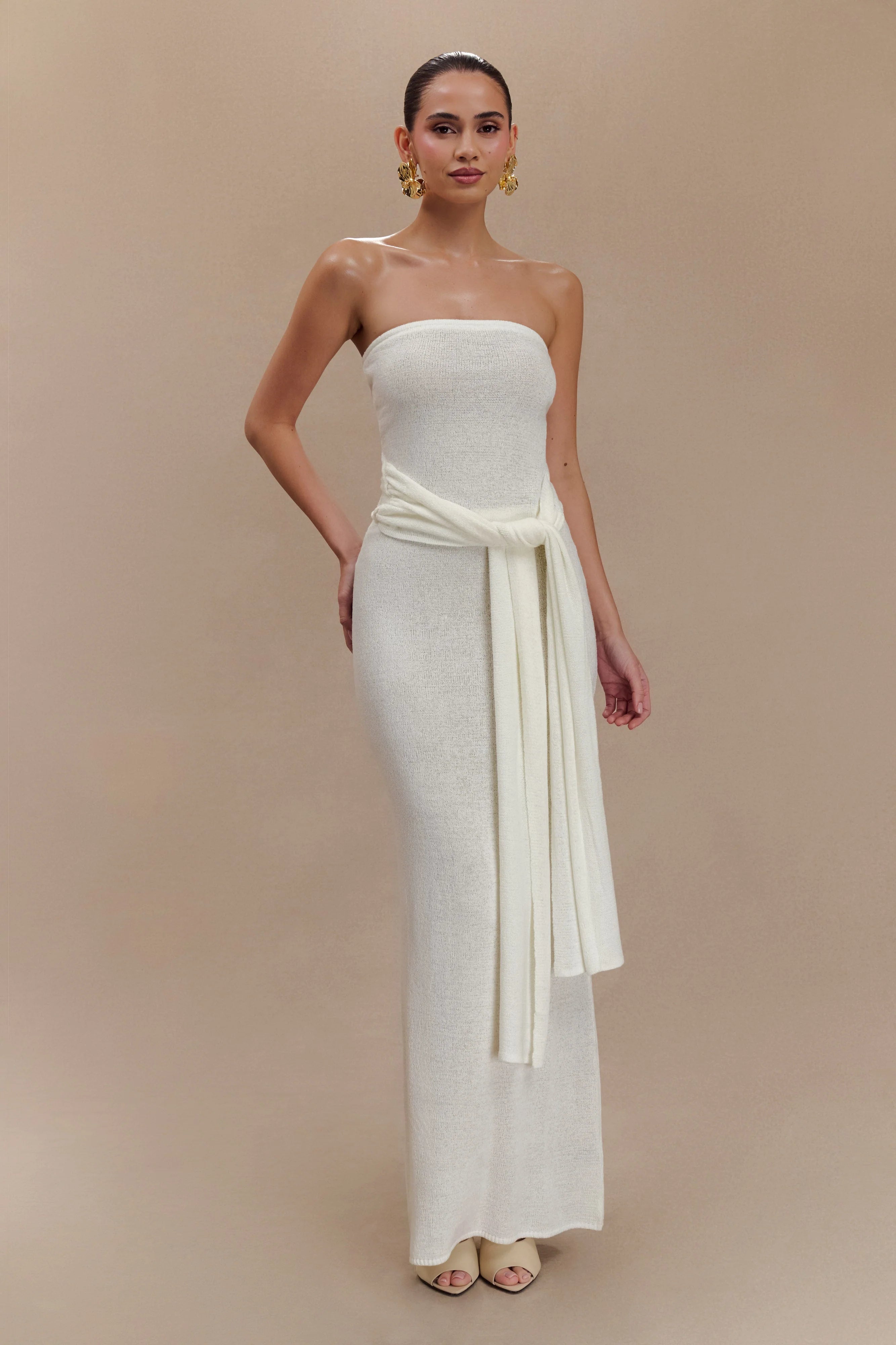 Elevate your style with the PHOEBE Strapless Tie Knit Top, a perfect blend of modern elegance and playful sophistication. This top features a comfortable strapless design with an elastic bust, ensuring a secure fit that flatters your figure. The eye-catching sash tie detail at the hip adds a chic focal point while enhancing your silhouette. Crafted with soft knit fabric and mesh lining, this top offers both comfort and breathability, making it ideal for any occasion. Pair it with the for a coordinated ensemble that seamlessly combines effortless style with contemporary charm.
