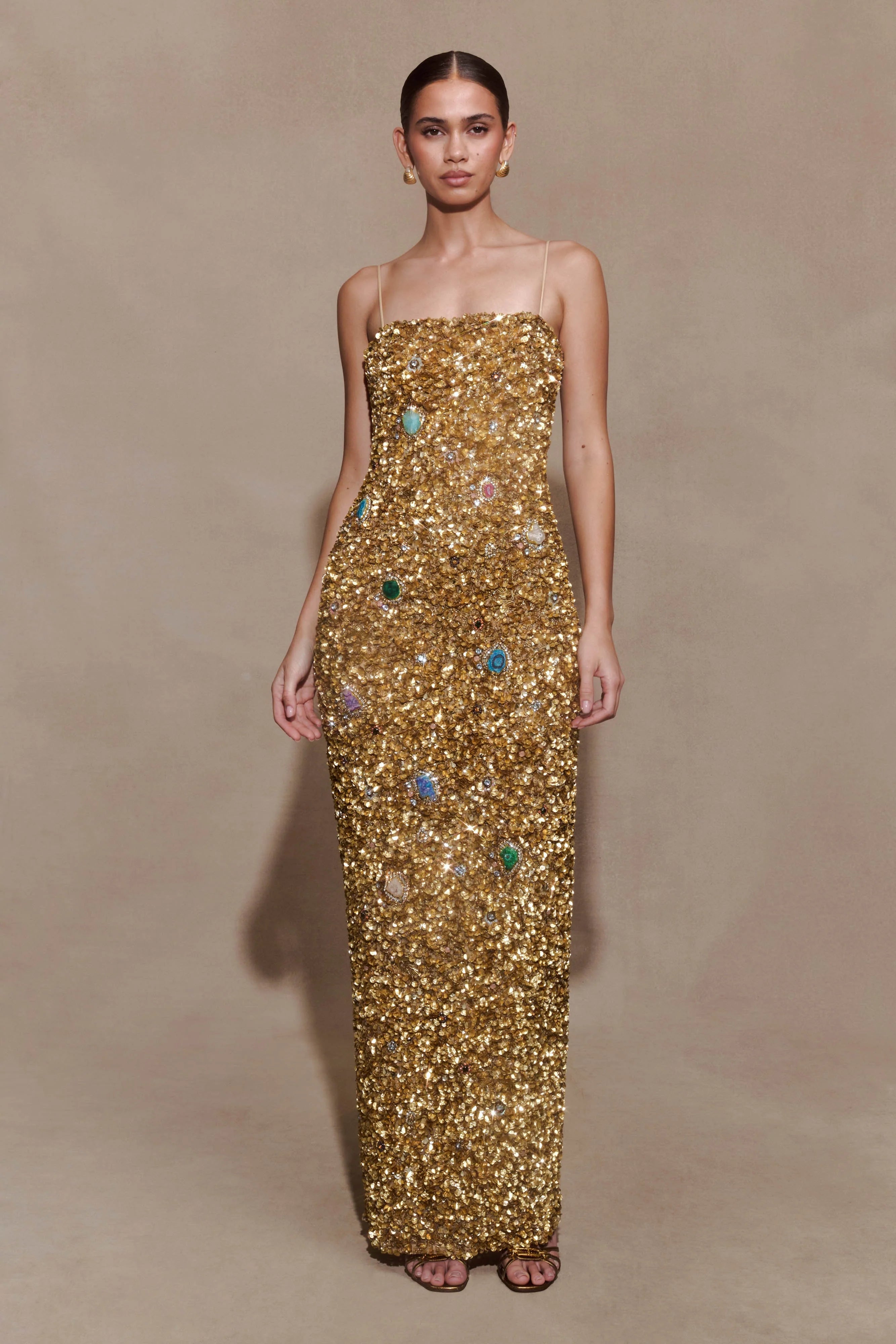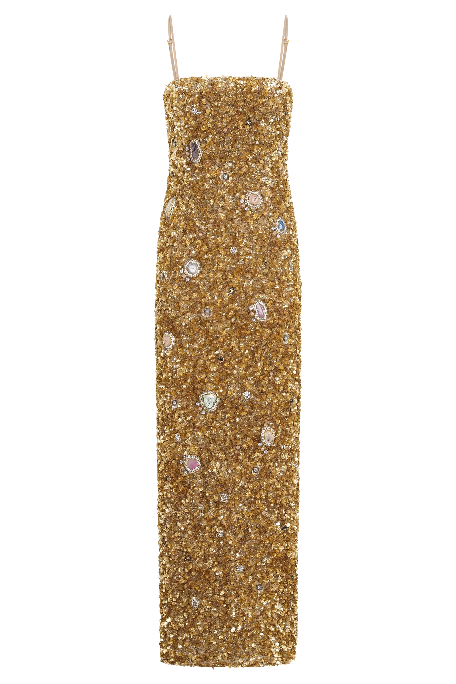 The PORTER Hand Beaded Midi Dress is a statement of craftsmanship and refined glamour. Featuring a straight neckline and adjustable straps, it’s designed with an internal corset that shapes and supports the silhouette. Fully embellished with embedded stones and crystals, it catches the light from every angle, while the relaxed bodycon fit ensures comfort through movement. Finished with a centre back split and invisible zip closure, this dress is fully lined in mesh for a smooth fit and cut to a midi length — an elegant fusion of structure, sparkle, and sophistication.