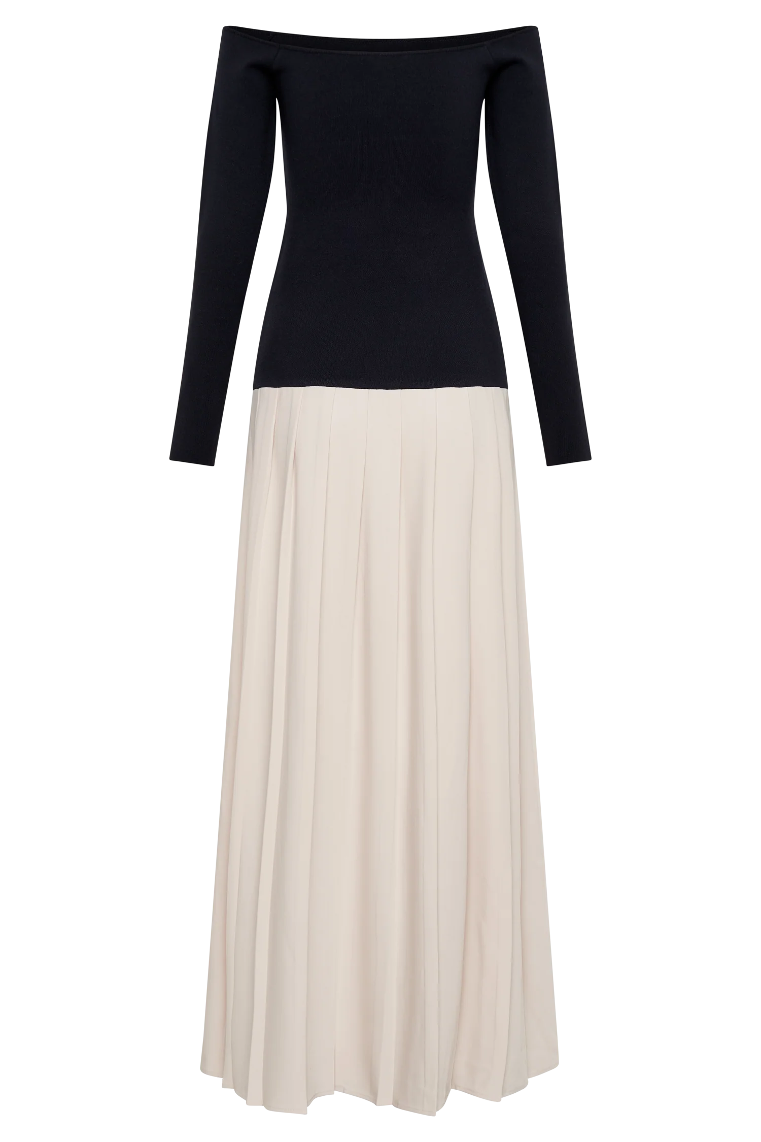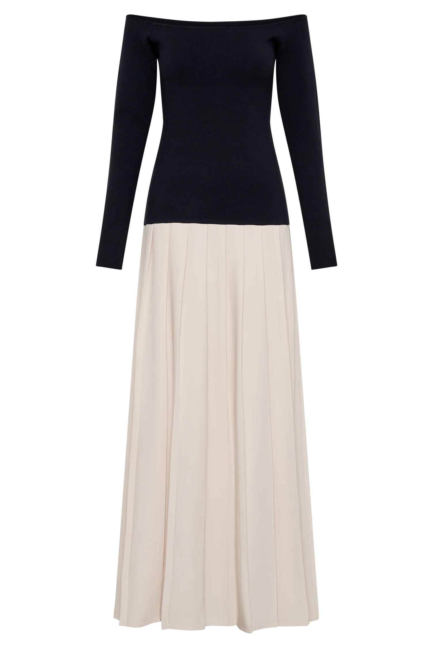 The PRESLEY Contrast Knit Off Shoulder Maxi Dress elegantly merges contemporary style with classic charm. Featuring a Bardot neckline and long sleeves, the knit upper offers a snug, bodycon fit that enhances your silhouette. The contrast between the fitted knit upper and the cotton lower skirt creates a striking visual appeal. The pleated skirt adds a touch of movement and sophistication, while the maxi length ensures a graceful, flowing look. Unlined for a lightweight feel, the Presley Dress is perfect for both daytime events and evening outings, delivering a refined and stylish statement.