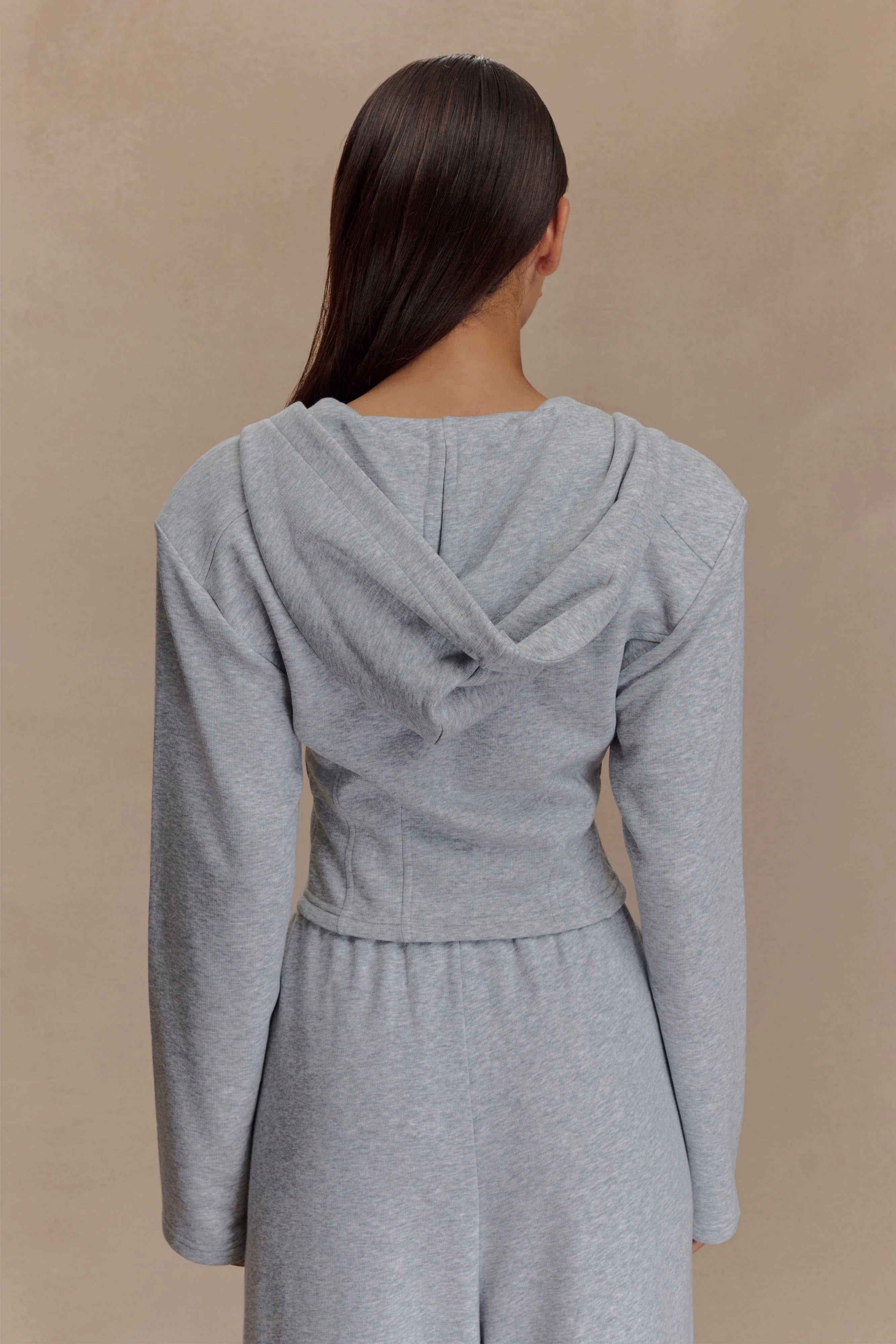 The QUINN Zip Up Hoodie redefines loungewear with a tailored edge. Featuring a functional double-ended zip front, this hoodie is designed with structured shoulder pads and a cropped length for a flattering, modern silhouette. The hood adds a relaxed touch, while long sleeves keep it cozy yet polished. Pair with the for a matching set that blends softness with statement-making structure.