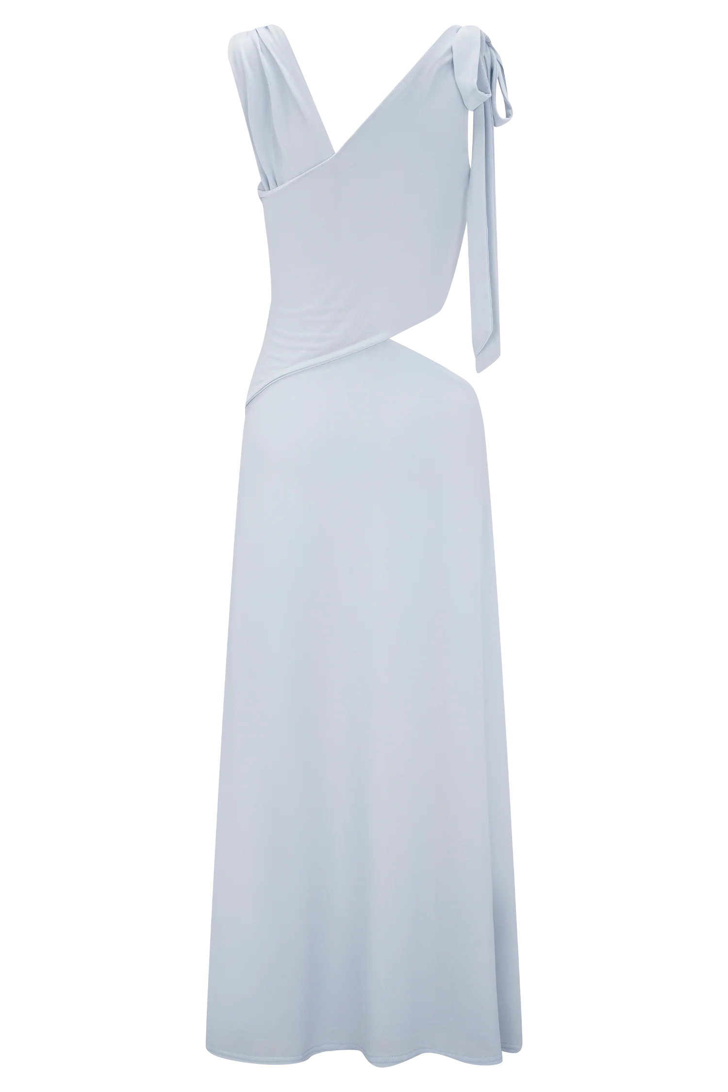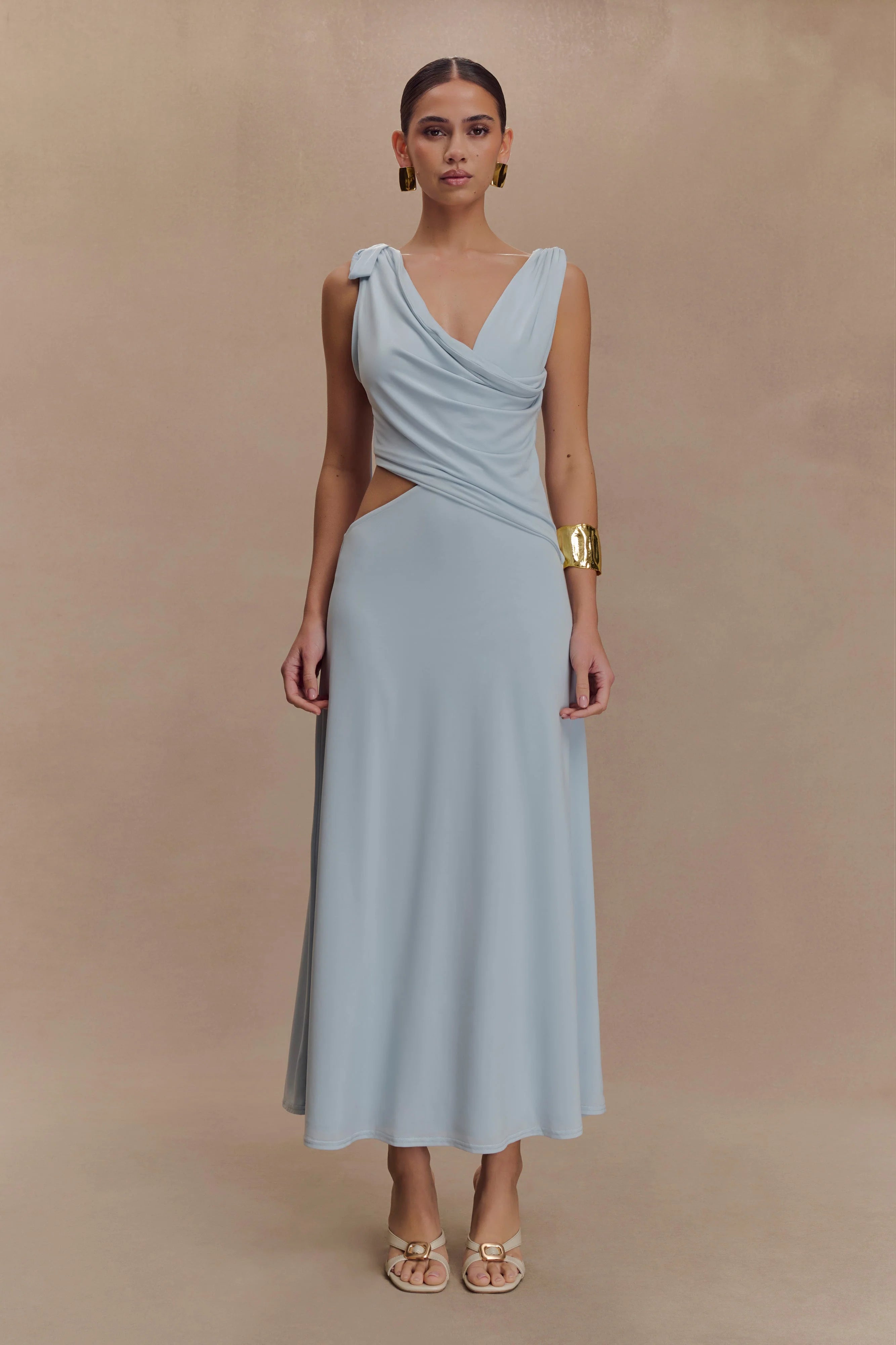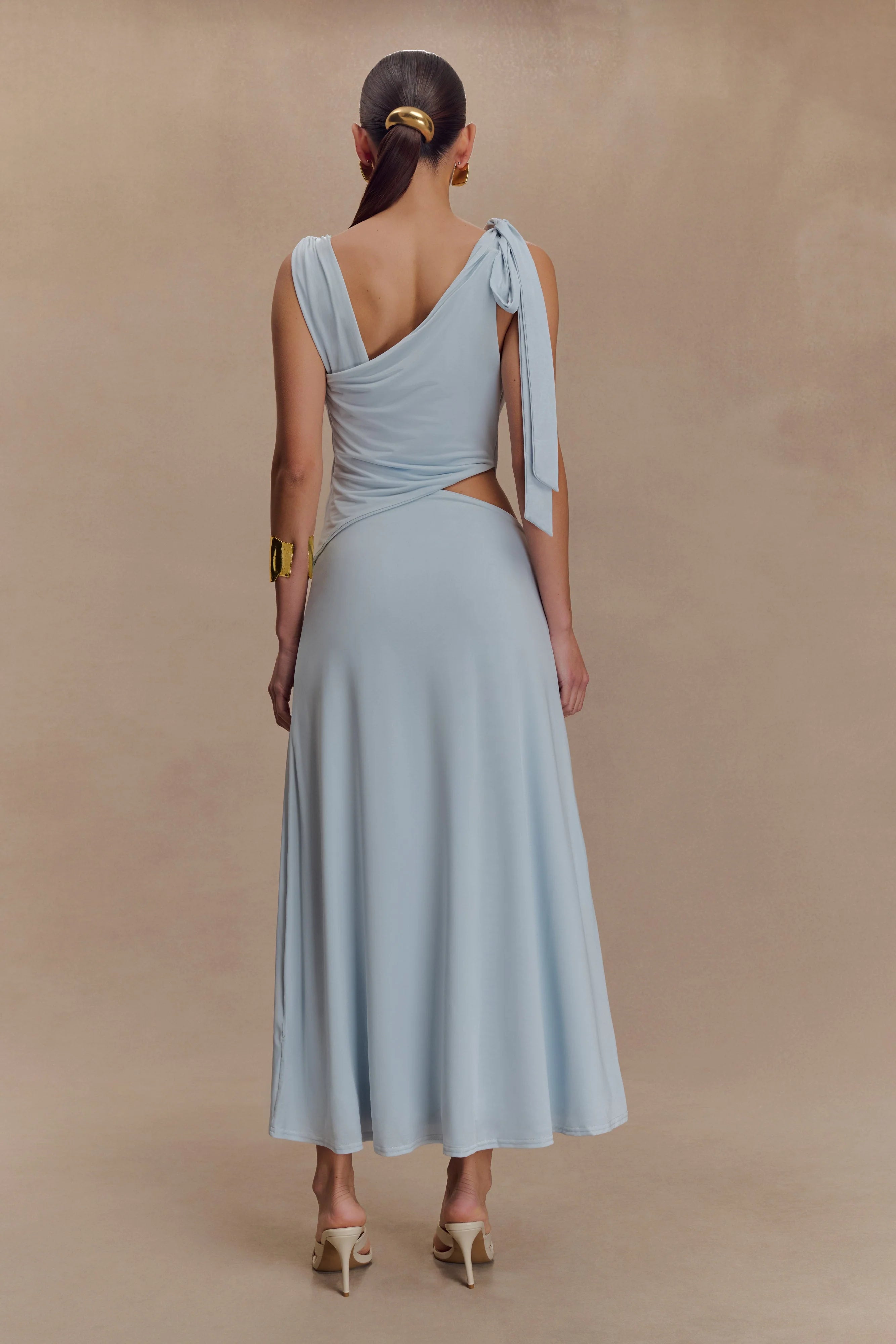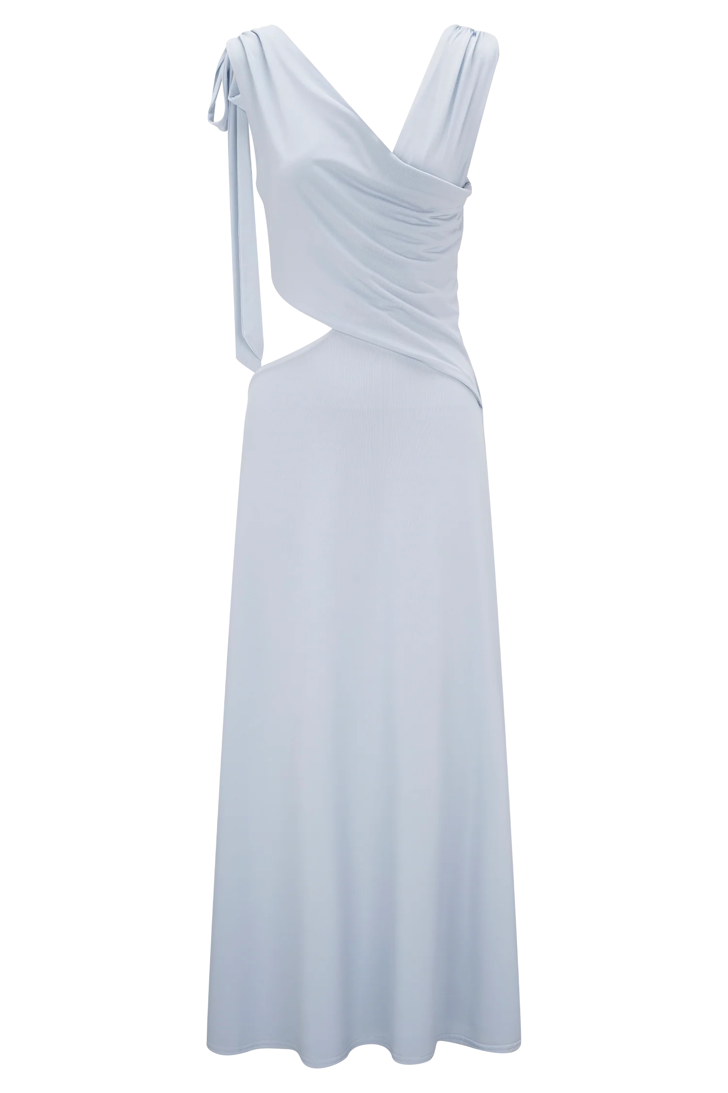 The RALEIGH Asymmetrical Slinky Midi Dress brings contemporary allure to occasion dressing. Designed with an asymmetric cowl neckline and a single tie shoulder, this silhouette plays with balance and fluidity. A daring hip cut-out adds edge to the fully lined, fitted bodice, while the A-line skirt softly skims the frame to a graceful maxi length. Both striking and refined, this dress is made for golden hour moments and after-dark statements.