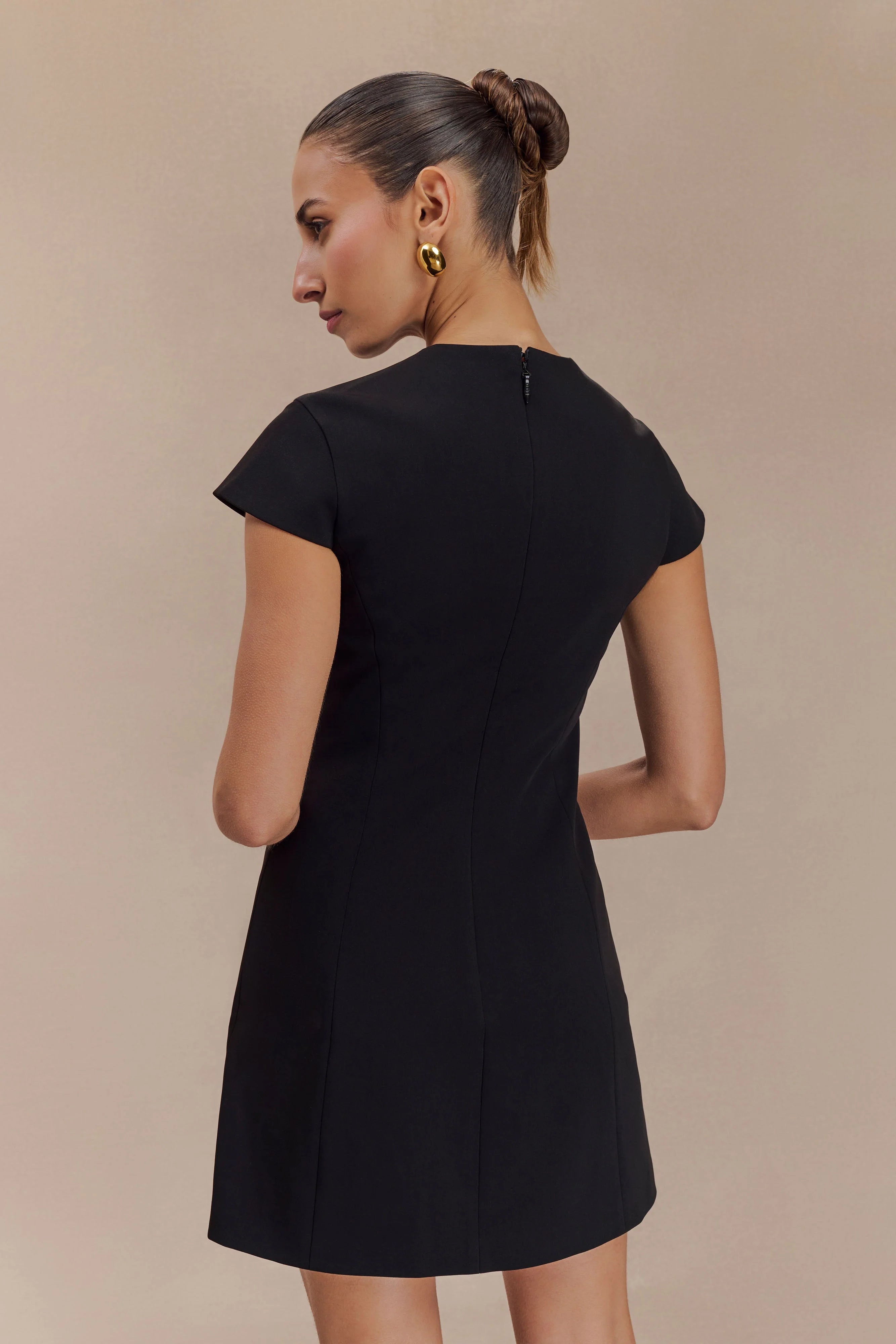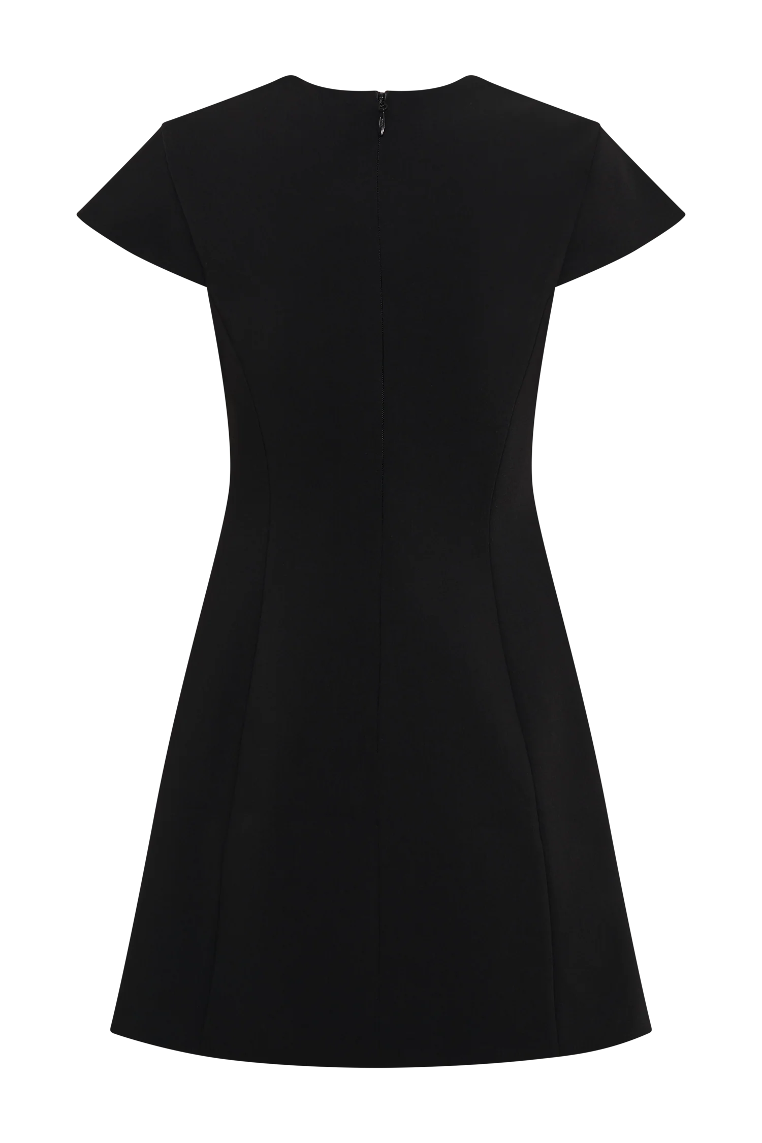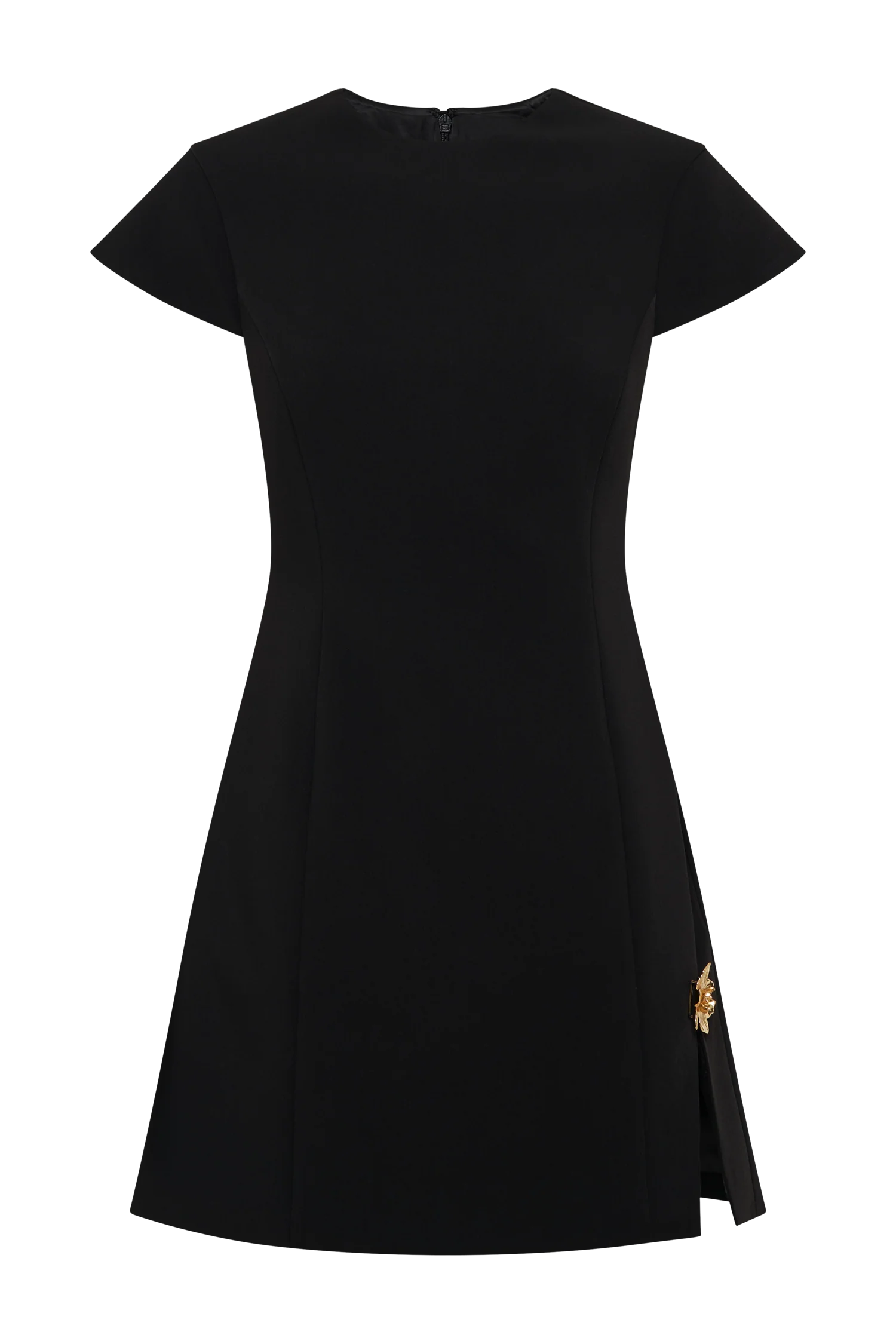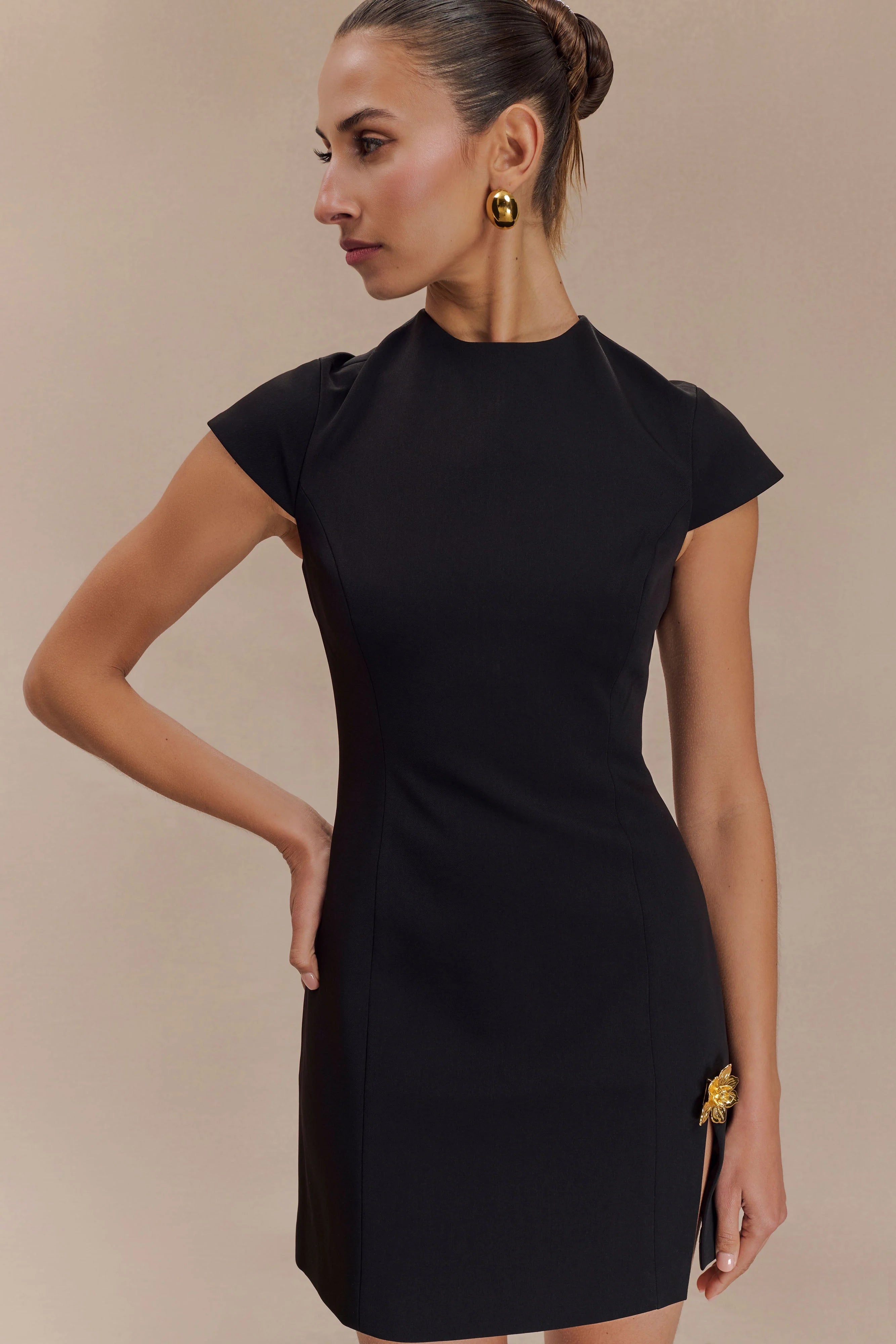 The REMI Suiting Mini Dress with Floral Hardware is the perfect blend of sophistication and playful charm. Featuring a high neckline and cap sleeves, this structured dress offers a polished silhouette that flatters any figure. The centre back zip ensures a secure fit, while the mini length adds a touch of flirtation. A stylish leg split enhances movement and adds an element of surprise. Fully lined for comfort, this dress is designed to make you feel confident and chic at any event. Adorned with exquisite floral hardware, this dress effortlessly combines classic elegance with modern details.