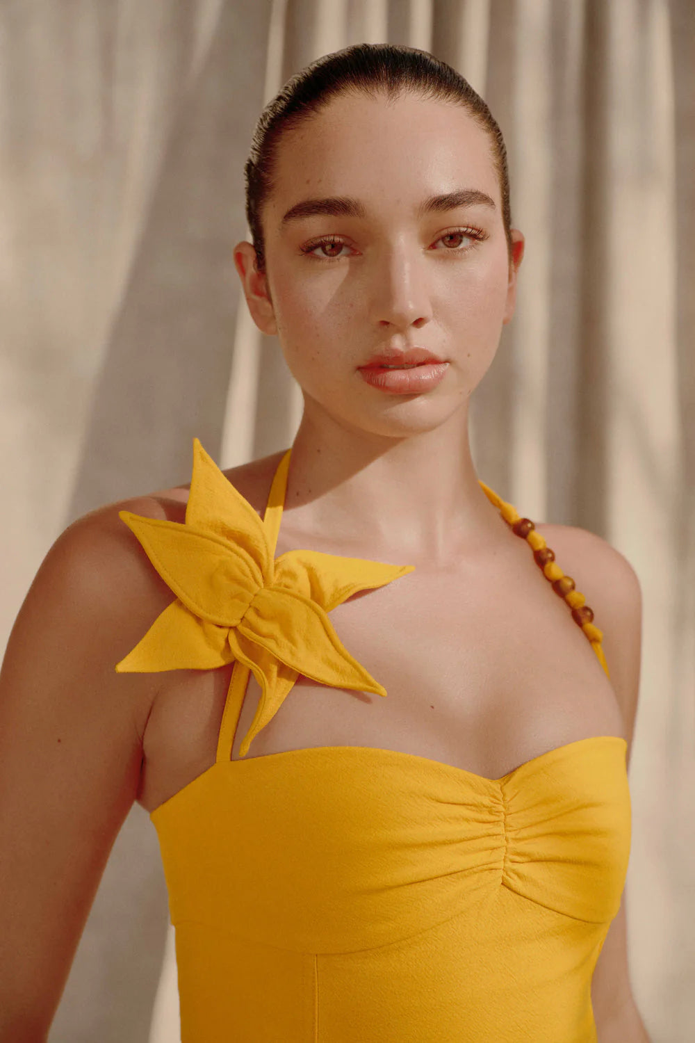 The REYES Cotton Floral Mini Dress brings playful romance to summer dressing. Crafted with a halter neckline, this mini features a statement floral applique and delicate bead accents that draw the eye upward. A ruched centre front seam sculpts the bust, while princess seams through the front and back flatter your silhouette. With an easy centre back zip and breezy unlined cotton feel, this dress is made for sunshine moments—from garden parties to long lunches.