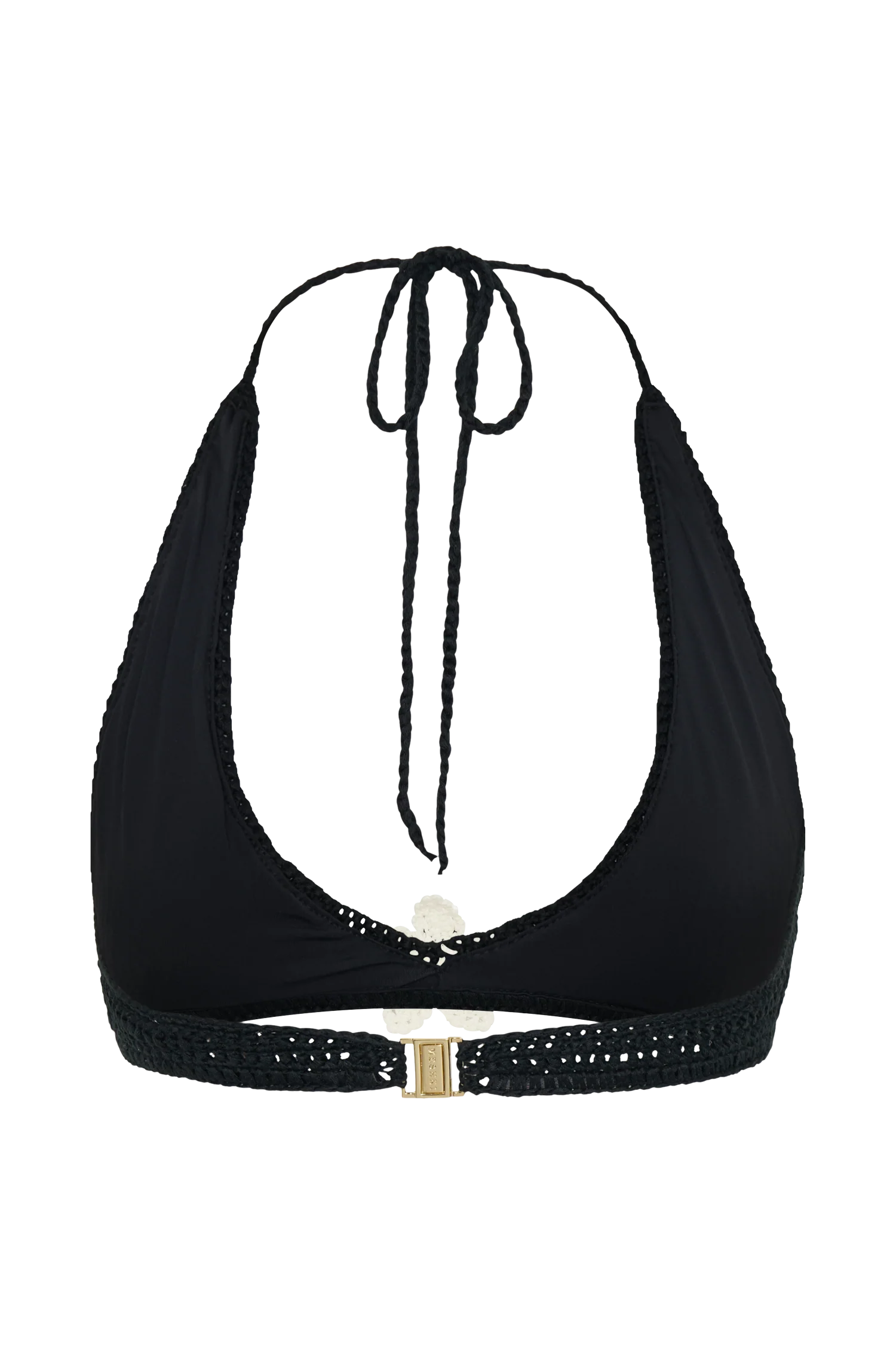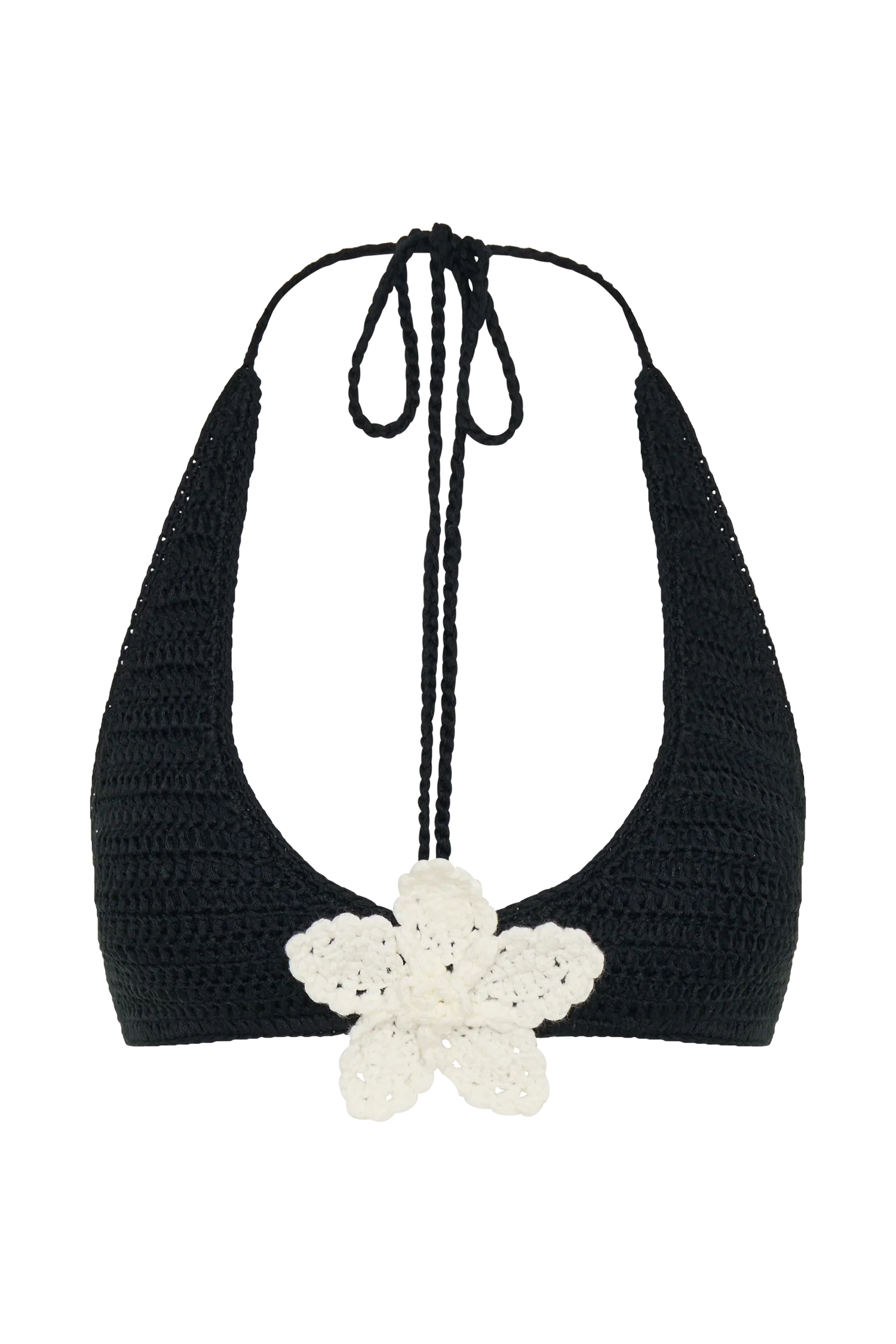 The RHIANNON Floral Crochet Halter Bikini Top exudes a whimsical and chic beachside charm, perfect for sun-soaked days. This bikini top features a functional halter design that provides adjustable support and a comfortable fit. The V neckline enhances its feminine allure, making it a flattering choice for various body types. Crafted from intricate crochet with delicate flower appliqué details, it adds a touch of artisanal beauty to your swimwear collection. The inclusion of a MESHKI golden back clasp not only secures the top in place but also adds a luxurious and stylish accent. Ideal for pairing with your favourite beach cover-up and , the Rhiannon top is a stunning piece that combines functionality with fashionable flair.