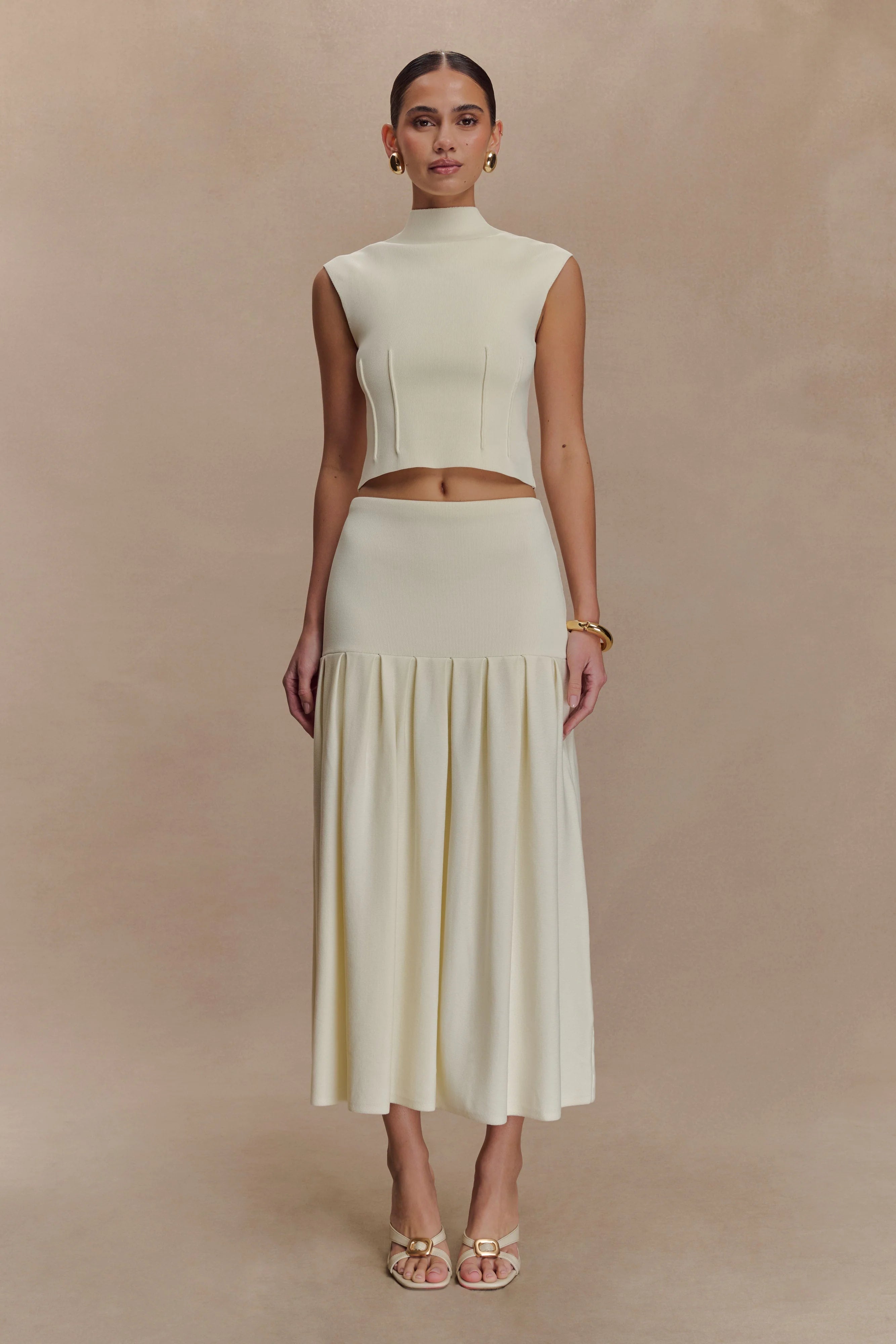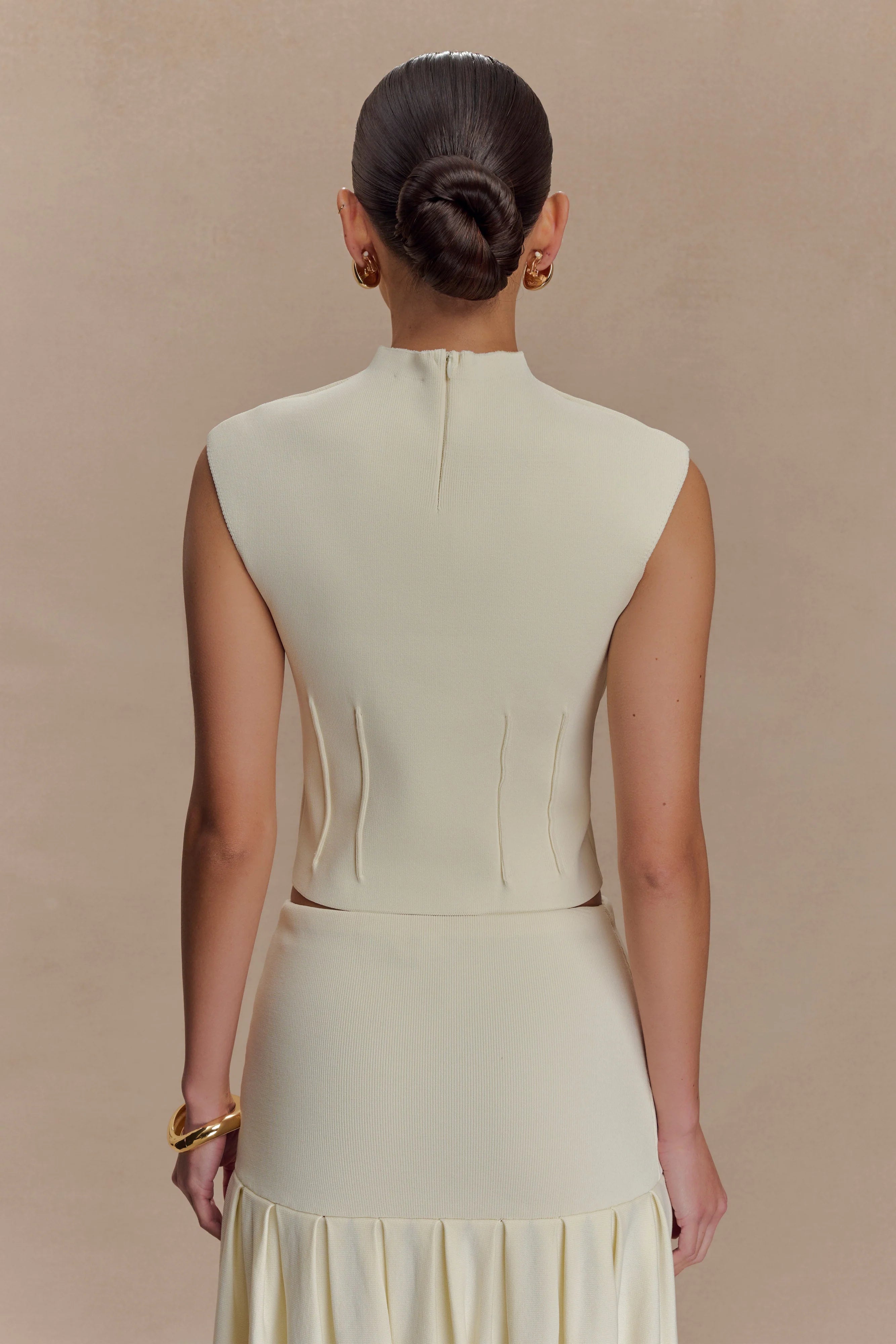 The ROMAINE High Neck Bandage Knit Top is a refined take on elevated minimalism. Featuring a high neckline, sculpted cap sleeves, and darted panel lines for a flattering, tailored fit, this top is crafted in a supportive bandage knit that contours the body. A clean back zip closure ensures a seamless finish. Pair it with wide-leg pants for modern polish or style with a skirt to balance structure with softness.