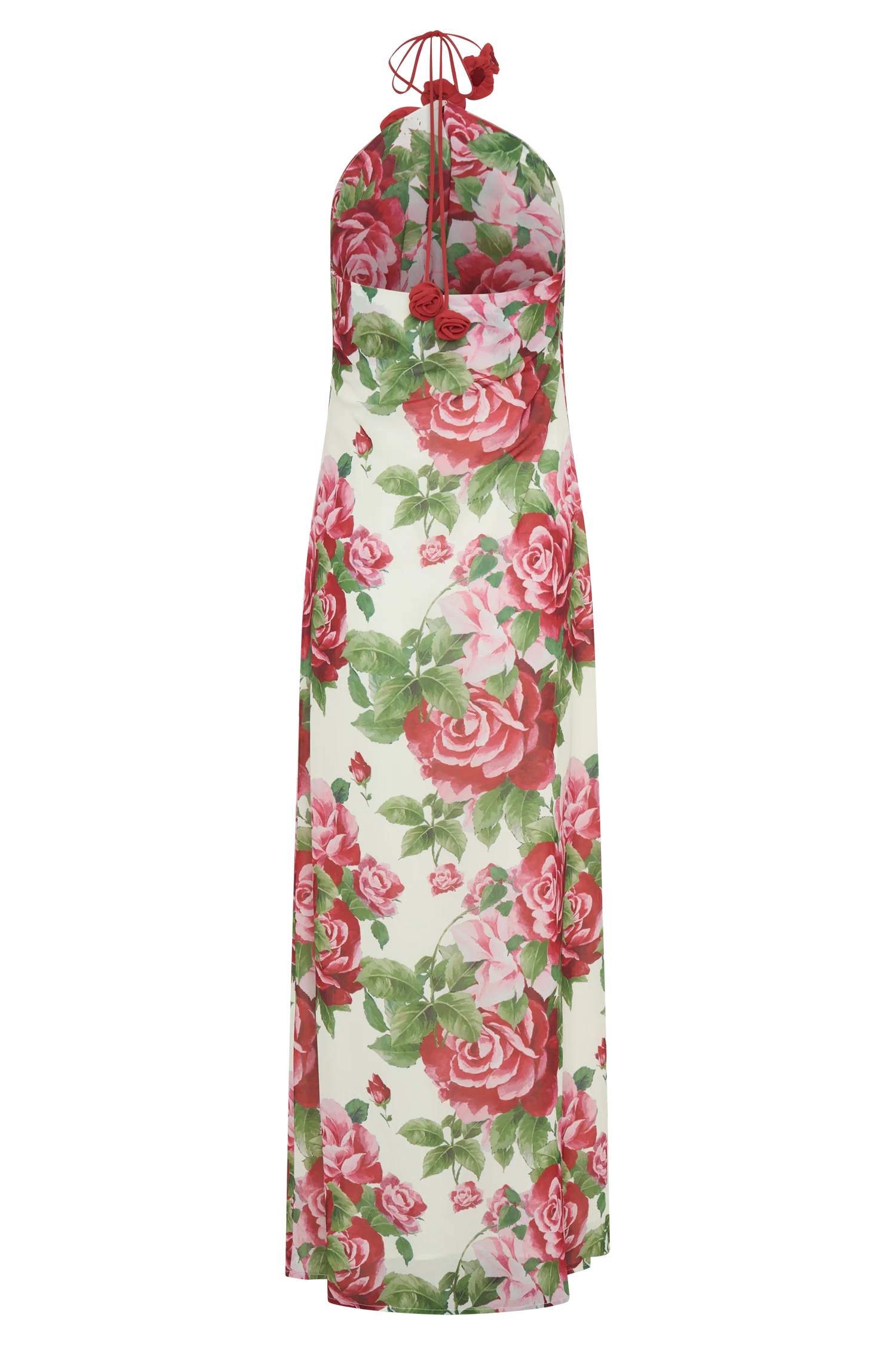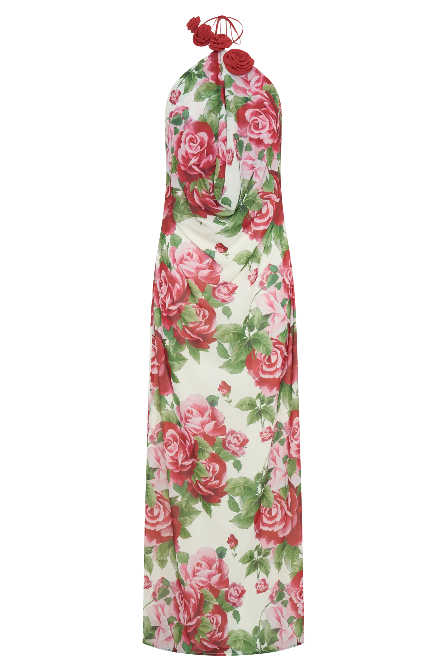 The ROSALIA Cowl Neck Maxi Dress is a captivating blend of elegance and romance. Featuring a deep cowl neckline and an alluring open back, this dress is designed to turn heads. Designed to have a soft draped fit around the neckline and soft fit body, the adjustable halter tie ensures a perfect fit, while the delicate chiffon rose applique detail adds a touch of whimsical charm. With its relaxed, drapey fit and floor-skimming maxi length, this dress is both effortlessly graceful and strikingly sophisticated.