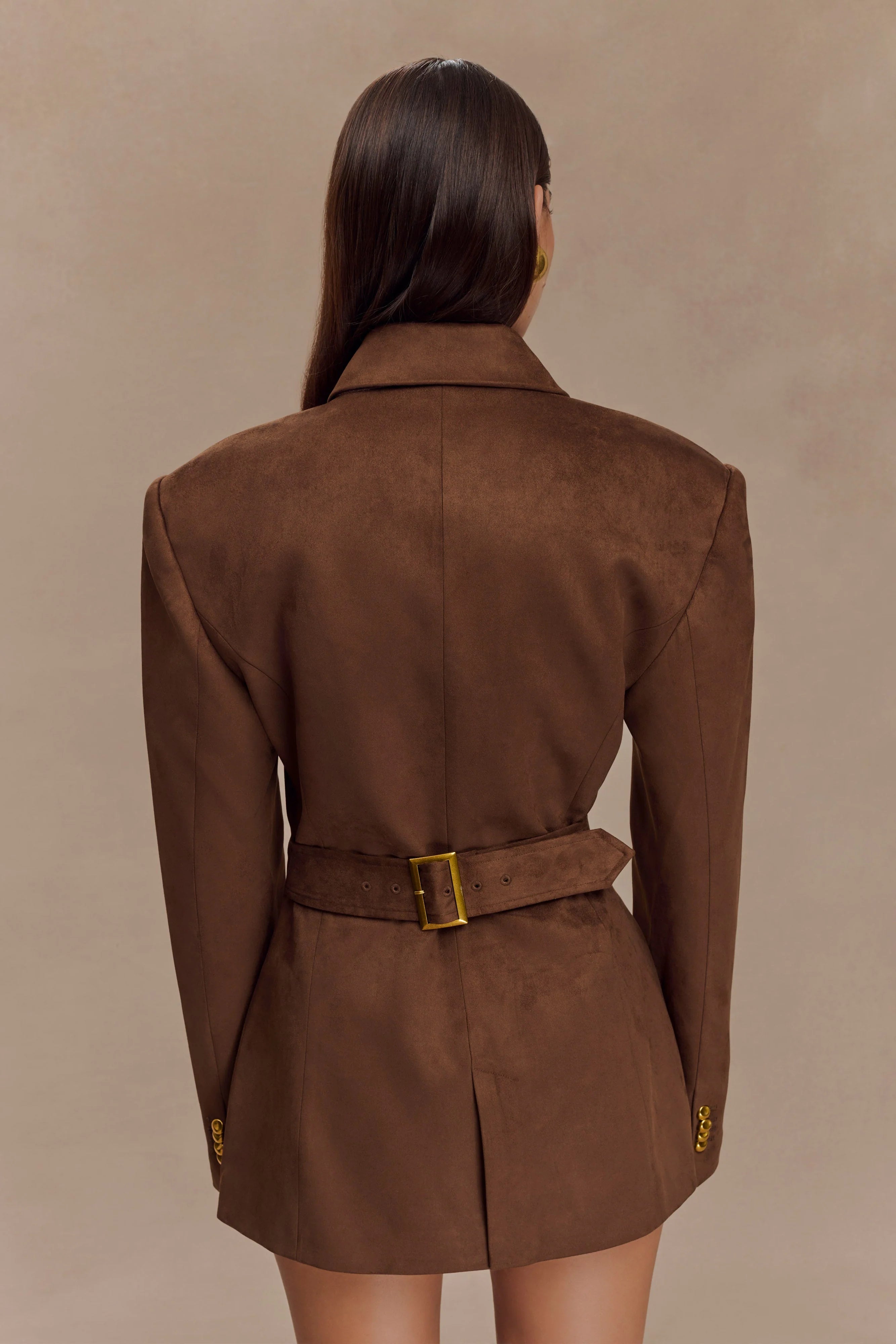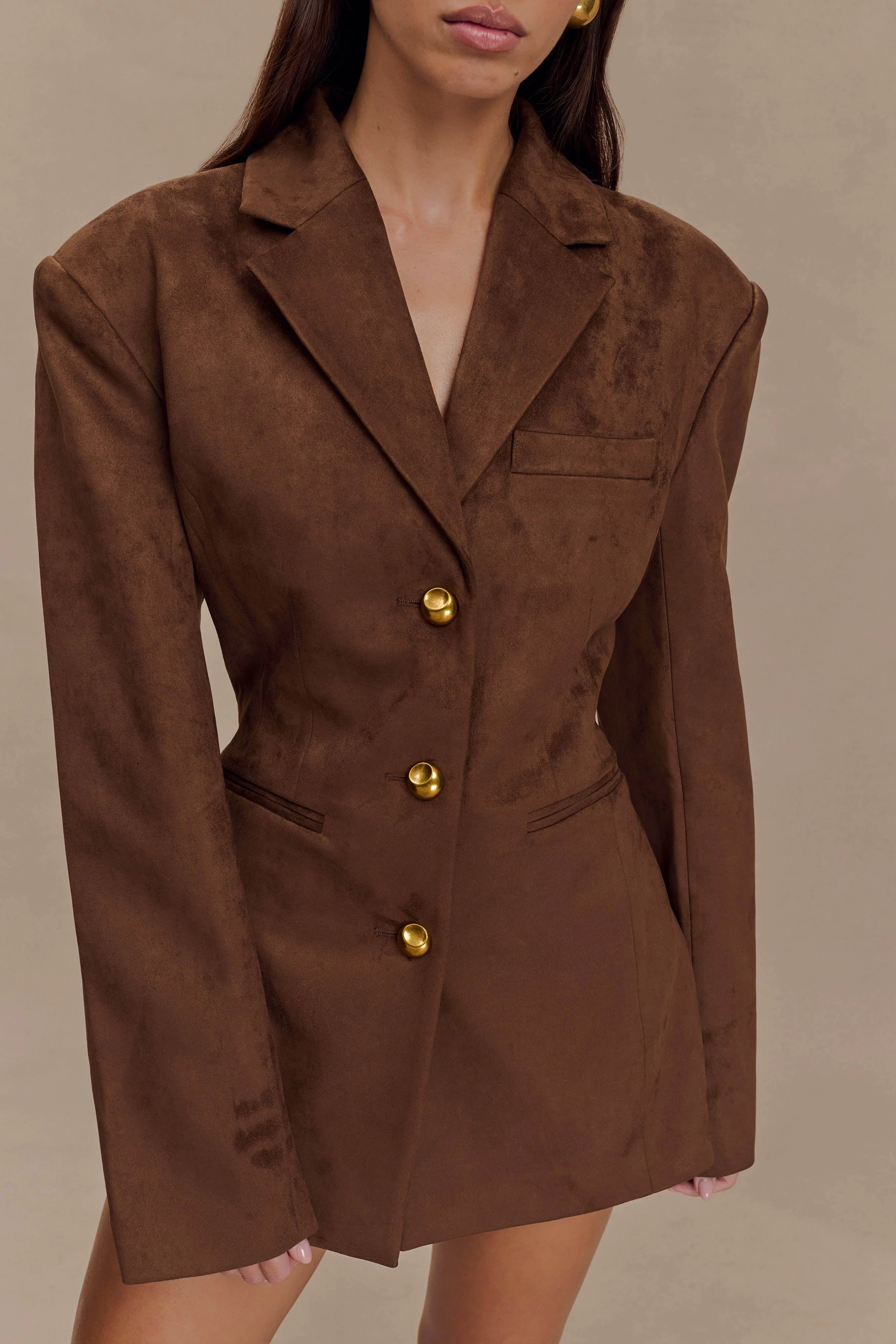 The SALLY Faux Suede Cinched Blazer is the ultimate blend of structure and softness. Featuring a classic notched lapel, internal shoulder pads, and front button fastening, this blazer is elevated by a cinched waist and back belt detail that sculpts the silhouette. Functional breast and welt pockets add a touch of polish, while the full lining ensures a comfortable fit. Pair with the for a refined co-ord that’s equal parts tailored and on-trend.