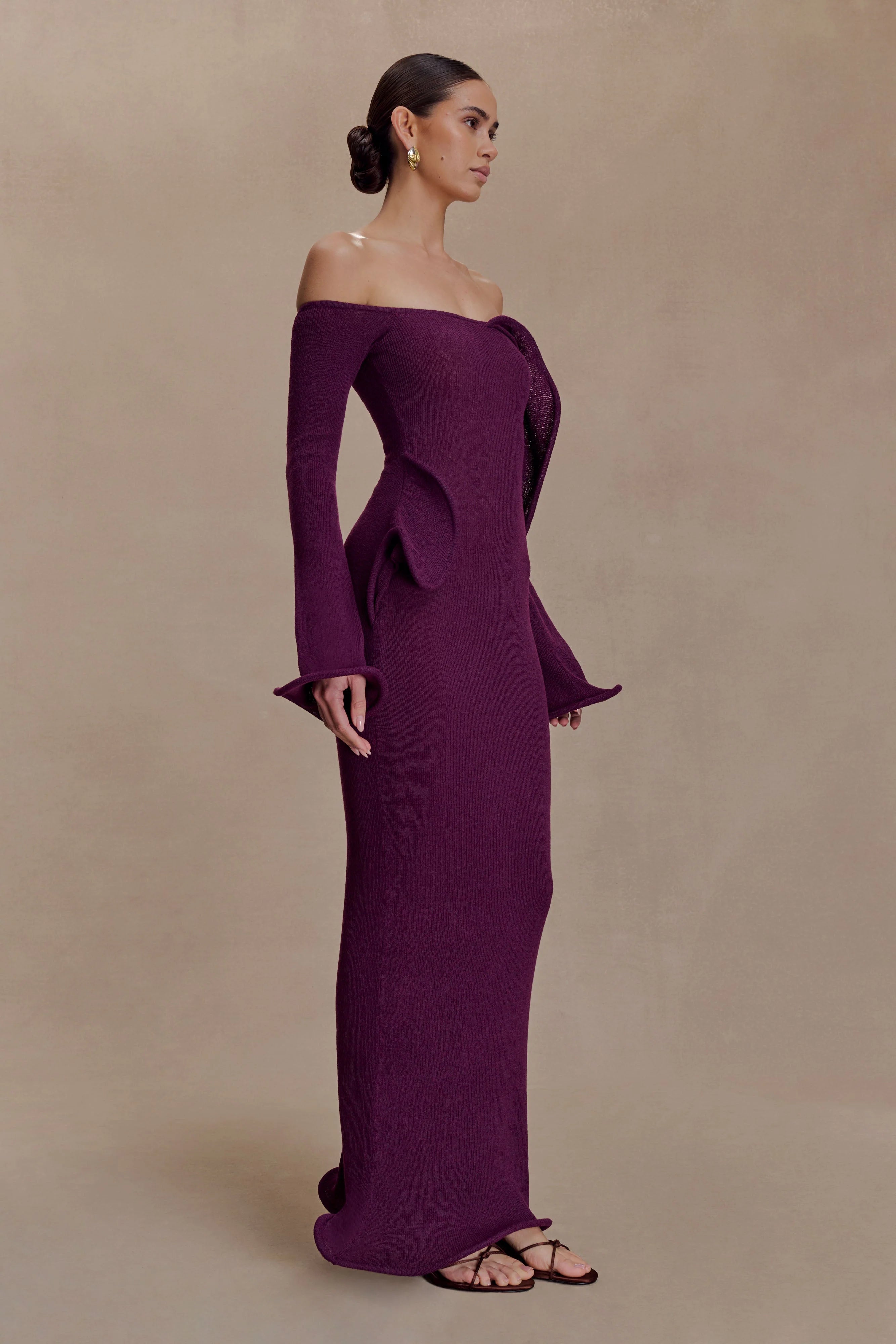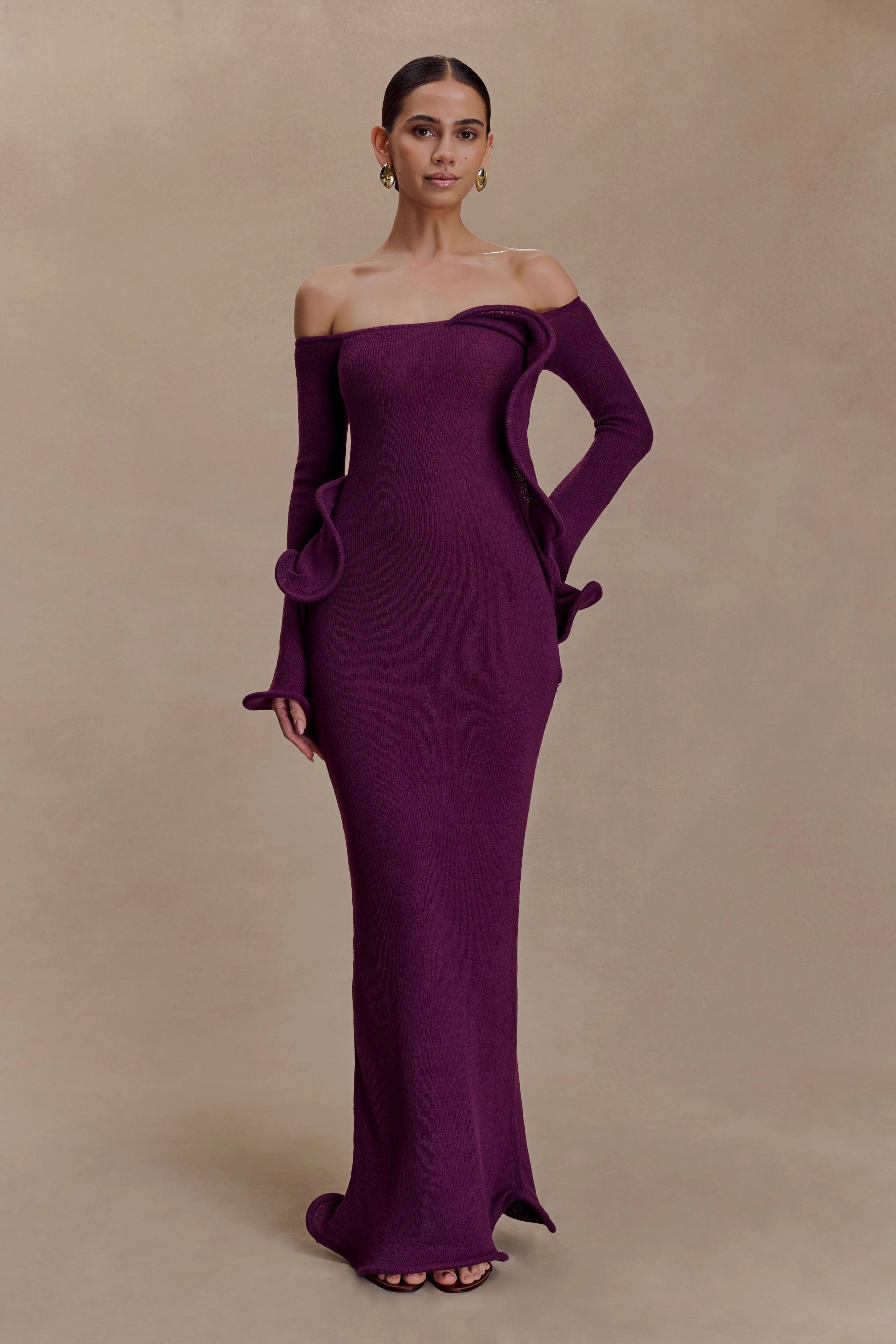 The SANDRINE Off Shoulder Knit Maxi Dress is a striking blend of romance and refinement. Designed with a Bardot neckline and long sleeves, this fitted silhouette features flared sleeve hems and delicate ripple panel detailing through the front. The fishtail hem and softly rippled finish create graceful movement, while the unlined knit fabrication hugs the body in all the right places. this dress is your go-to for elevated evenings, balancing softness with sculptural allure.