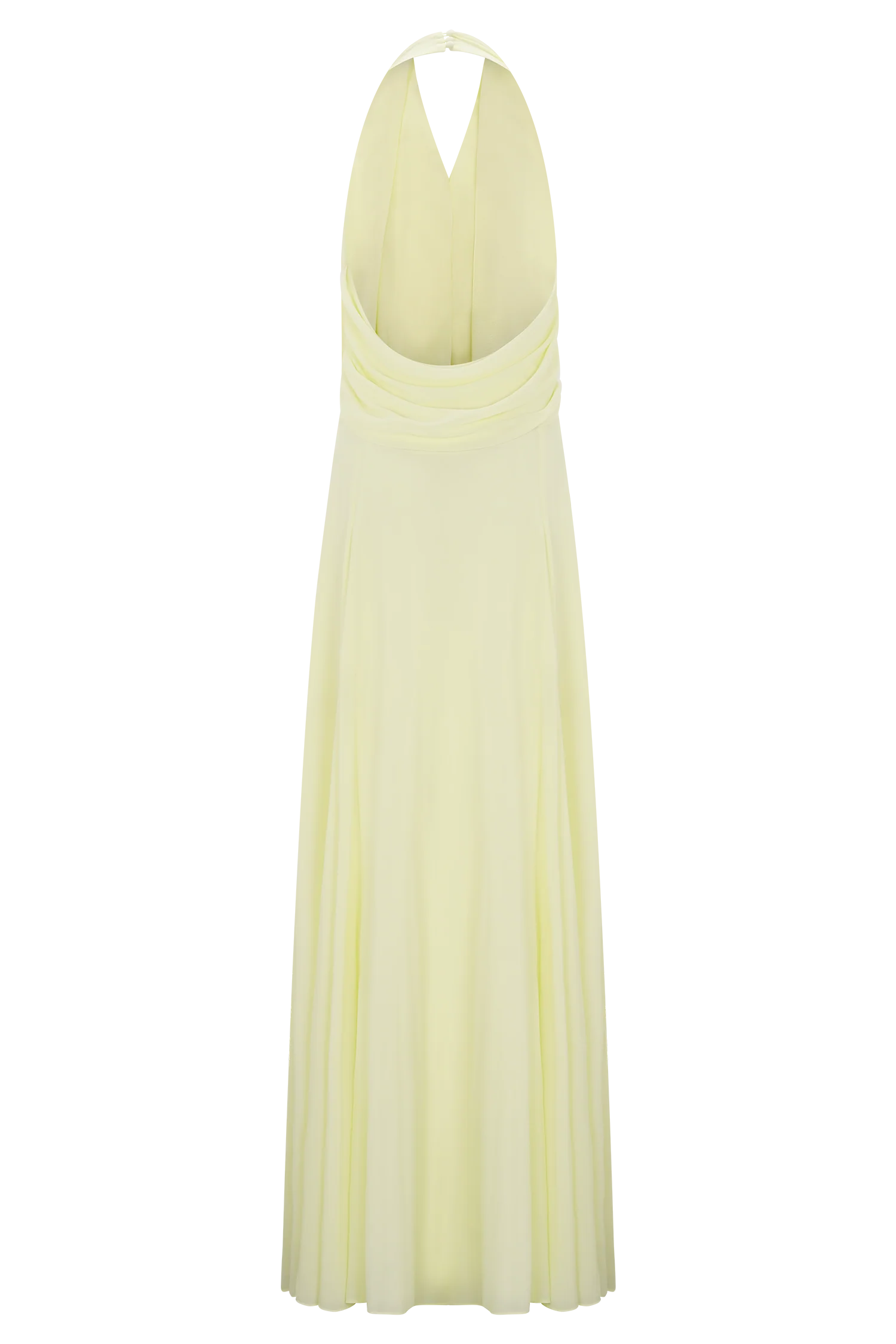 The SANTAL Floral Chiffon Halter Maxi Dress is an ethereal silhouette designed for movement and ease. Featuring a soft cowl neckline with a halter neck secured by three buttons, it drapes effortlessly across the body for a graceful finish. Diamante trims at the front waist add a touch of sparkle, while a detachable scarf at the neck offers versatile styling options. Fully lined for comfort and cut to a maxi length, this dress embodies timeless femininity with a modern edge.