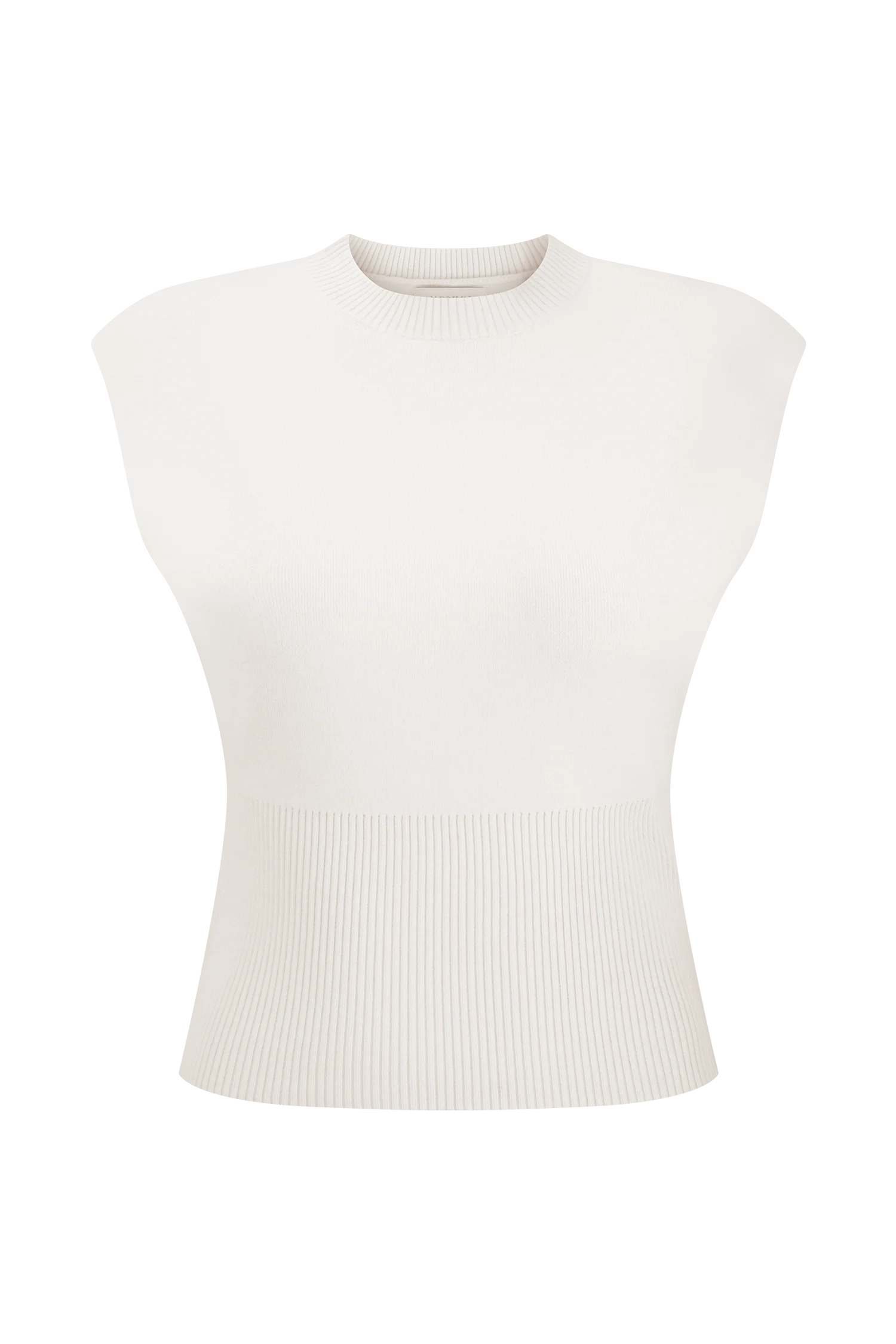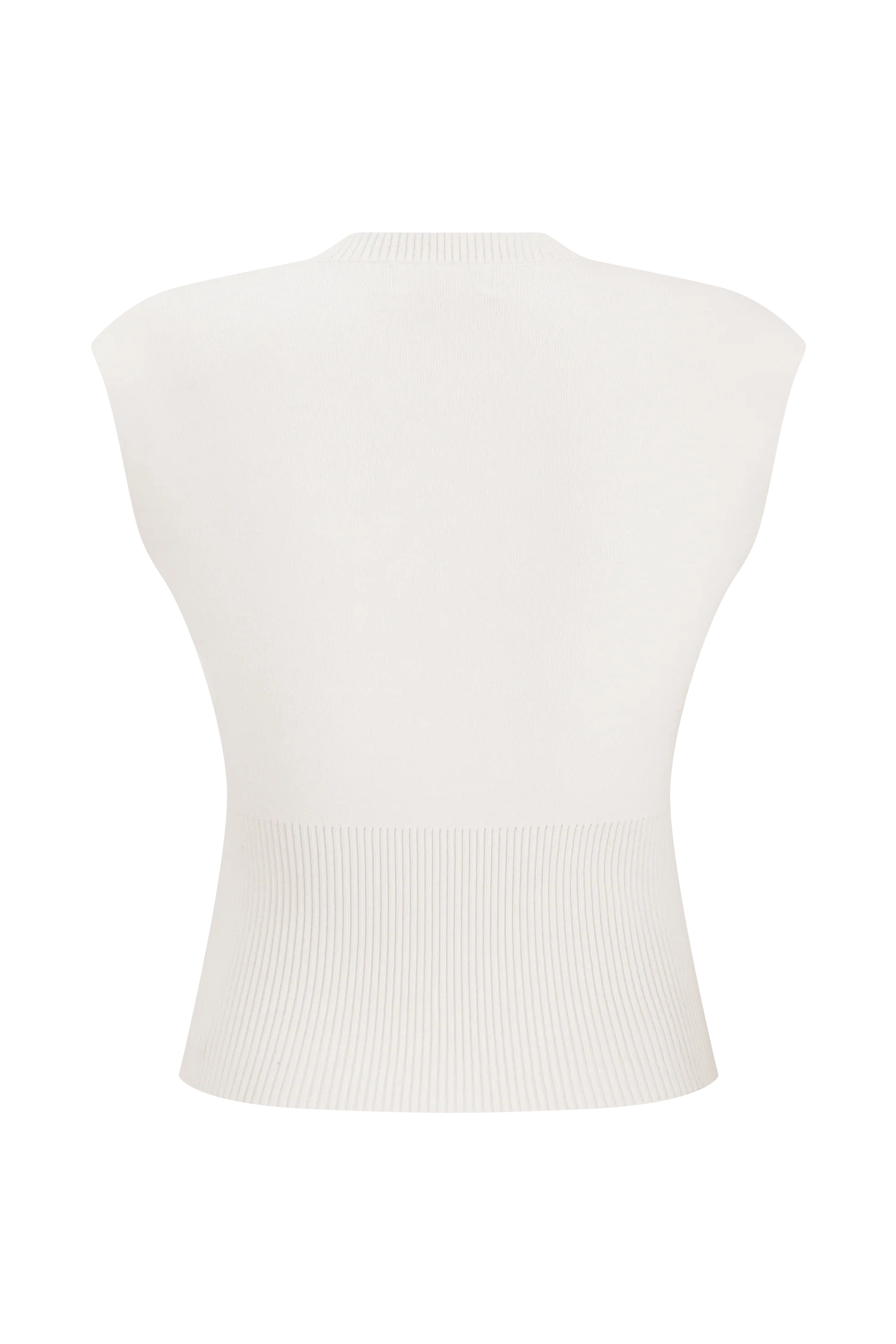 The SHARPAY Sleeveless Knit Top is a modern staple with a confident edge. Featuring a crew neckline framed by ribbed trims, it’s crafted from a thick knit fabrication that holds its shape while flattering the frame. Shoulder pads introduce subtle structure to the sleeveless silhouette, giving this top a sharp, tailored finish. Designed for effortless styling, this top balances minimal design with maximum impact.
