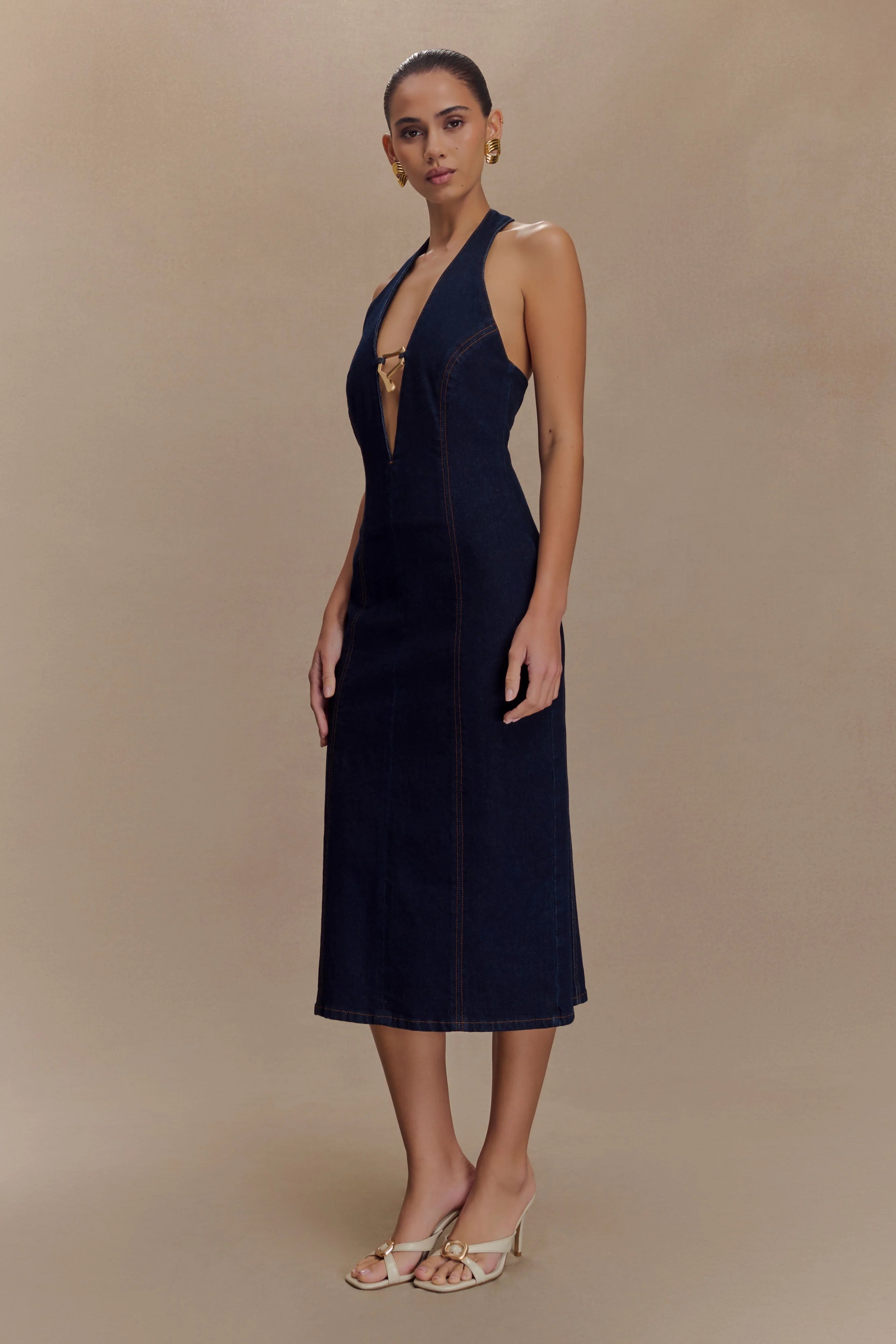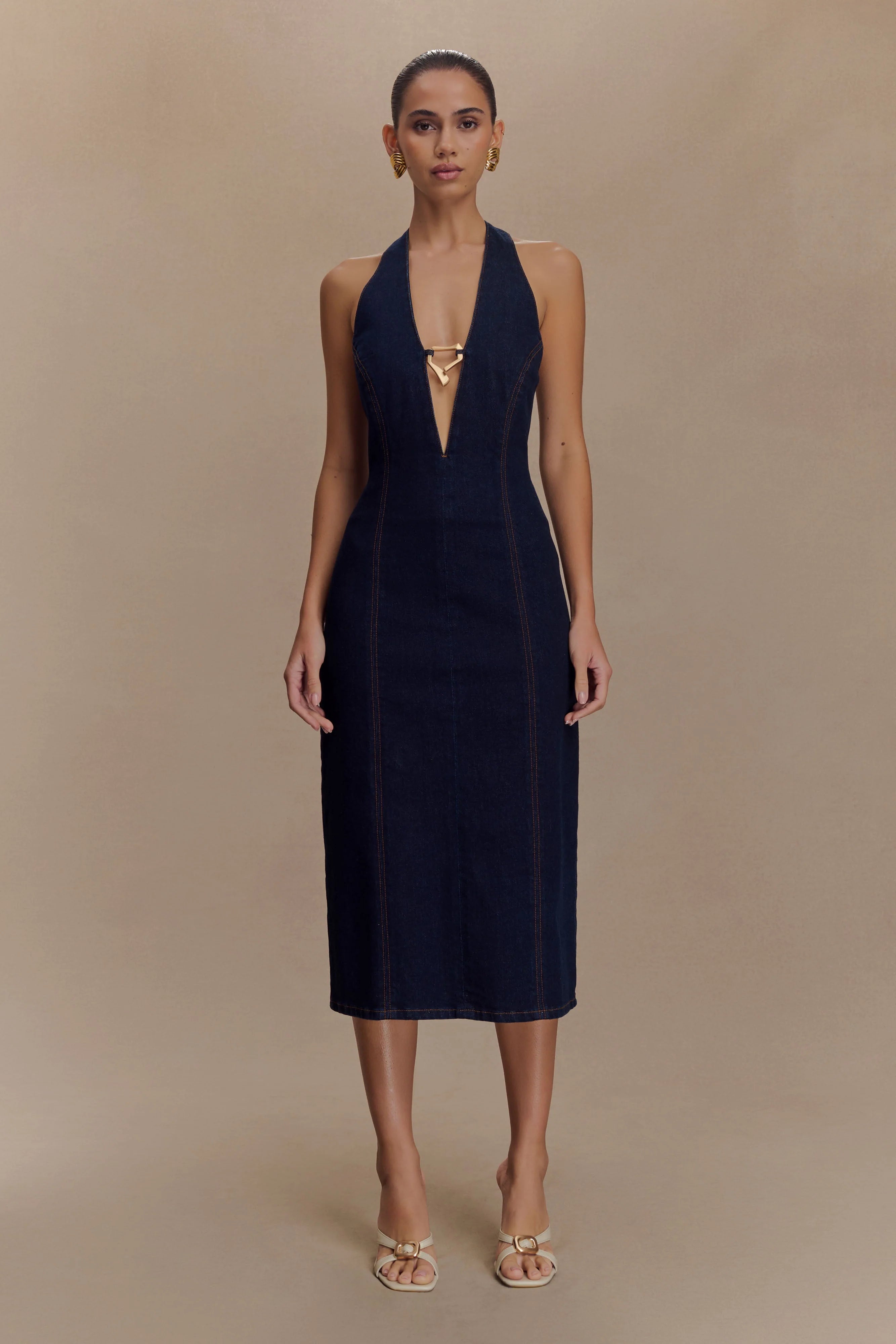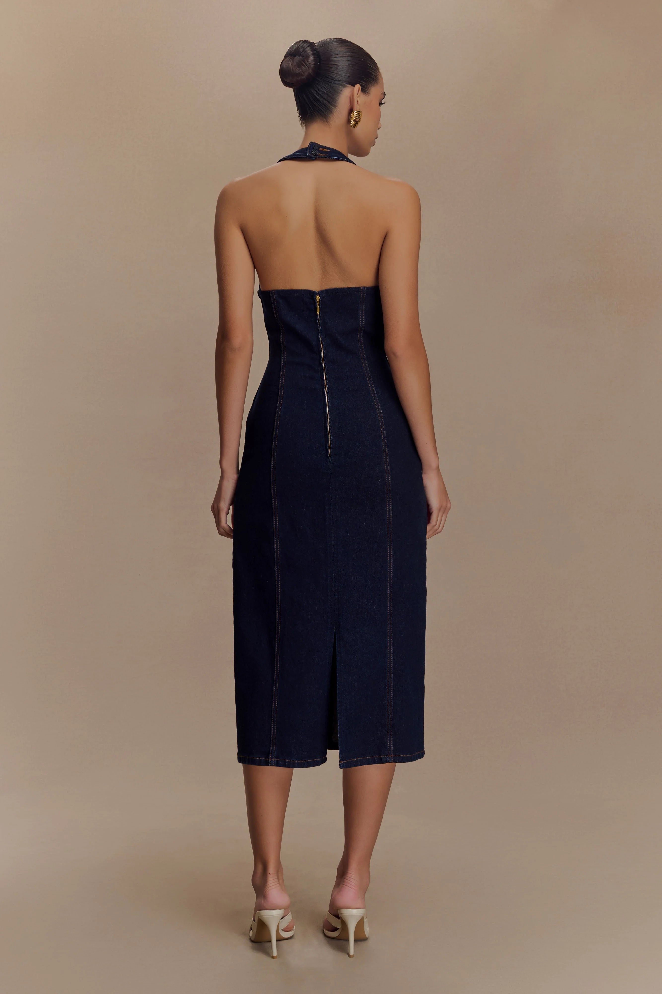 Own the moment in the SHAUNA Denim Halter Midi Dress, a striking blend of bold design and structured elegance. Featuring a deep plunge halter neckline with luxe gold hardware, this fitted silhouette sculpts the body with precision. The pencil shape and midi length exude sophistication, while the back button neckline closure, zip fastening, and back vent offer both ease and allure. This dress is denim reimagined—confident, polished, and unapologetically statement-making.