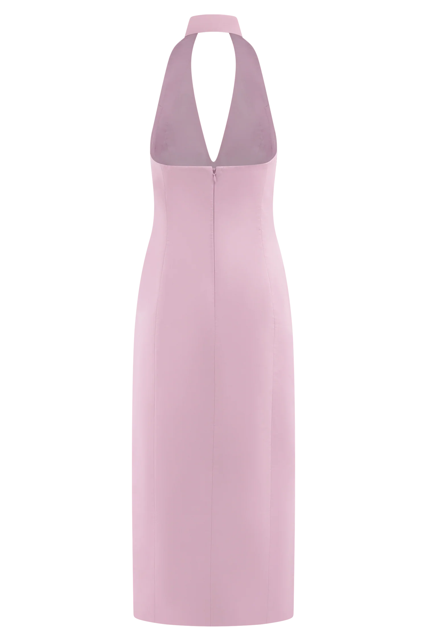 The SIMONA Halter Neck Midi Dress is an elegant essential, designed to flatter with ease. Featuring a halter neck tie and plunging V neckline, this midi dress is detailed with non-functional centre front buttons for a touch of vintage charm. Tailored through front and back side seams, it skims the body before finishing with a back split for ease of movement. Secured with an invisible centre back zip, this dress is your go-to for elevated days and effortless evenings.