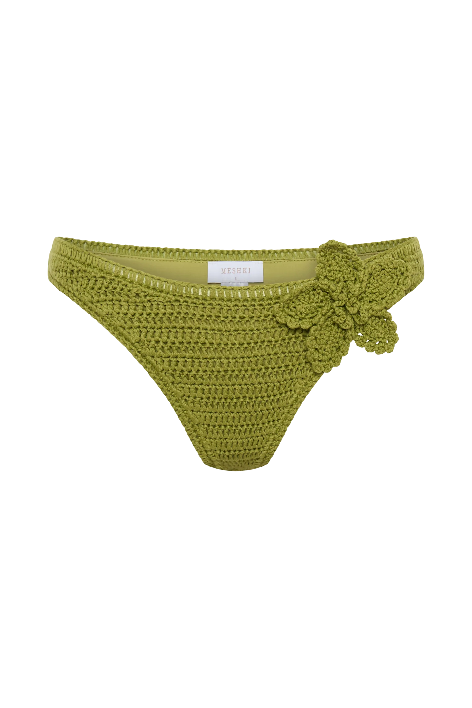 The SKYE Floral Crochet Tie Up Bikini Bottom offers a flirty and stylish option for beach enthusiasts and sun worshippers alike. Designed with a low rise fit, it provides a modern and alluring silhouette that flatters the hips. The crochet fabrication, meticulously crafted, adds a unique, textured element to the piece, while delicate flower details inject a playful and feminine charm. This bikini bottom features cheeky coverage that offers a hint of daring, perfect for those who want to showcase a bit more skin. Ties at the sides allow for adjustable fitting, ensuring both comfort and a secure fit. Swim lined for practicality, these bottoms combines aesthetic appeal with functionality, making it a beautiful choice for any beach day or pool party. Pair with the to complete the look.