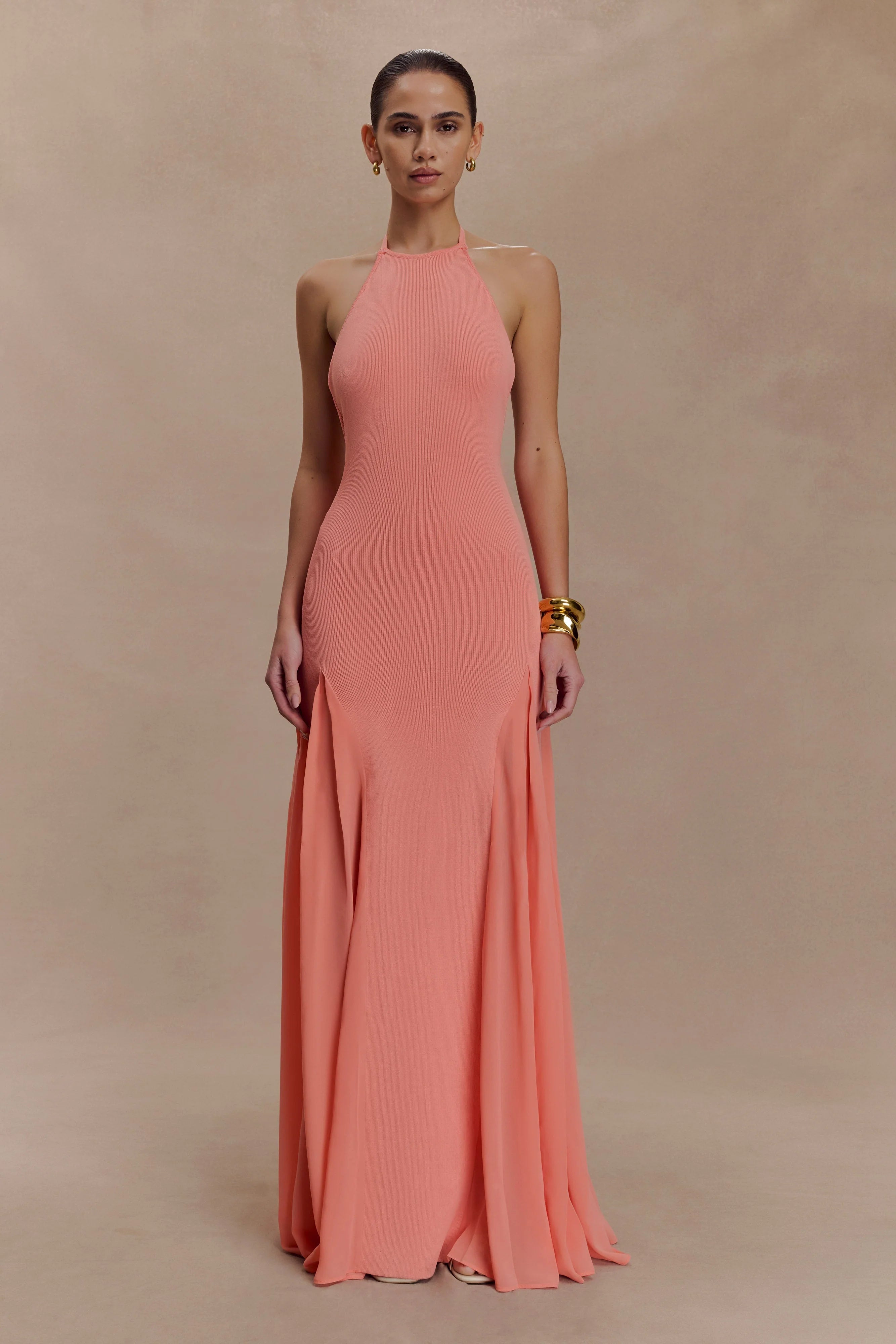 The SOLEIL Knit and Mesh Halter Maxi Dress is where sleek meets ethereal. Featuring a halter neckline, sleeveless design, and racerback silhouette, this fitted dress contours the body before flowing into soft chiffon skirt godets that create beautiful, airy movement. The unlined construction keeps the look effortlessly light, while the maxi length adds a touch of drama. This dress is your go-to for elevated ease and statement silhouettes.
