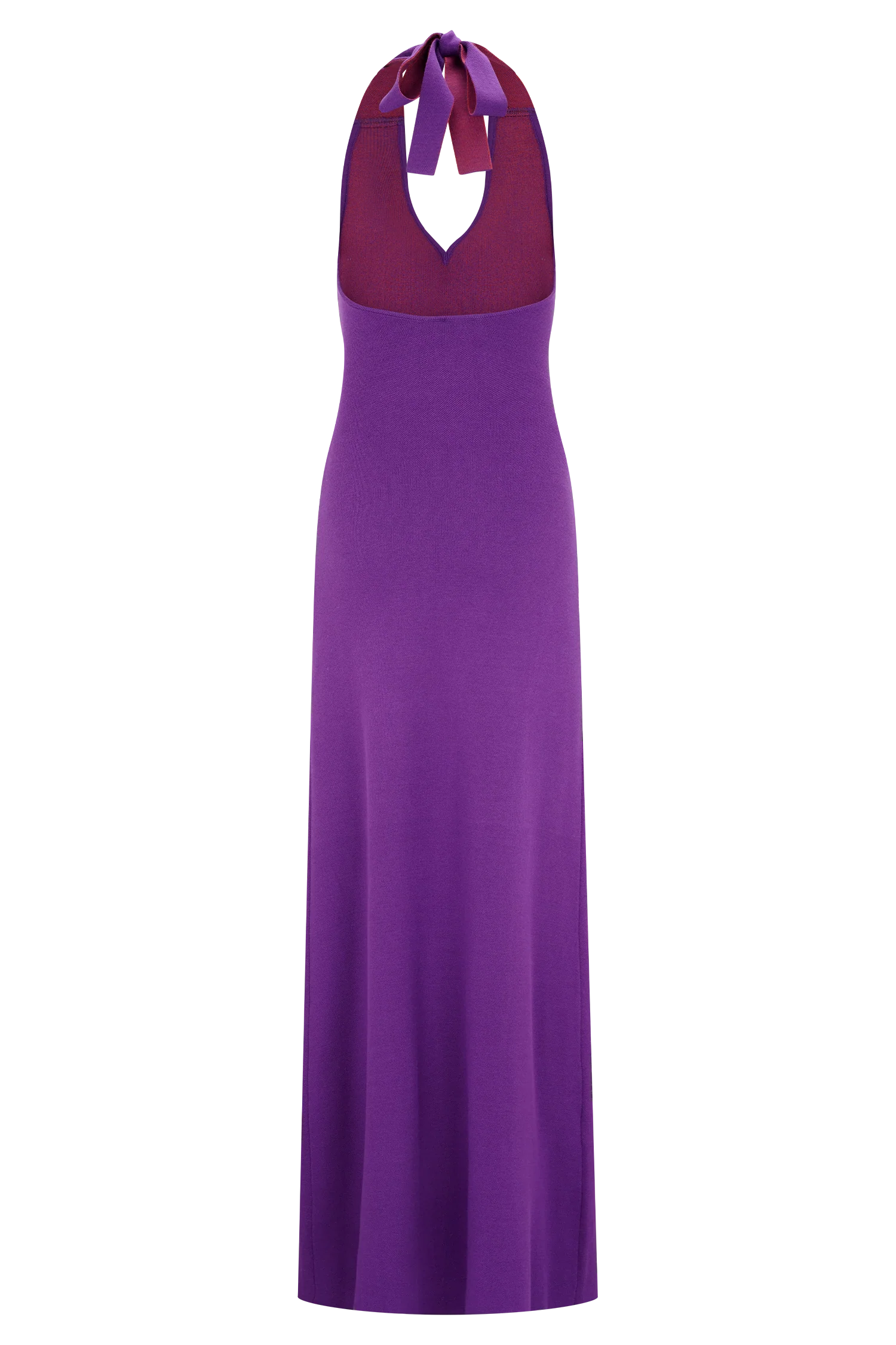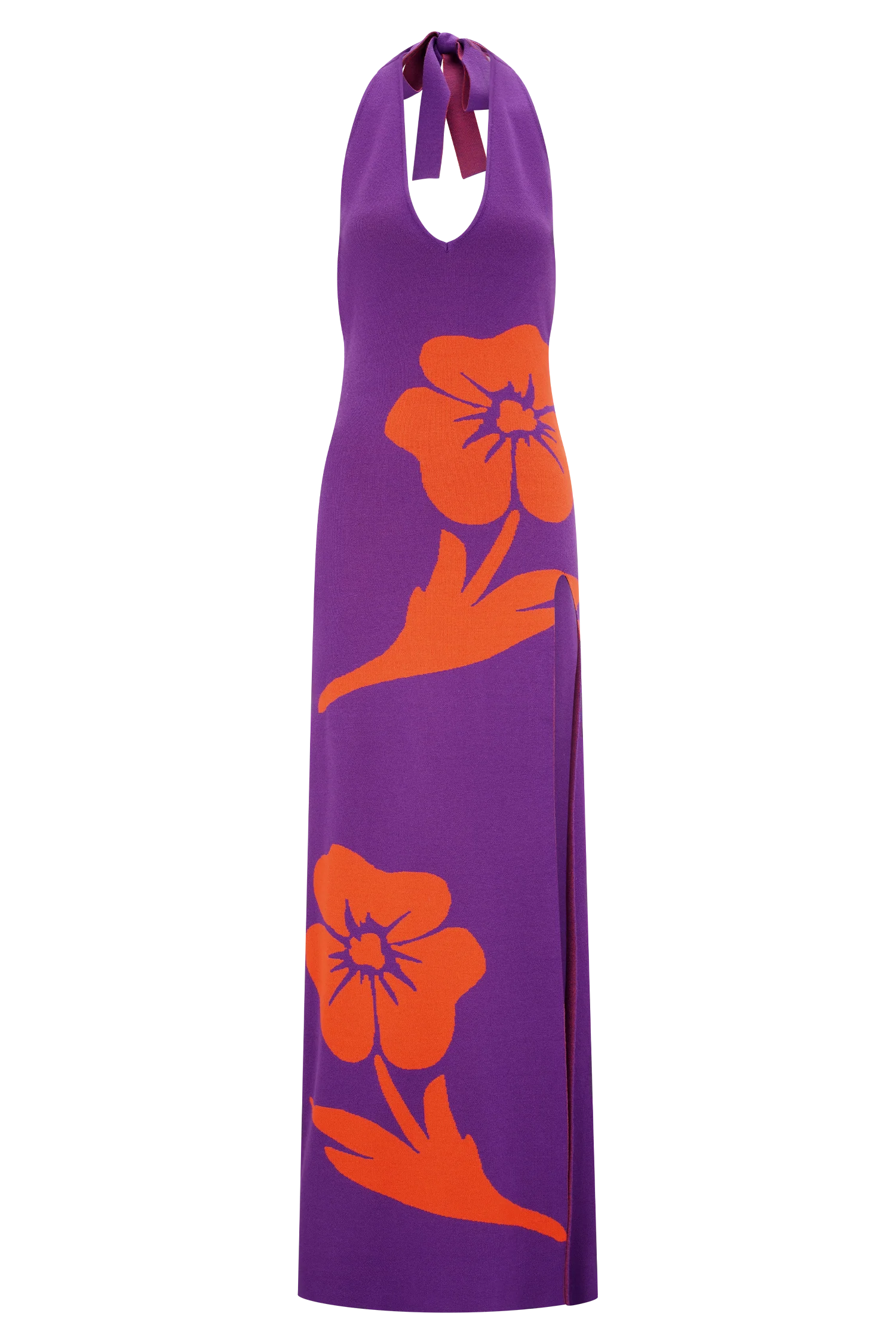 The STACY Knit Halter Maxi Dress is your effortless go-to for long lunches, resort strolls, and golden hour getaways. Crafted in a lightweight, unlined knit, this floral-print maxi features an adjustable halter neckline and a plunging V front for a soft yet confident silhouette. A side split adds movement and ease, making it perfect for warm days and breezy evenings alike.