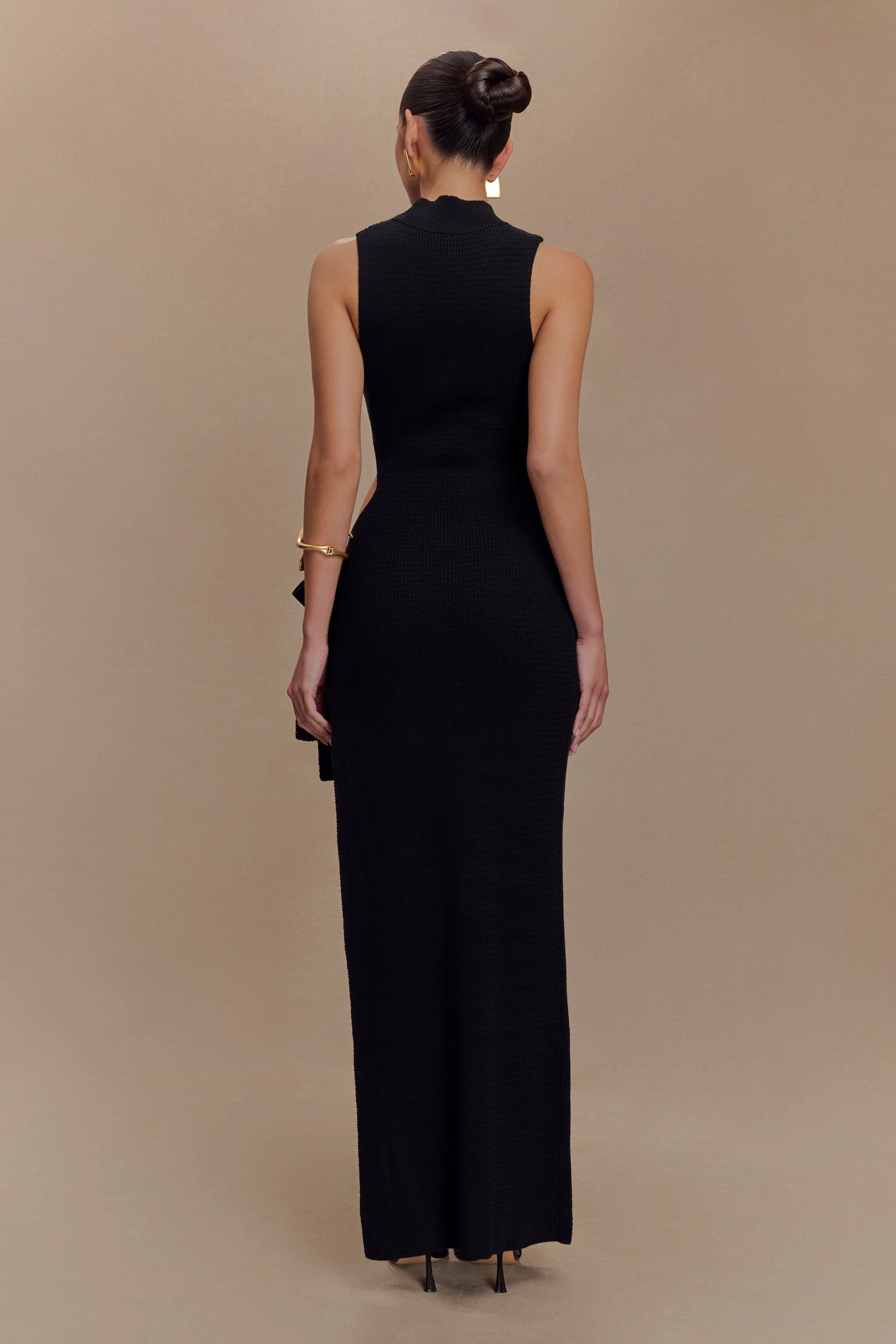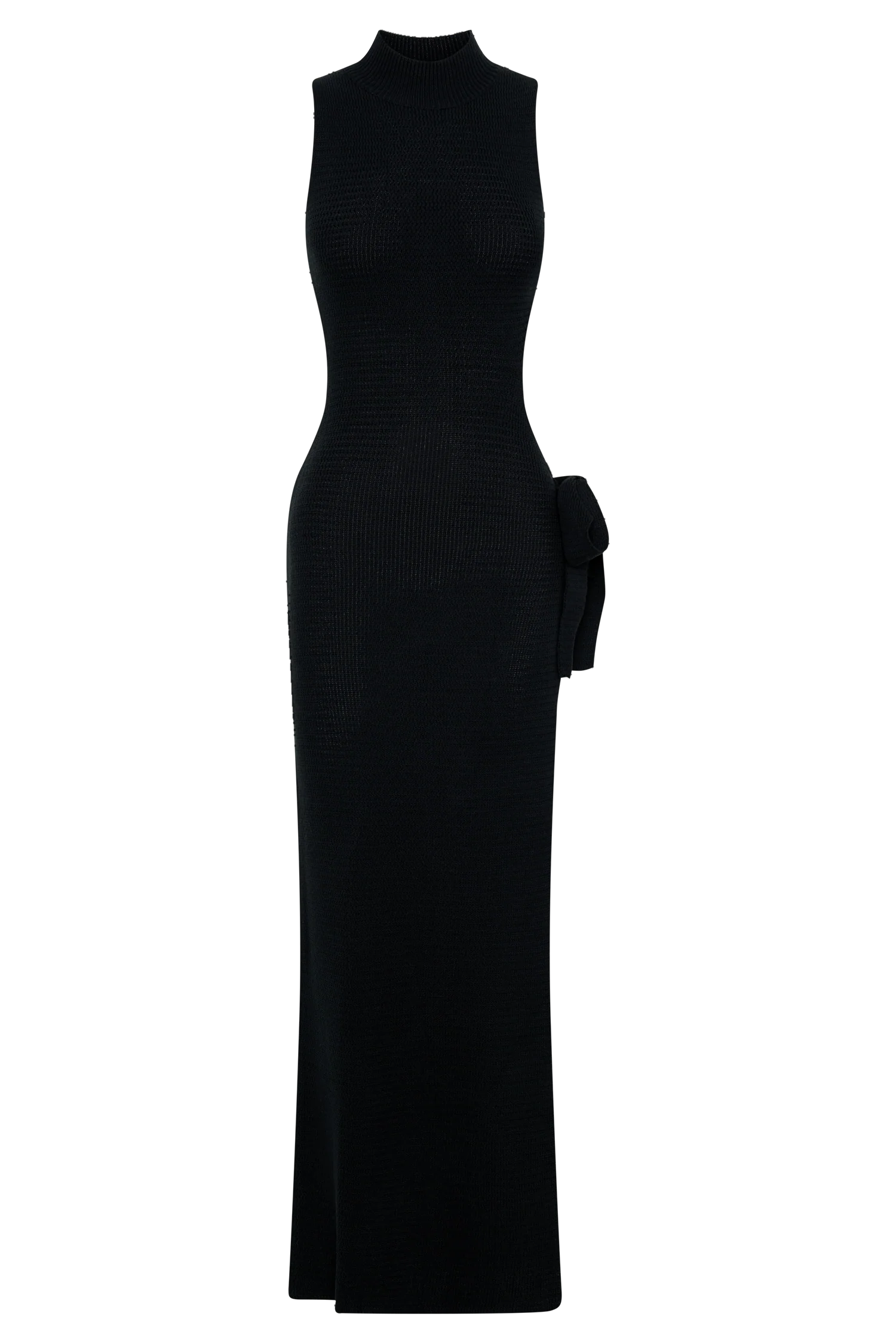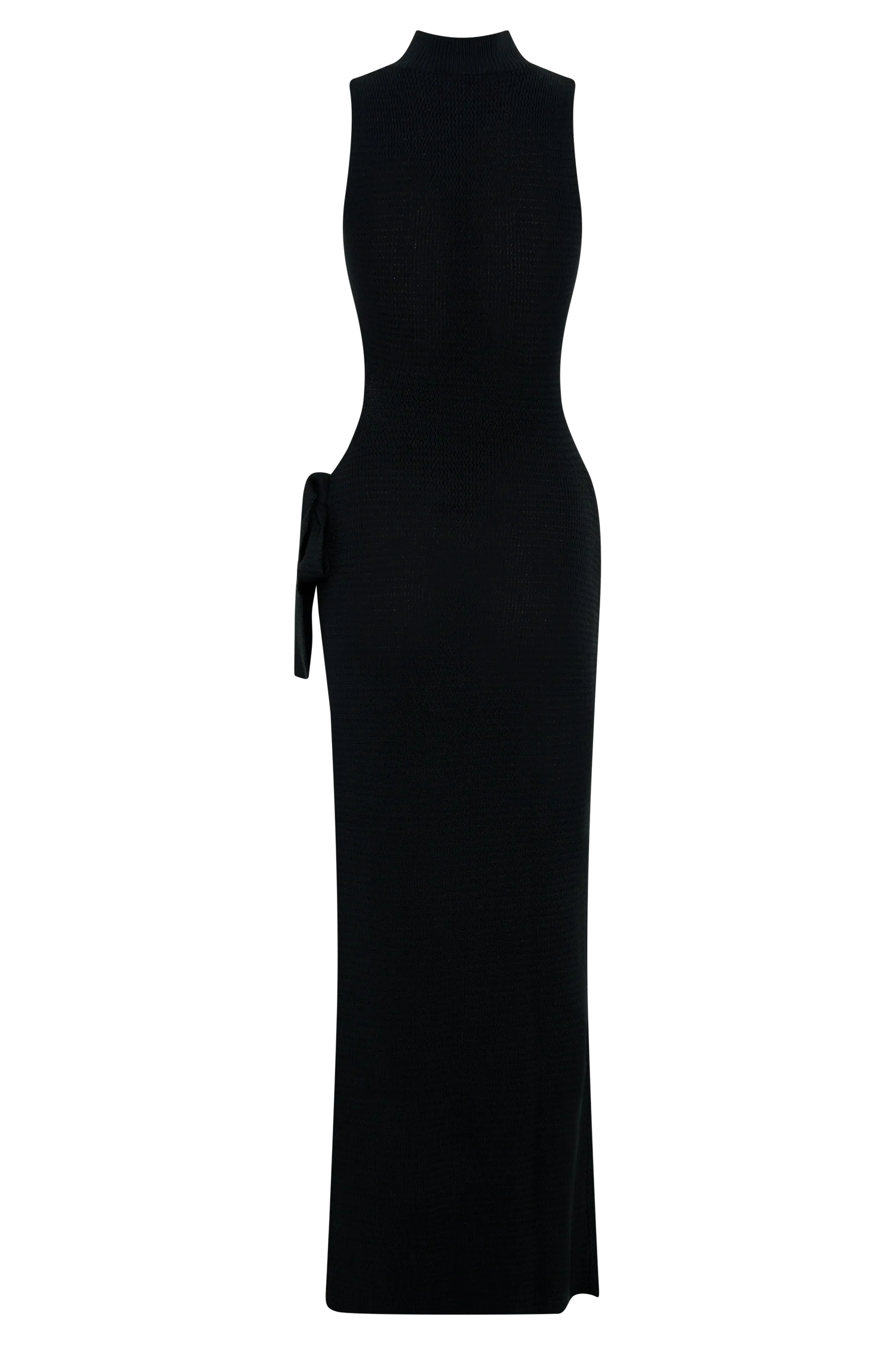 The STEPHANIE Cut Out Knit Maxi Dress is the epitome of modern elegance with a daring twist. Designed with a high cut neckline and sleeveless silhouette, this dress hugs your curves in a flattering bodycon fit. Crafted from a soft, stretch knit fabric, it offers a comfortable yet form-fitting shape. The side cutout detail adds a bold touch, while the delicate bow at the hip brings a hint of femininity. A side leg split enhances its allure, allowing for easy movement and a dramatic finish. With its maxi length, this unlined knit dress is perfect for an evening out or a special occasion.