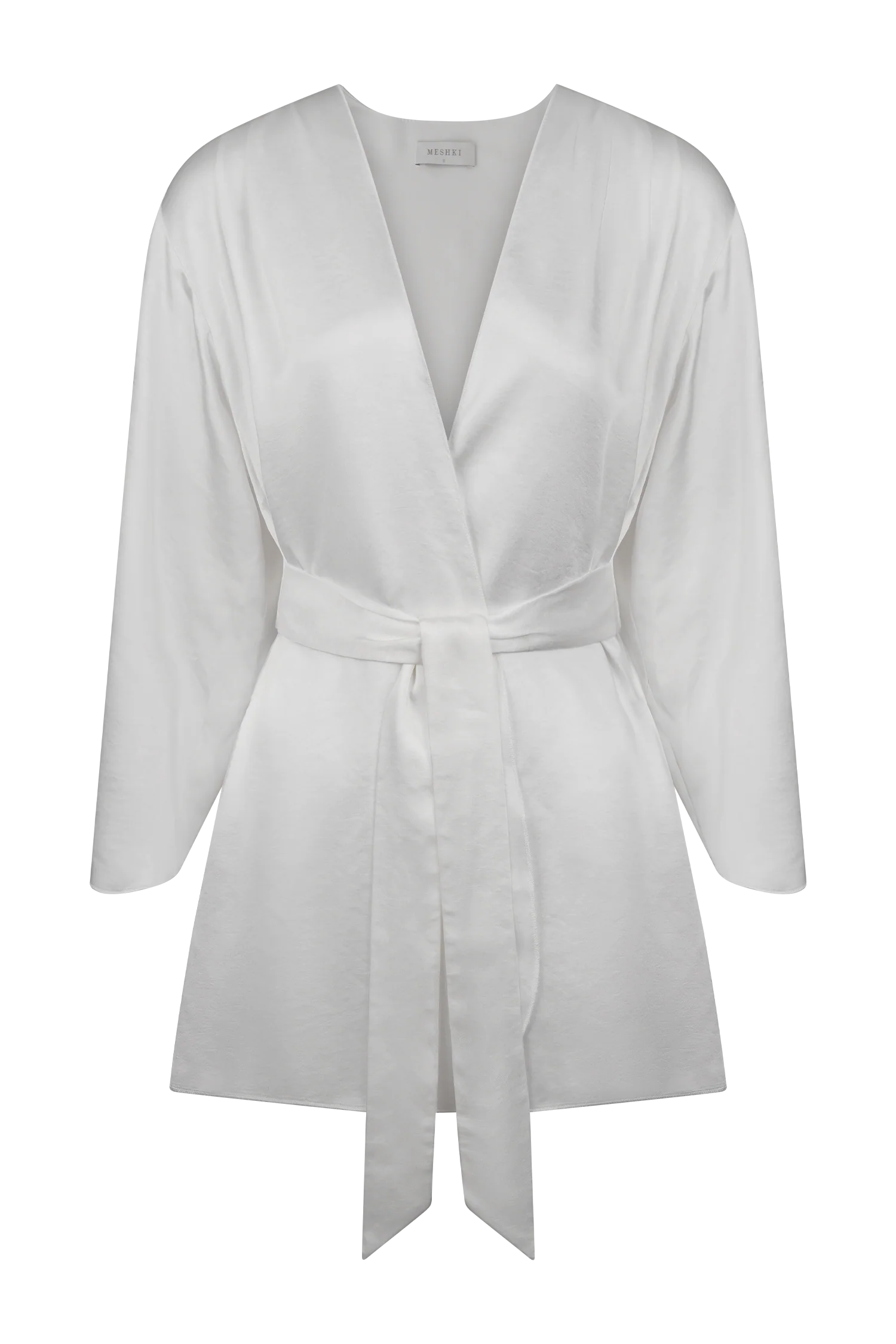 The STERLING Satin Bridal Robe is a timeless blend of sophistication and luxury. Designed with a soft V-neckline and a chic crossover front, this robe drapes beautifully over the body for an effortlessly refined look. The mid-length sleeves add a delicate touch, while the waist tie cinches for a flattering, adjustable fit. Crafted from lustrous satin and left unlined for a lightweight feel, this robe is the perfect bridal getting-ready piece, adding a touch of elegance to your most special moments.