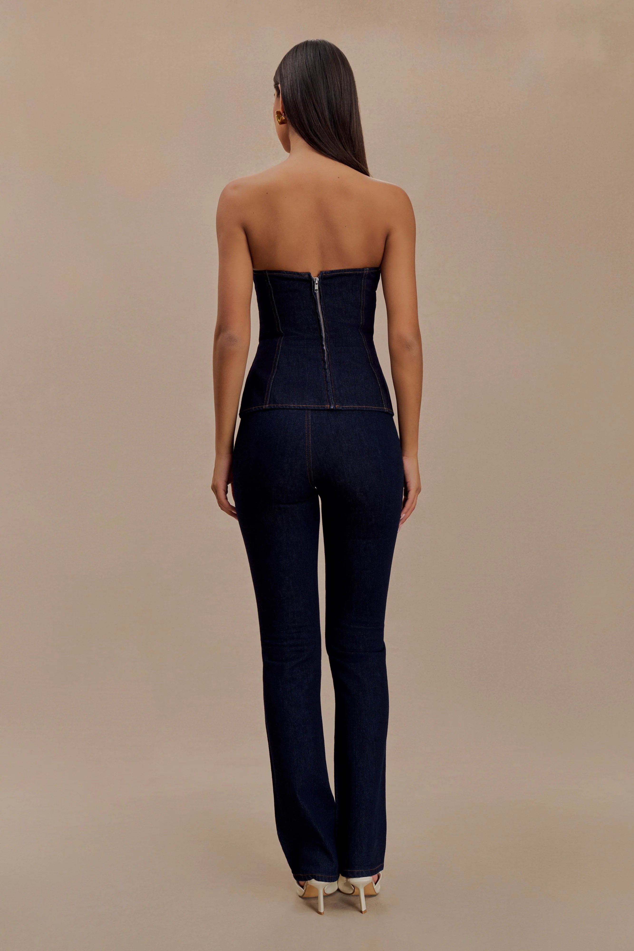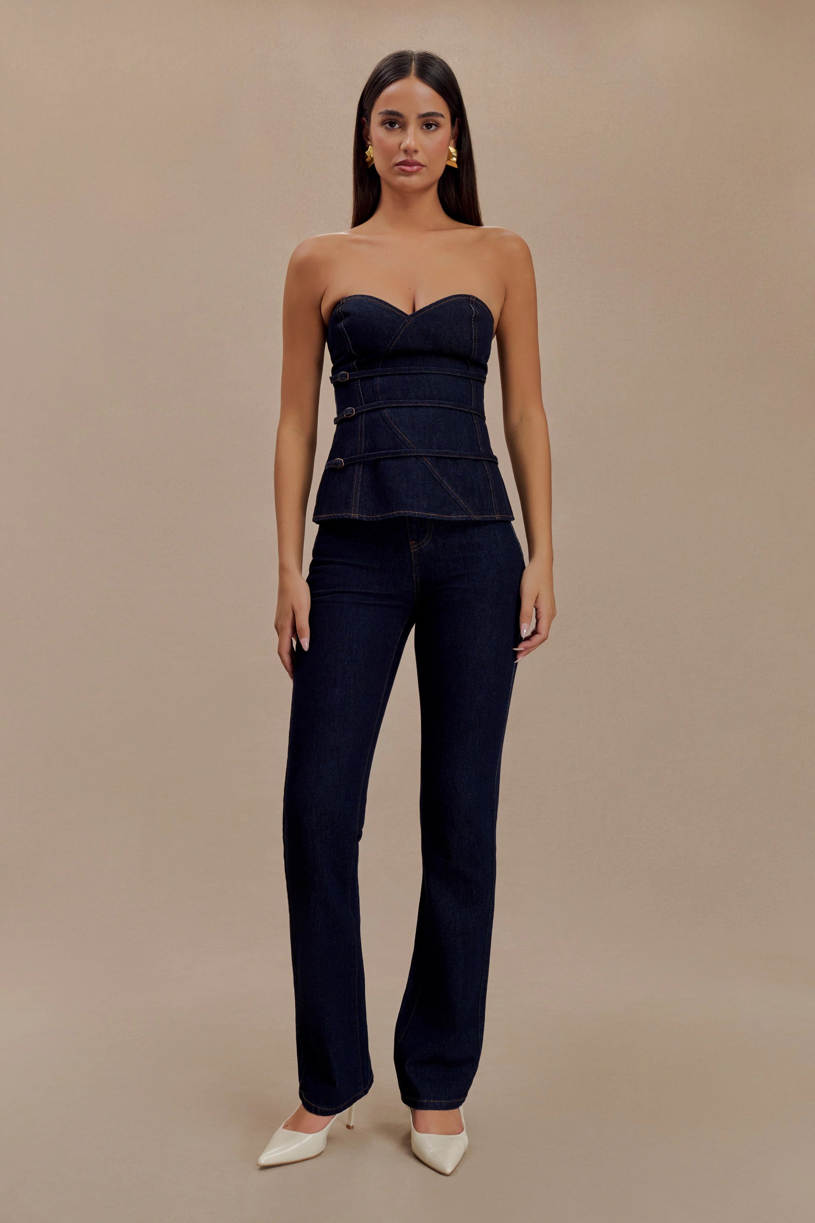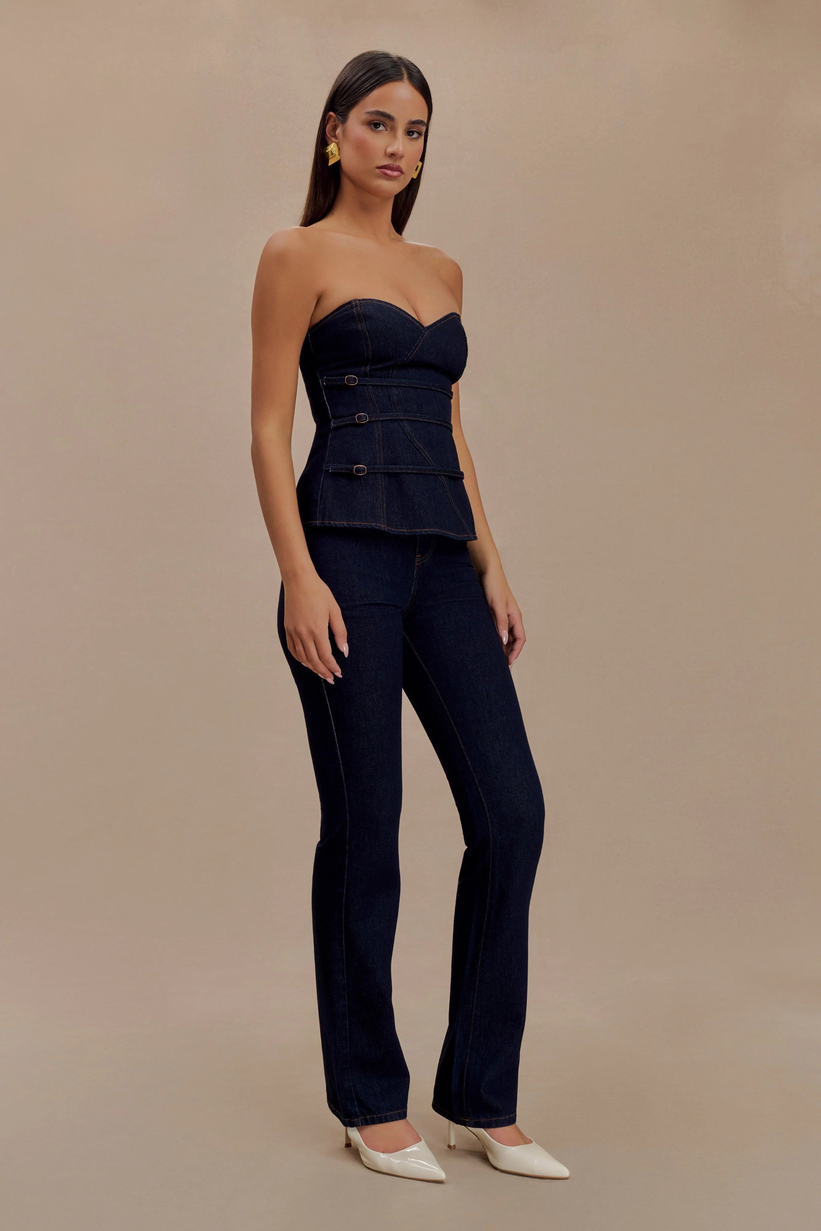 The SYLAS Strapless Buckle Denim Top combines modern structure with feminine charm. Featuring a princess neckline and statement belt detailing at the waist, this top highlights your silhouette with its fitted waist and peplum hem. The asymmetrical overlay panel adds an unexpected edge, creating a unique, fashion-forward look. Unlined for a lightweight feel, this top is perfect for elevating any wardrobe with its bold yet refined design.