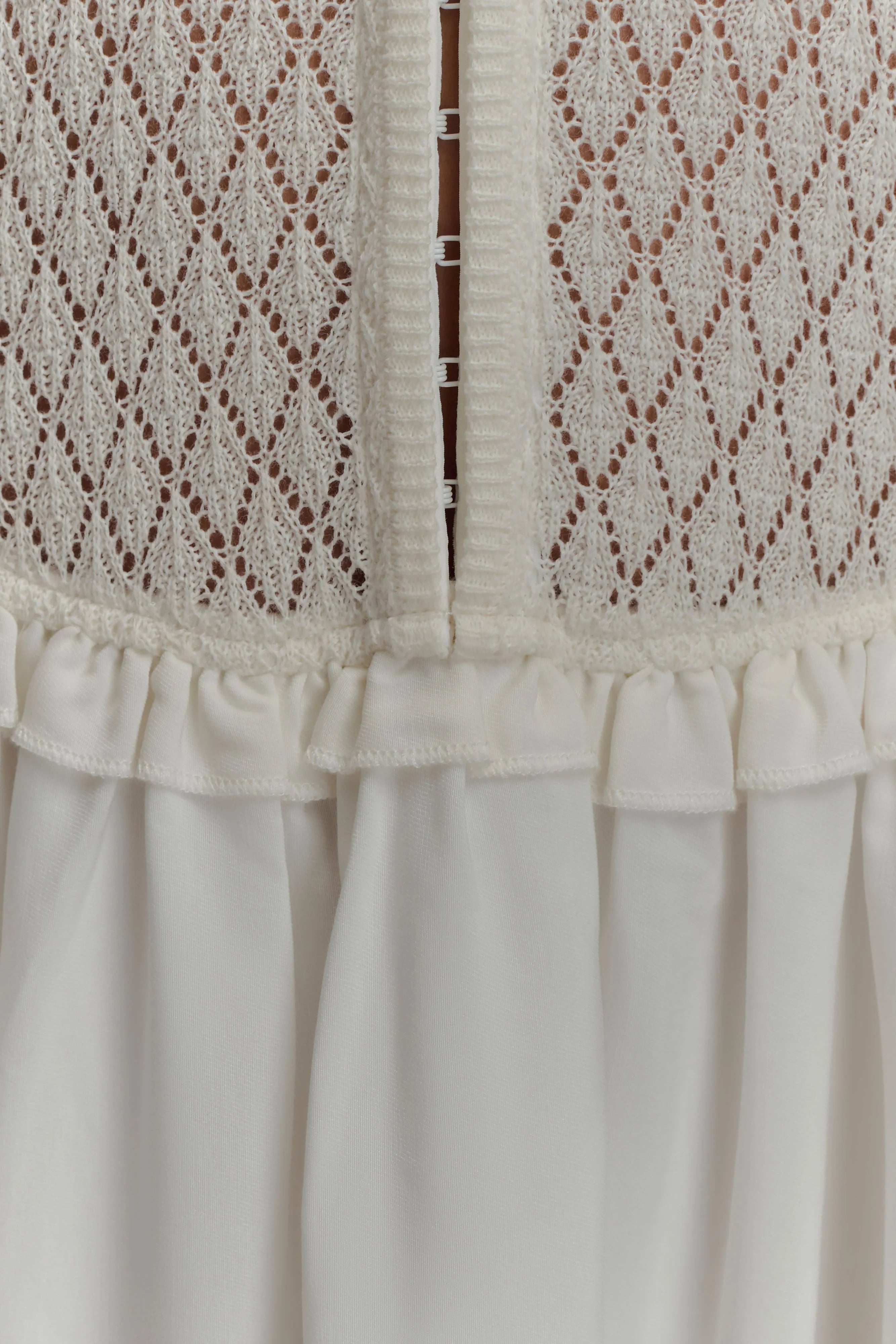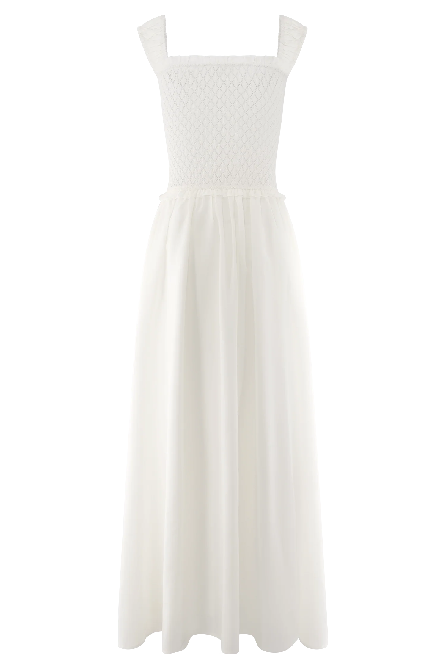 The TAHLIA Pointelle Knit Midi Dress is a delicate fusion of texture and romance. Designed with a flattering square neckline, this midi dress features elasticated cap sleeves and frill detailing along the neckline and waist seam for a soft, feminine touch. The knit bodice hugs the figure, while the low-waist A-line silhouette flows into a woven gathered skirt, creating graceful movement. A front hook-and-eye closure adds vintage charm, while the partially lined design ensures breathability and comfort. Perfect for sunlit days, special occasions, or effortless everyday elegance.