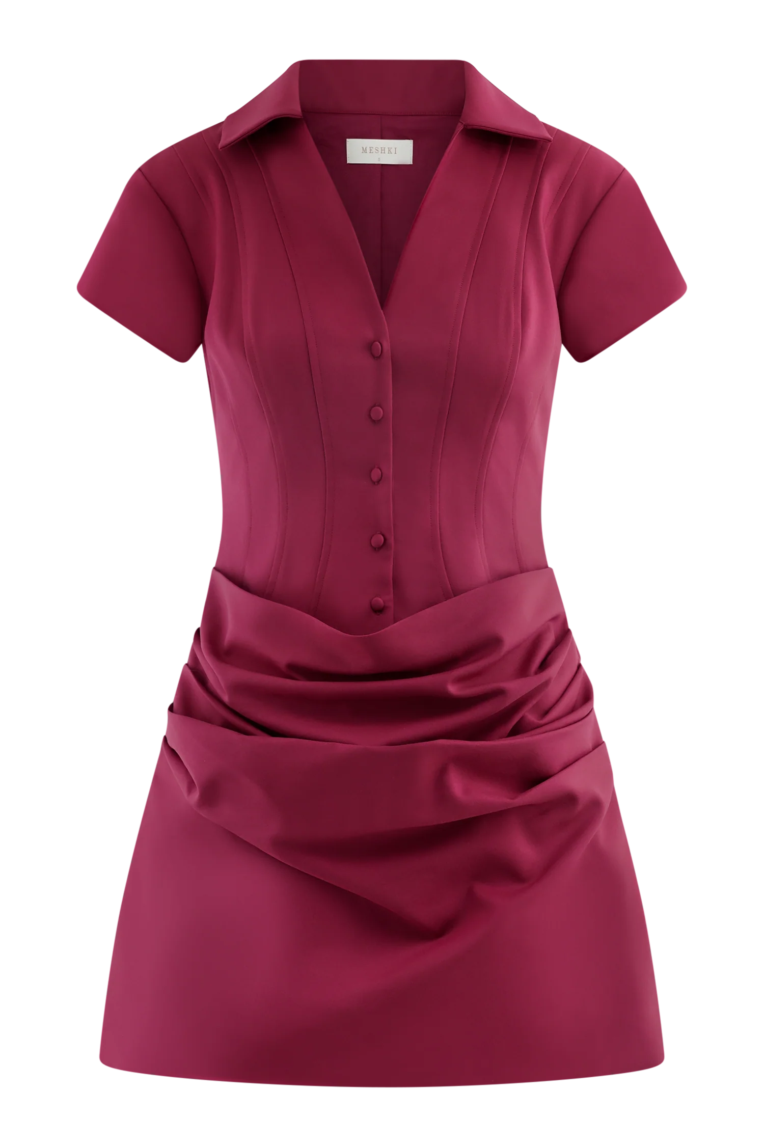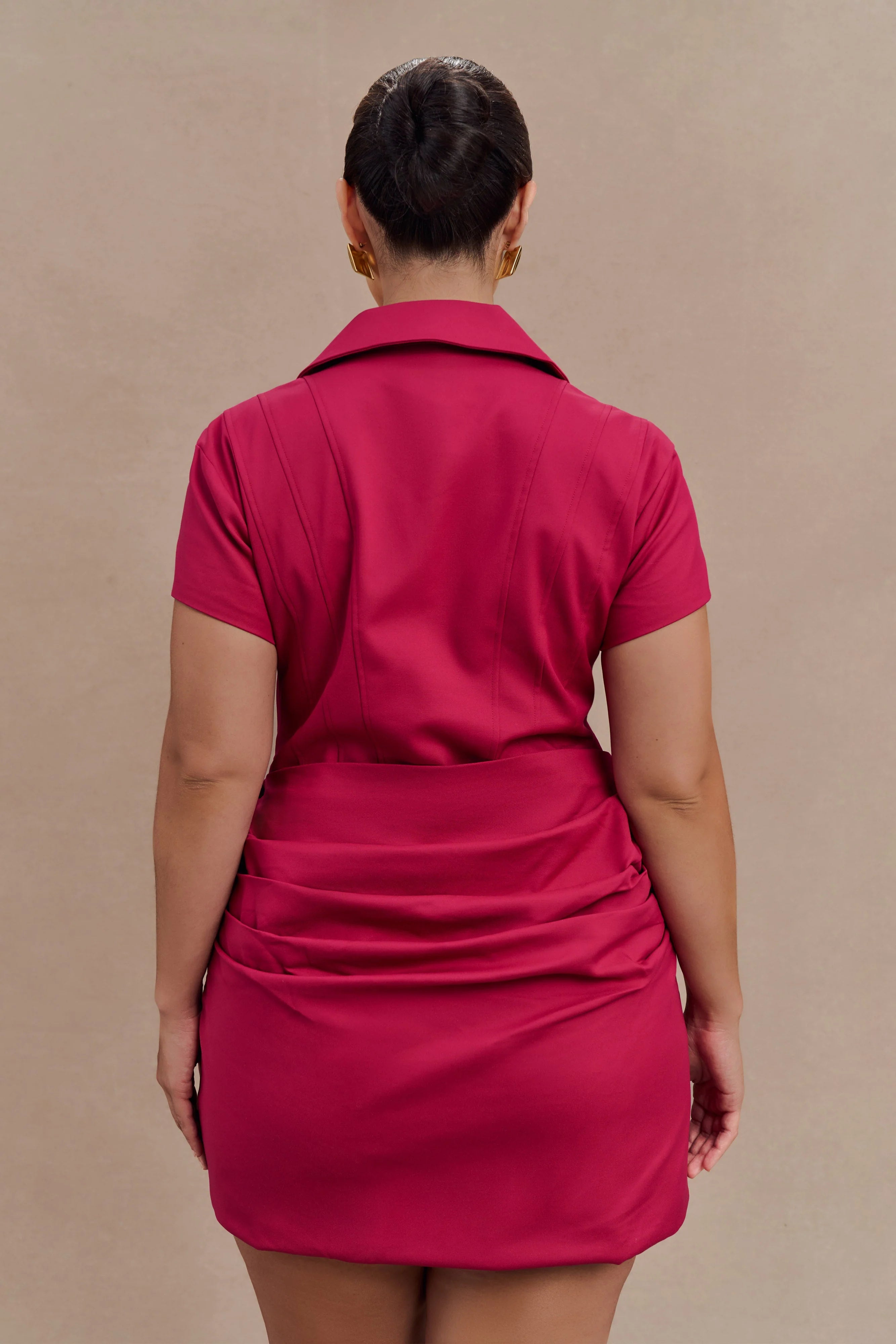 The TARRYN Collared Cotton Mini Dress blends classic shirting details with a feminine silhouette. Featuring a sharp collar and short sleeves, this mini dress is structured through the boned bodice for a sculpted fit, while the draped skirt overlay adds movement and softness. Fully lined for comfort and coverage, this dress is the perfect balance of tailored edge and effortless charm-ideal for daytime occasions or polished summer styling.