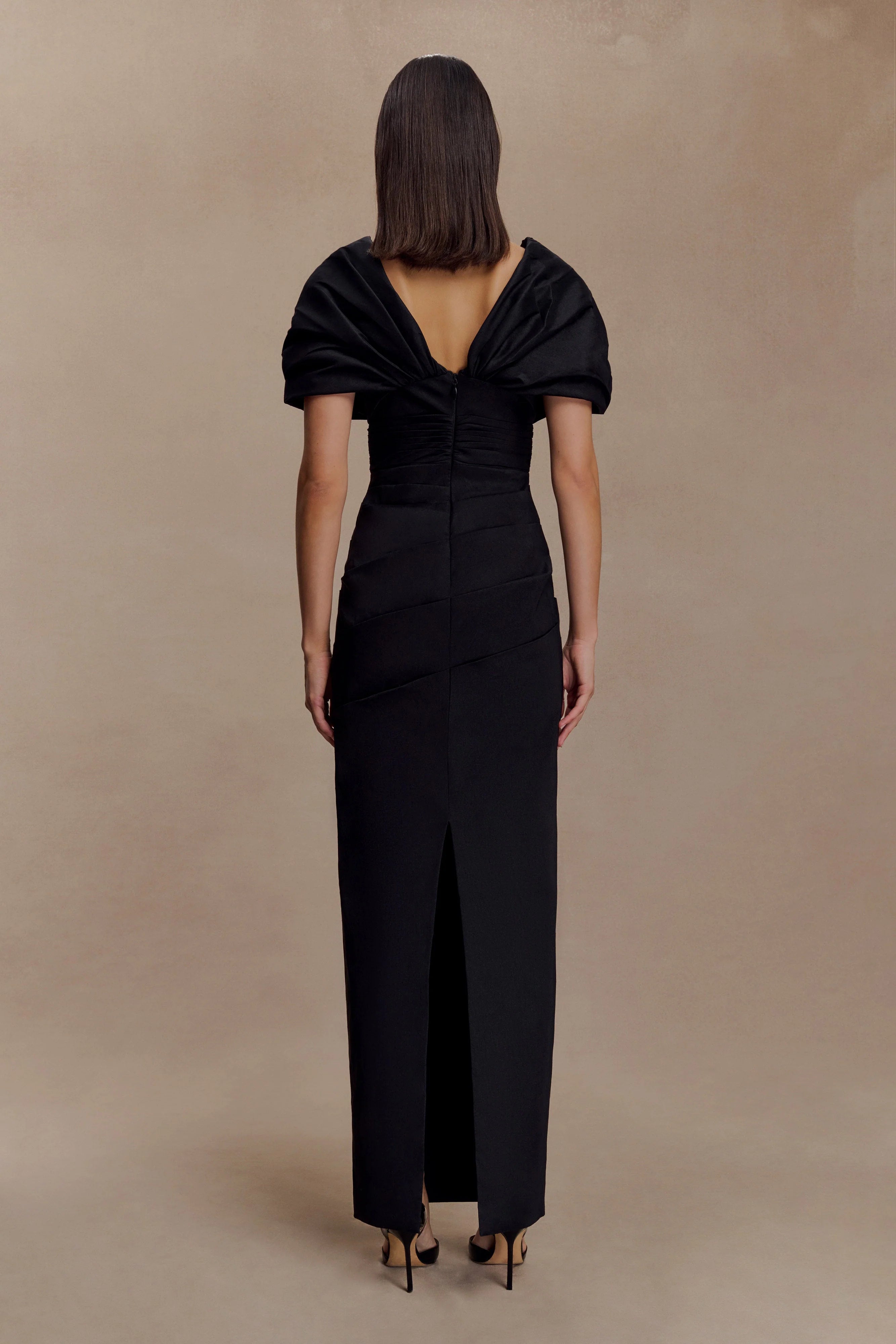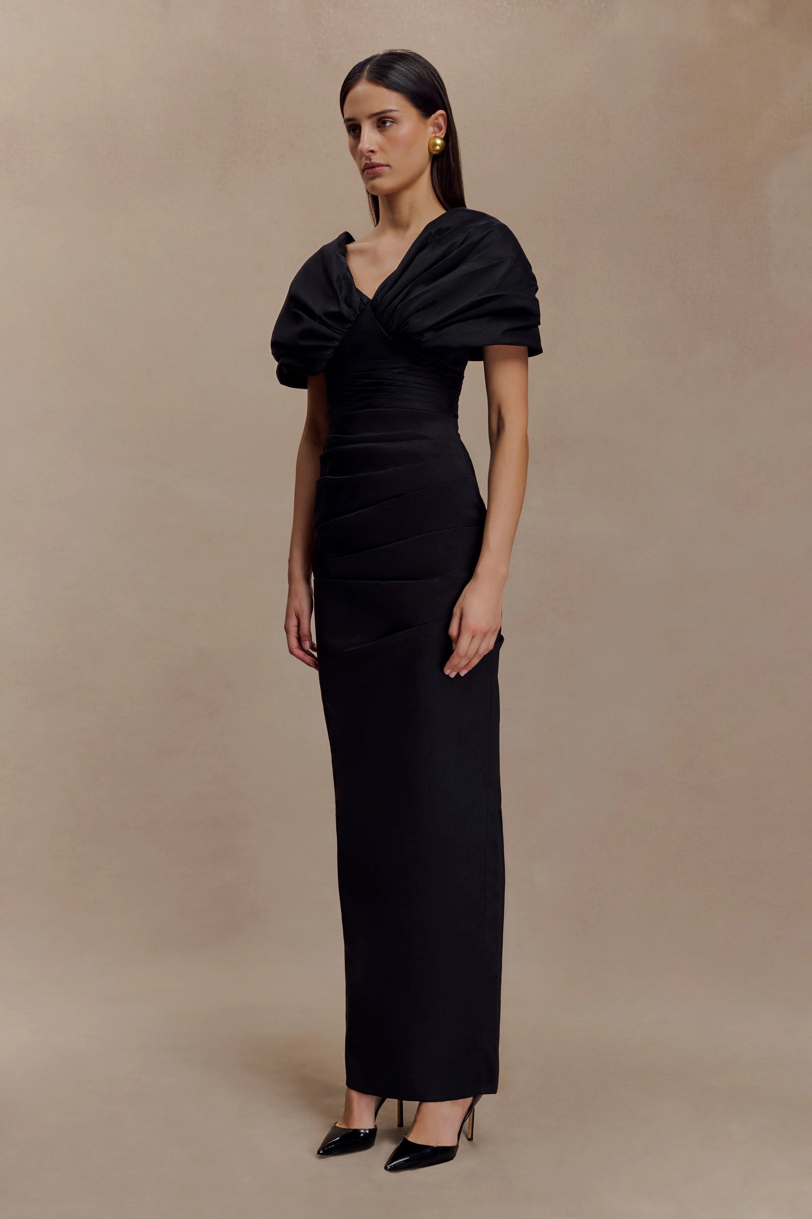 The THELMA Bardot Maxi Dress offers two equally striking ways to wear—gathered sleeves resting delicately on the shoulders for a refined finish, or draped off the shoulders for an alluring Bardot silhouette. Designed with a flattering V-neckline, pleating across the body, and a relaxed pencil-shaped fit, this dress flows to a maxi length for an elongating effect. Internal bust cups, a secure waist stay, and an invisible centre back zip ensure a supportive fit, while internal snaps and a chain loop make its multi-way styling effortless. Fully lined for comfort, this dress is a sophisticated choice for both classic and contemporary moments.