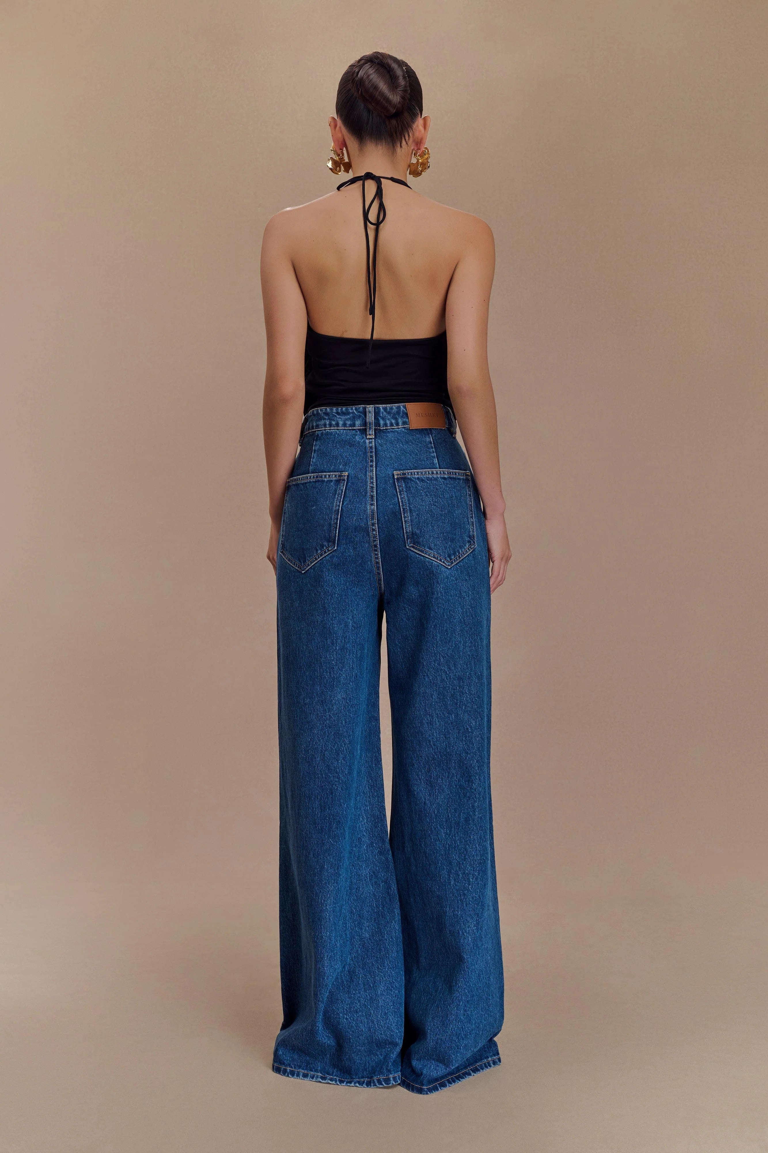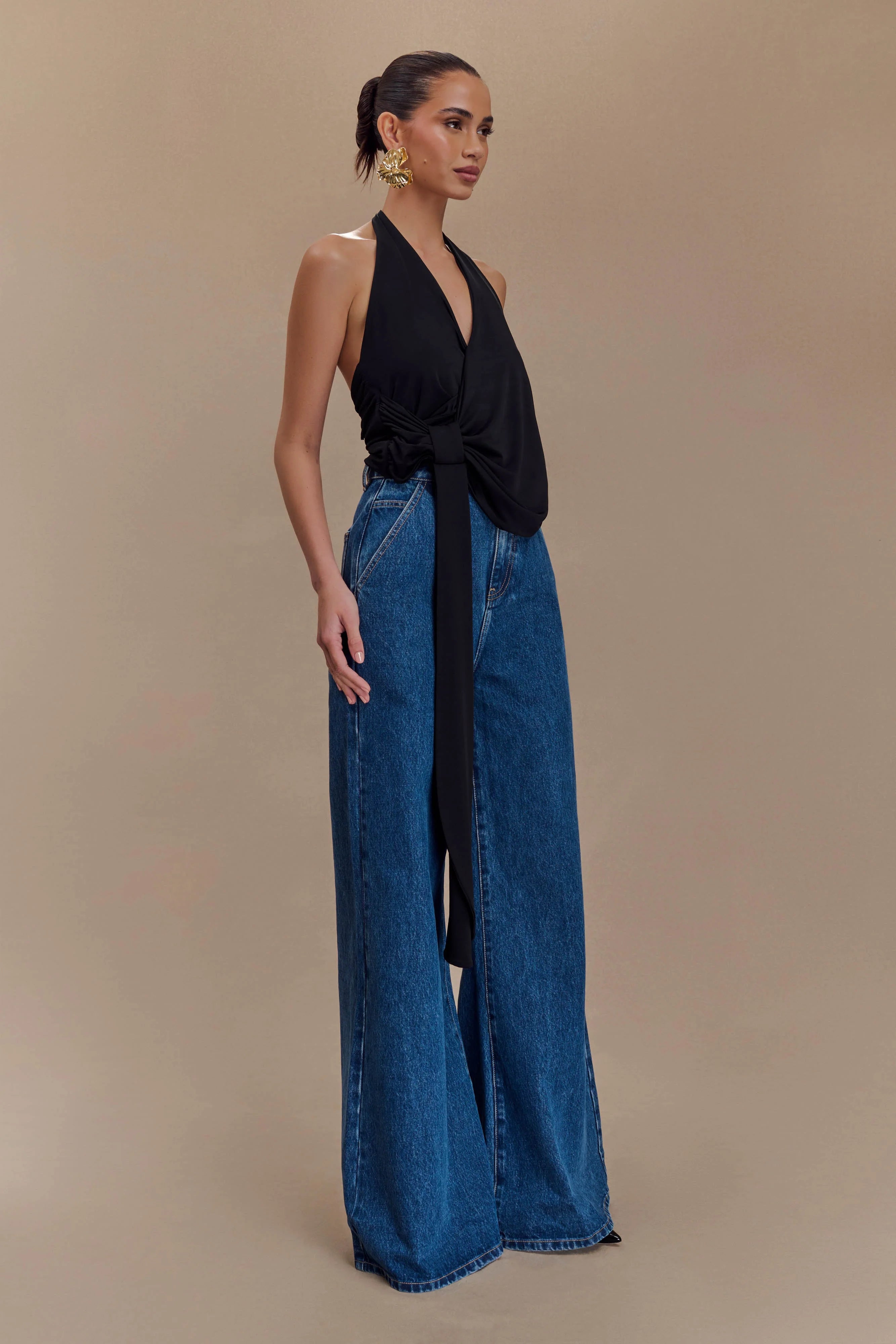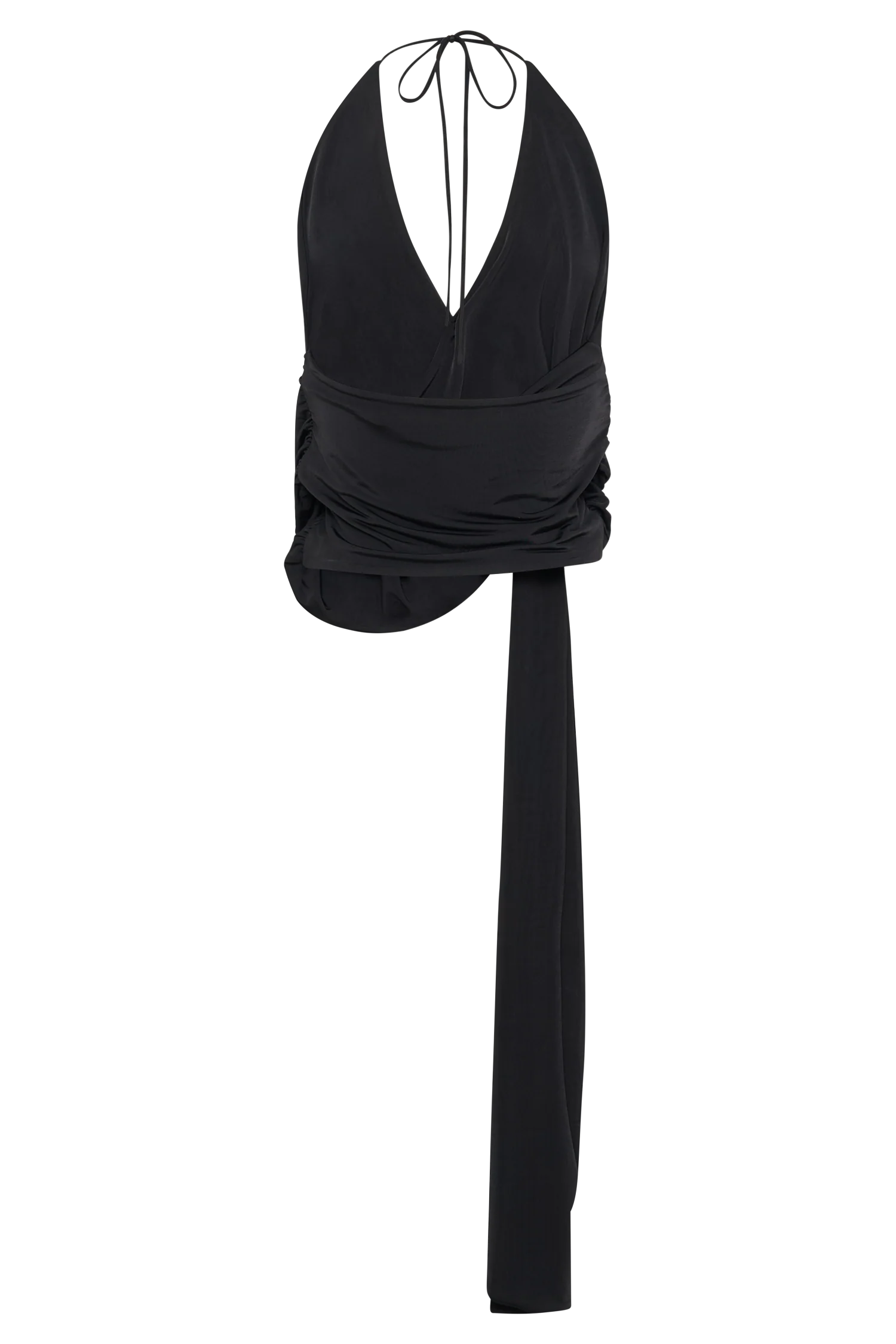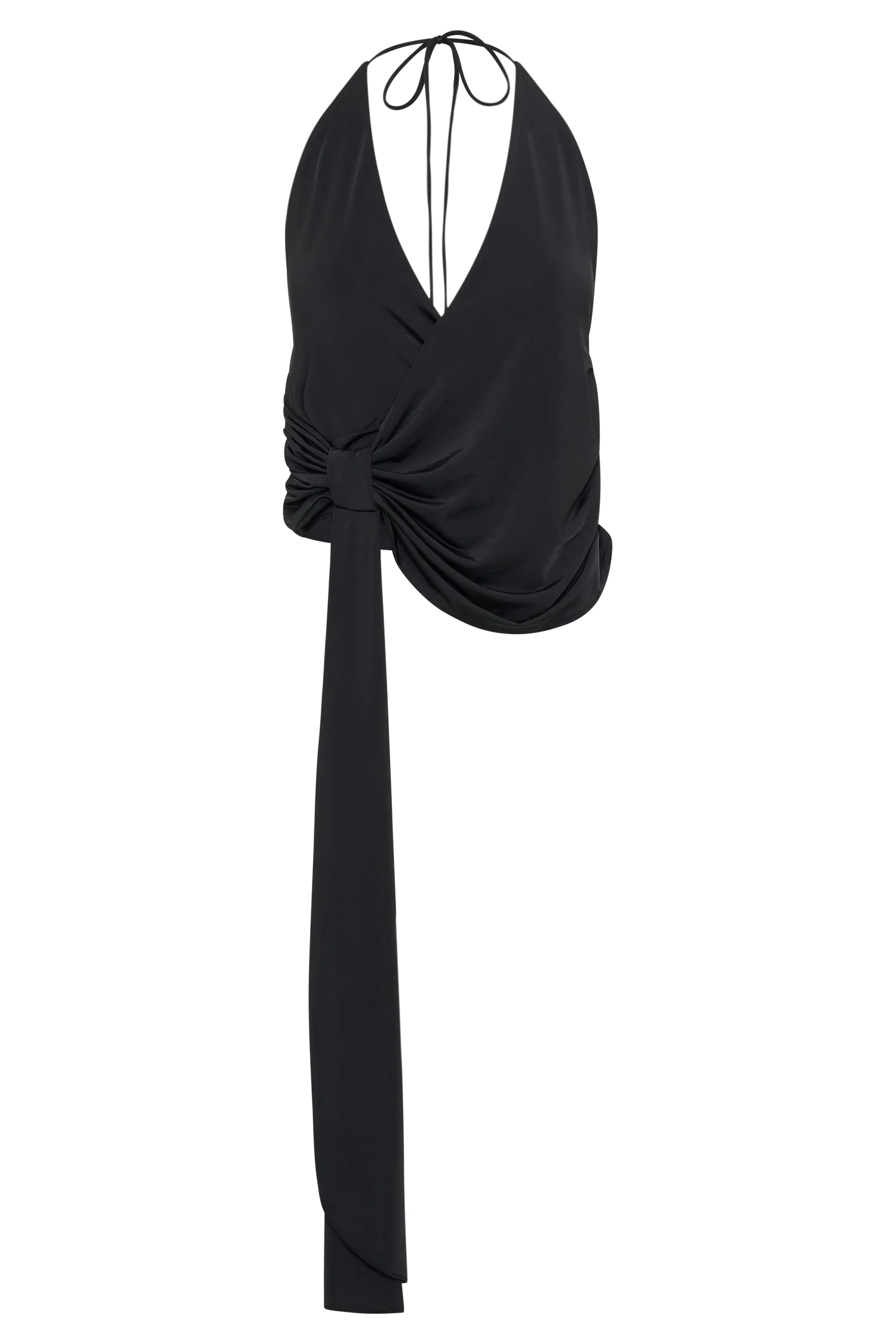 The TYLA Draped Slinky Halter Top features a sophisticated halter neckline and a flattering V front. Its draped bodice adds an elegant touch, while the tie detail at the hip provides a chic accent. Crafted from a stretch fabric, this top ensures a comfortable fit. Perfect for pairing with tailored trousers for a stylish and elegant evening look.