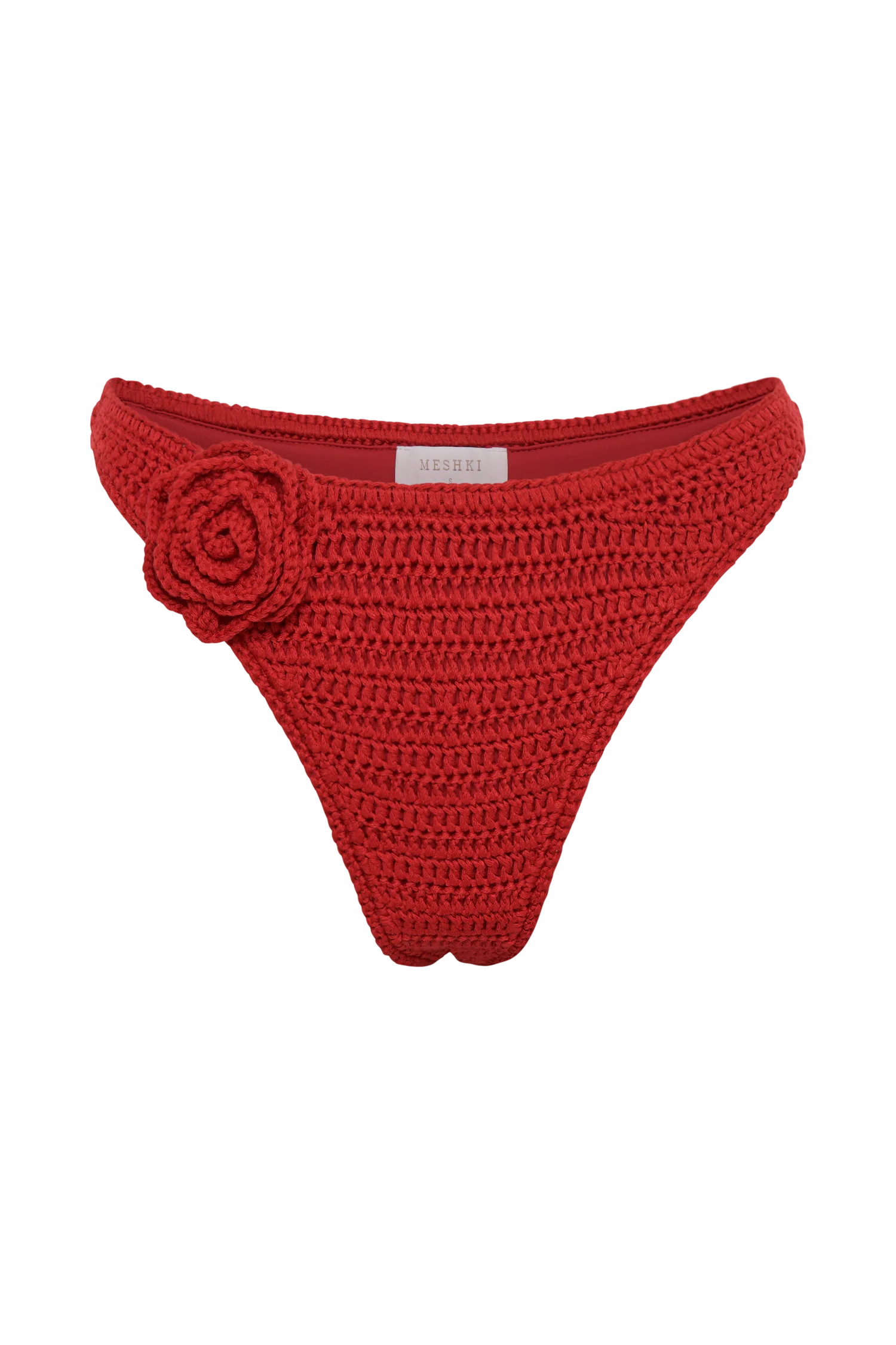 The VALENCIA is a low-rise bikini bottom with a rose flower applique and high-leg cut. Its custom crochet fabrication is stretchy and lined for comfortable all-day wear. It offers modest coverage while hugging curves to further flatter your silhouette. The rose flower applique at the right-hand side adds a fresh twist on the classic bikini bottom cut. Pair with the to complete the set.