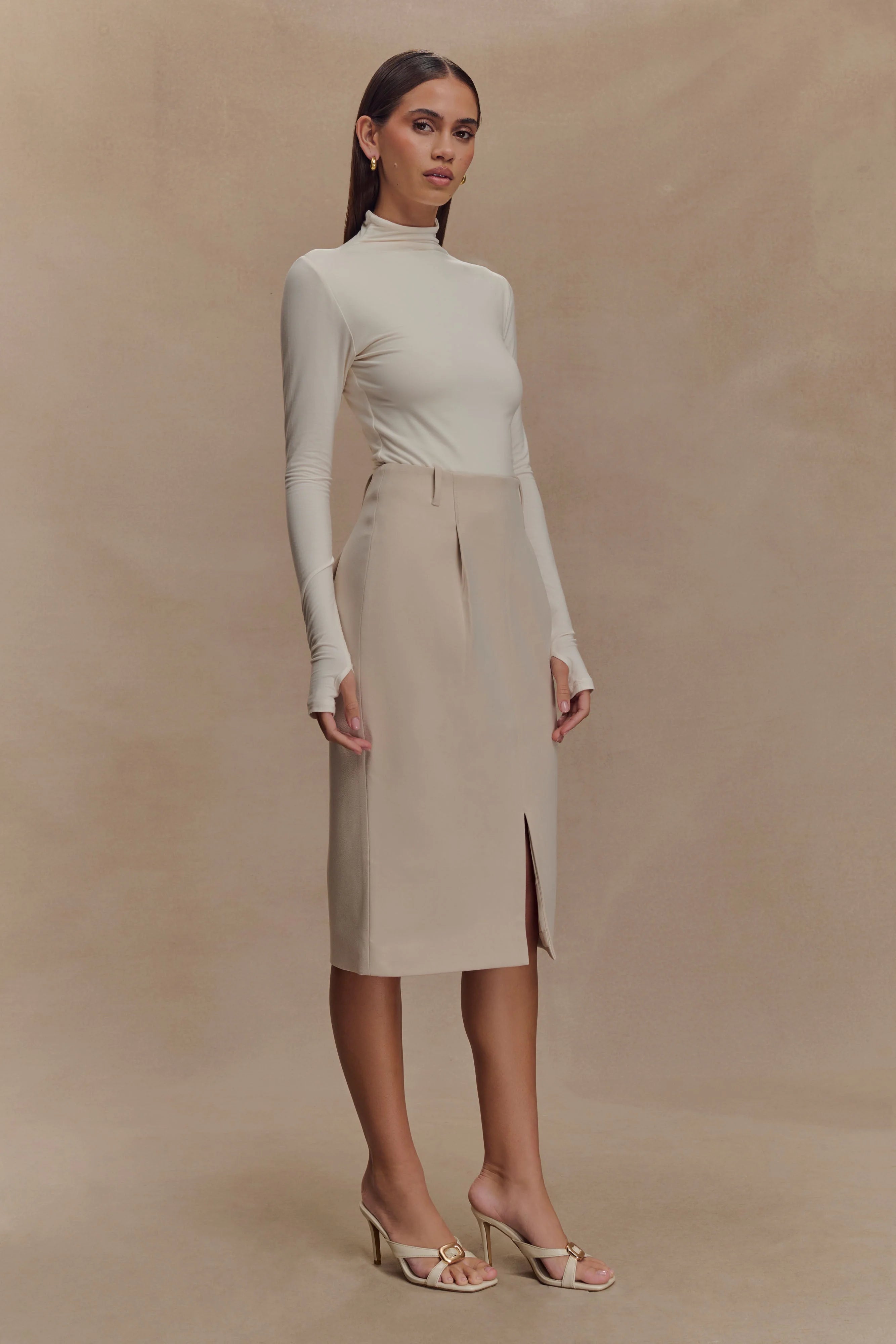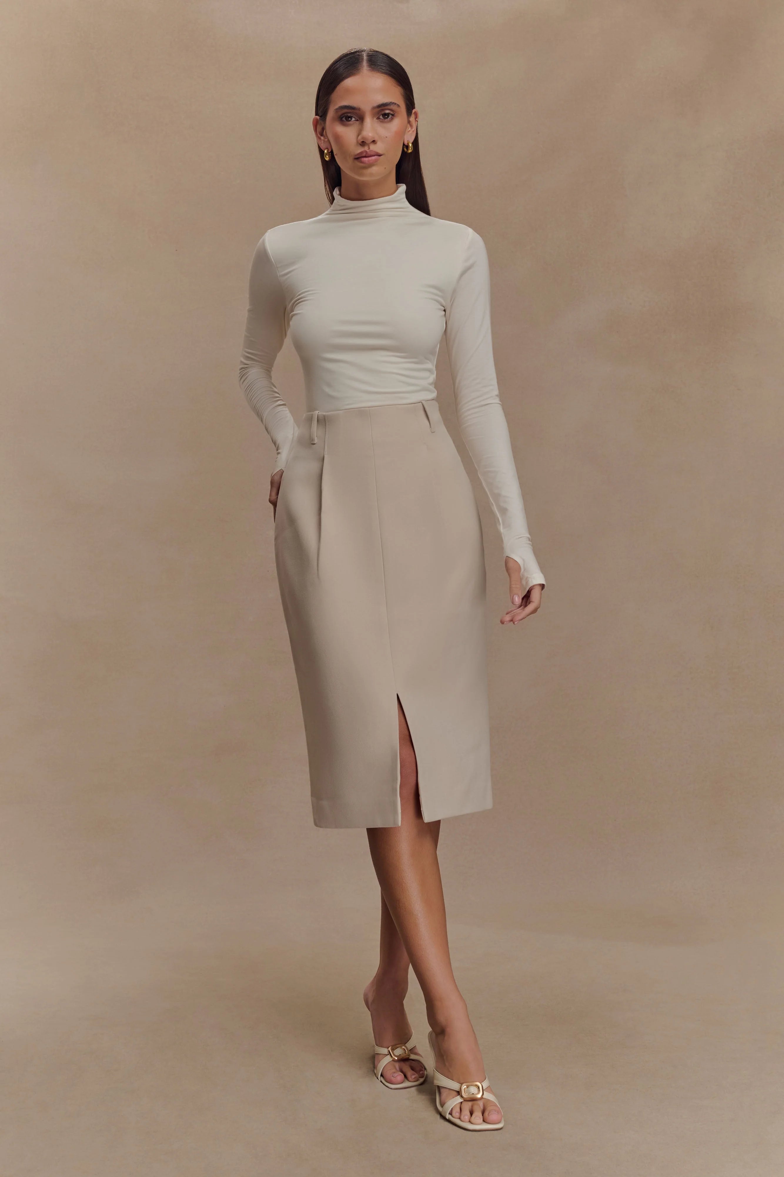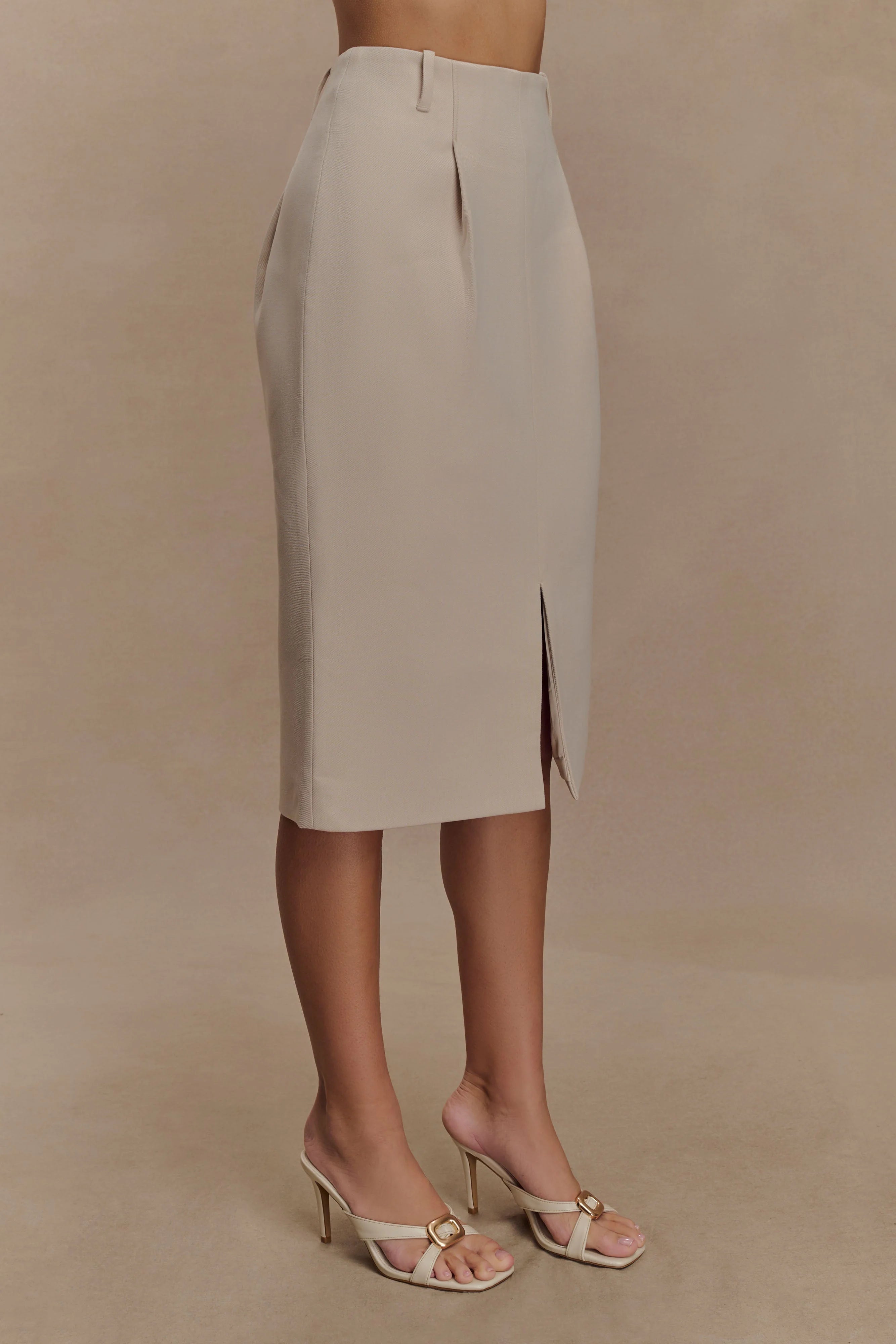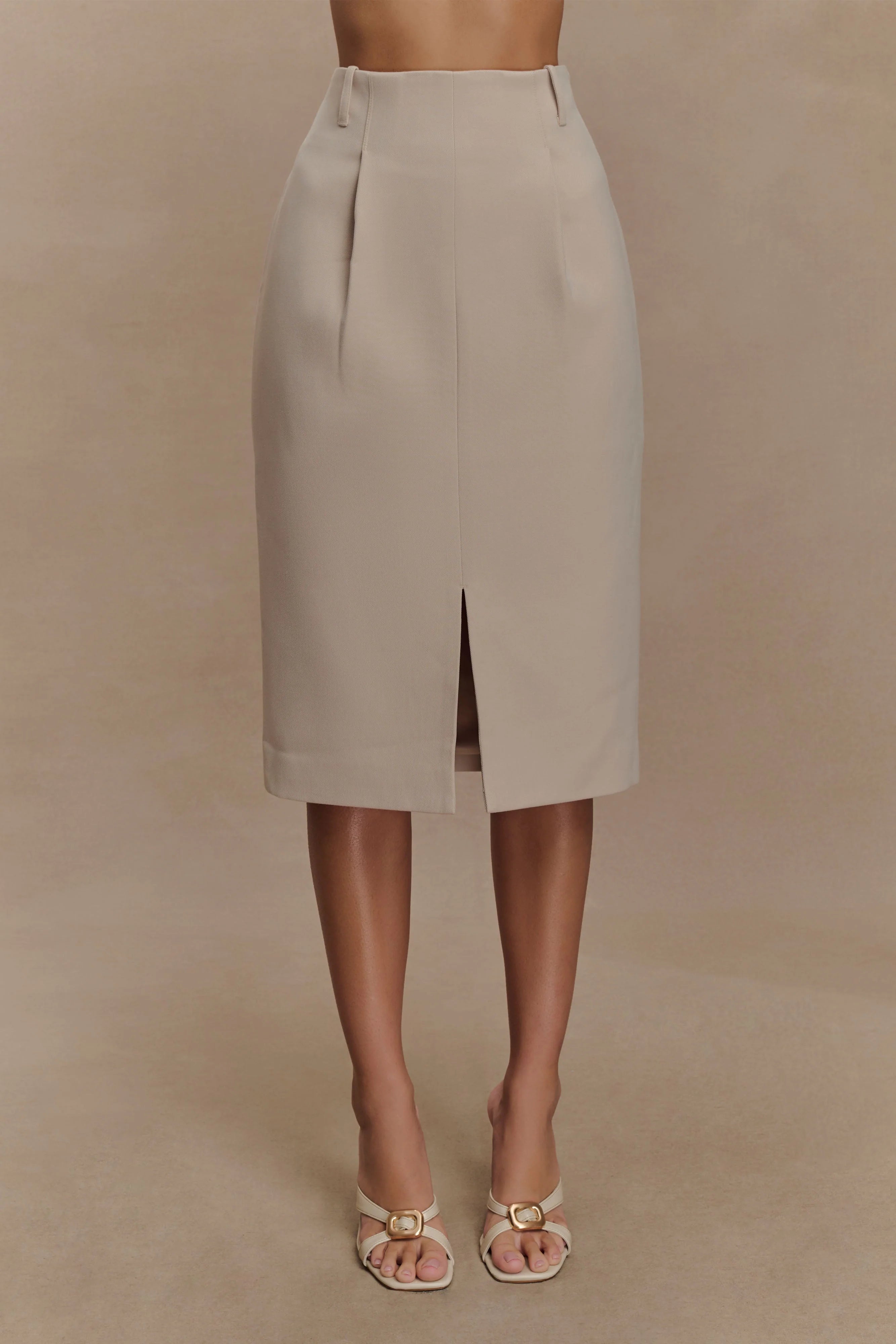 The VERA Suiting Split Front Midi Skirt is your modern take on classic tailoring. Designed with a high-waisted fit, this midi-length skirt features front and back pleats that create soft structure and movement. A centre front seam leads into a subtle split at the hem, adding ease and a touch of allure. Finished with belt loops, side pockets, and an invisible side zip for a clean silhouette, this skirt brings elevated polish to your everyday rotation.