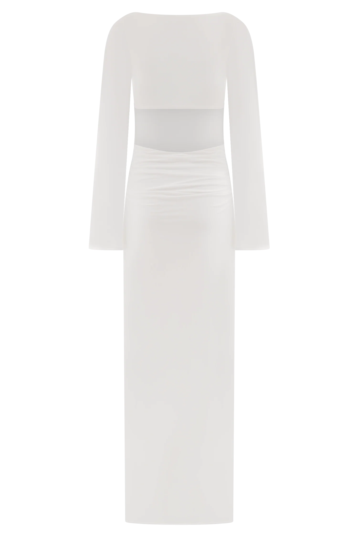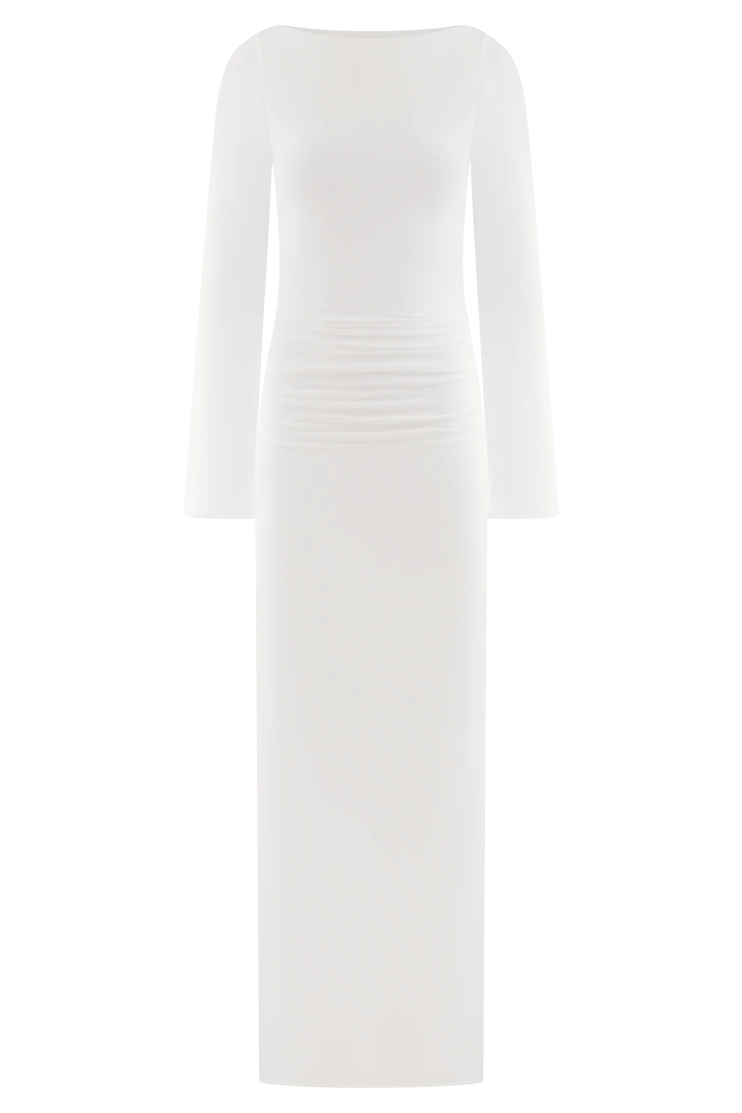 The VIENNA Slinky Cut Out Maxi Dress is the epitome of refined seduction. Designed with a sleek boat neckline and striking open back, this silhouette balances elegance with allure. Long sleeves and a gathered waist flatter the figure, while the straight skirt shape and maxi length create a streamlined finish. Fully lined for a smooth fit, this dress is your statement piece for evening elegance with a modern edge.