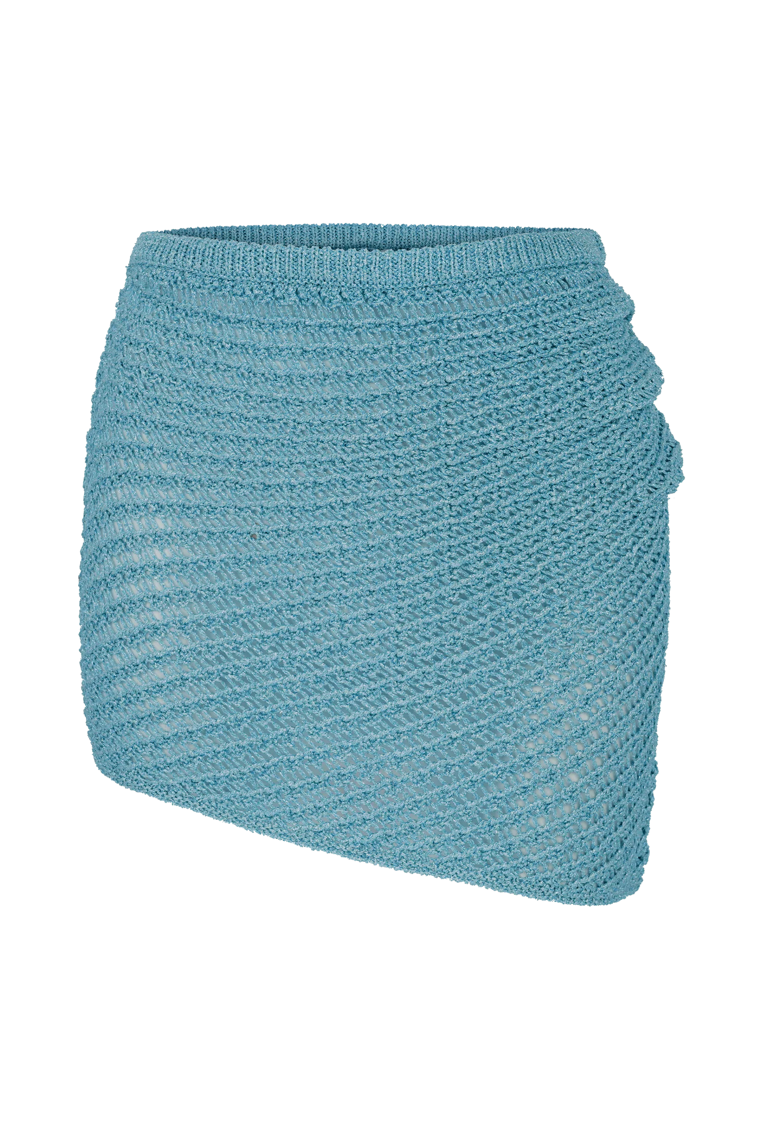 The WAVERLEY Metallic Knit Mini Skirt brings playful polish to warm-weather dressing. Crafted in a shimmering metallic crochet knit, this mini features a mid-rise waistline with an asymmetrical cut that contours the waist. Gathered detailing at the hip adds texture and shape, while the mini length keeps the look fresh and effortless.