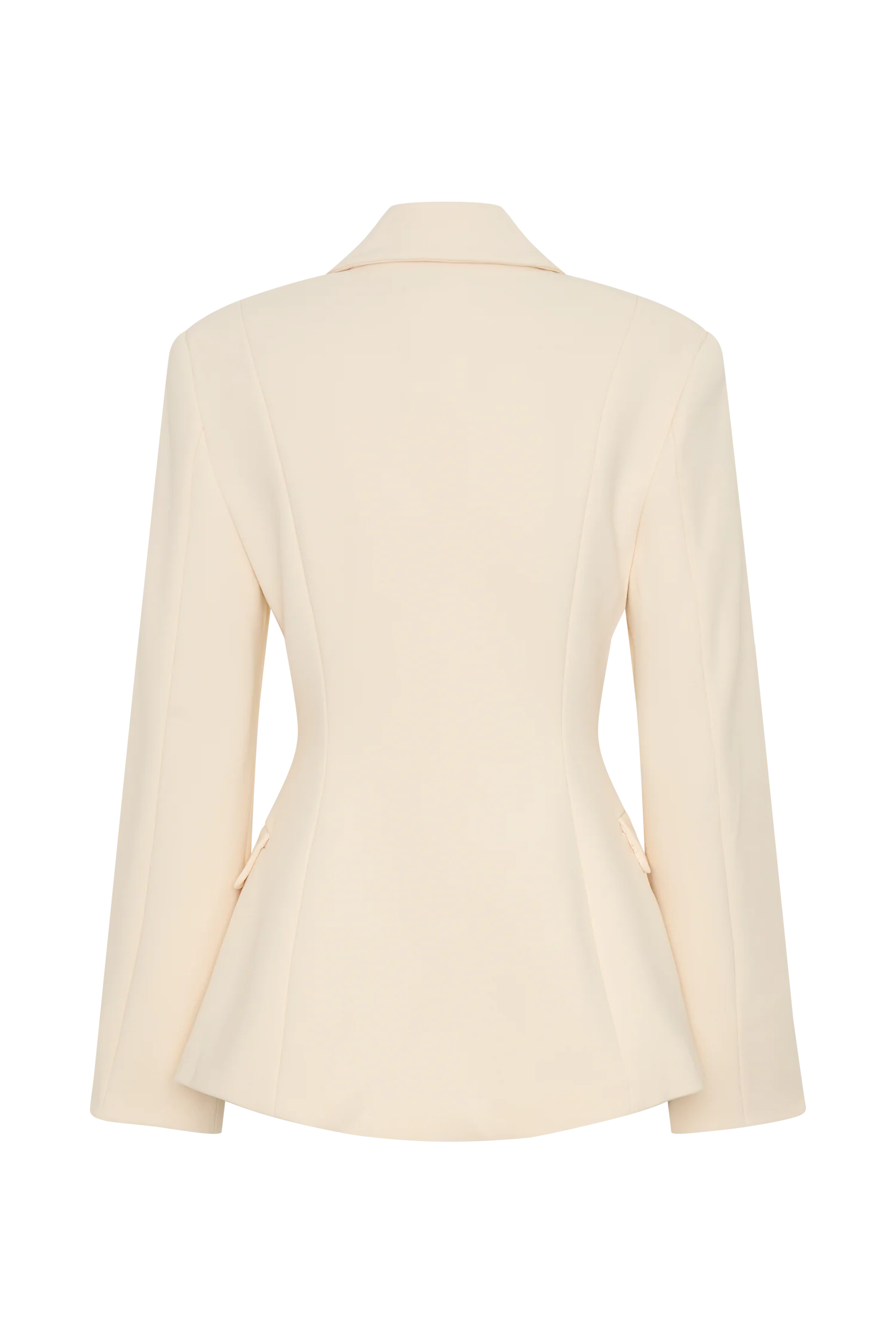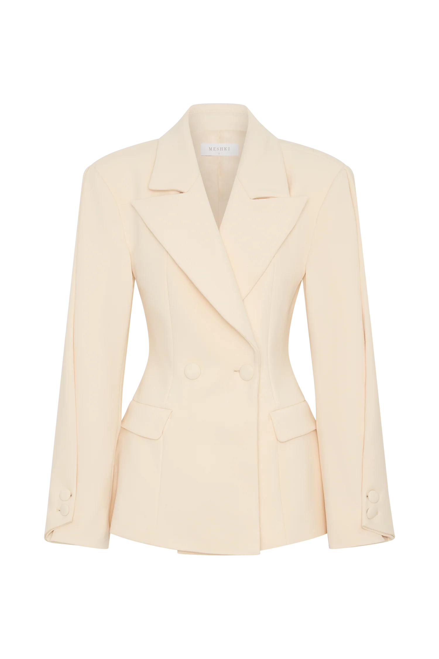 The WESLEY Structured Blazer redefines suiting with sharp detail and directional design. Featuring a double-peaked wide collar and a double-breasted button front, it’s balanced by structured shoulder pads and a fitted waist for a sculpted silhouette. Drop shoulders add ease, while long sleeves with pleated crossover cuffs bring versatility—wear buttoned for polish or unfastened for a wider sleeve shape. Functional flap pockets, a longline cut, and full lining complete this blazer, making it a statement layer for both day and evening dressing.